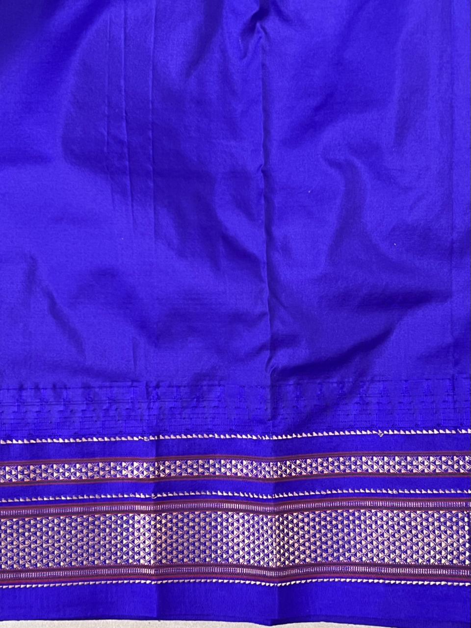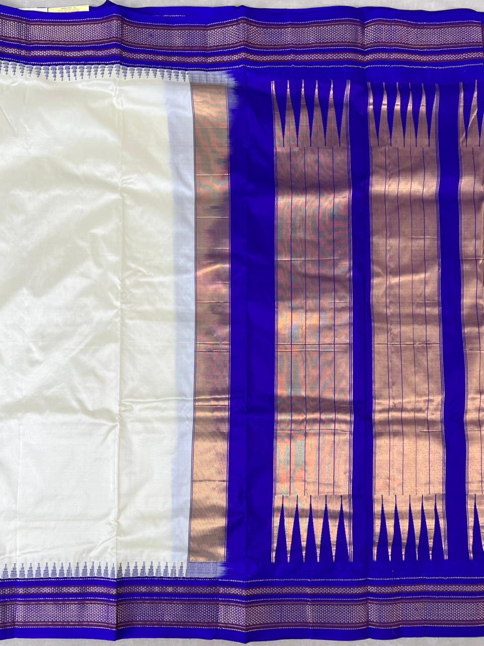 This elegant Narayanpet Pure Silk Handloom Saree features a Off White body, reflecting timeless handloom artistry. The saree is highlighted by a striking Navy Blue border, intricately crafted with traditional gold zari geometric and temple-inspired designs, adding a regal finish. Lightweight, lustrous, and graceful, this saree is perfect for festive occasions, weddings, poojas, and traditional celebrations, making it a classic addition to any silk saree collection, This saree comes with Contrast blouse and it is Silk mark certified.