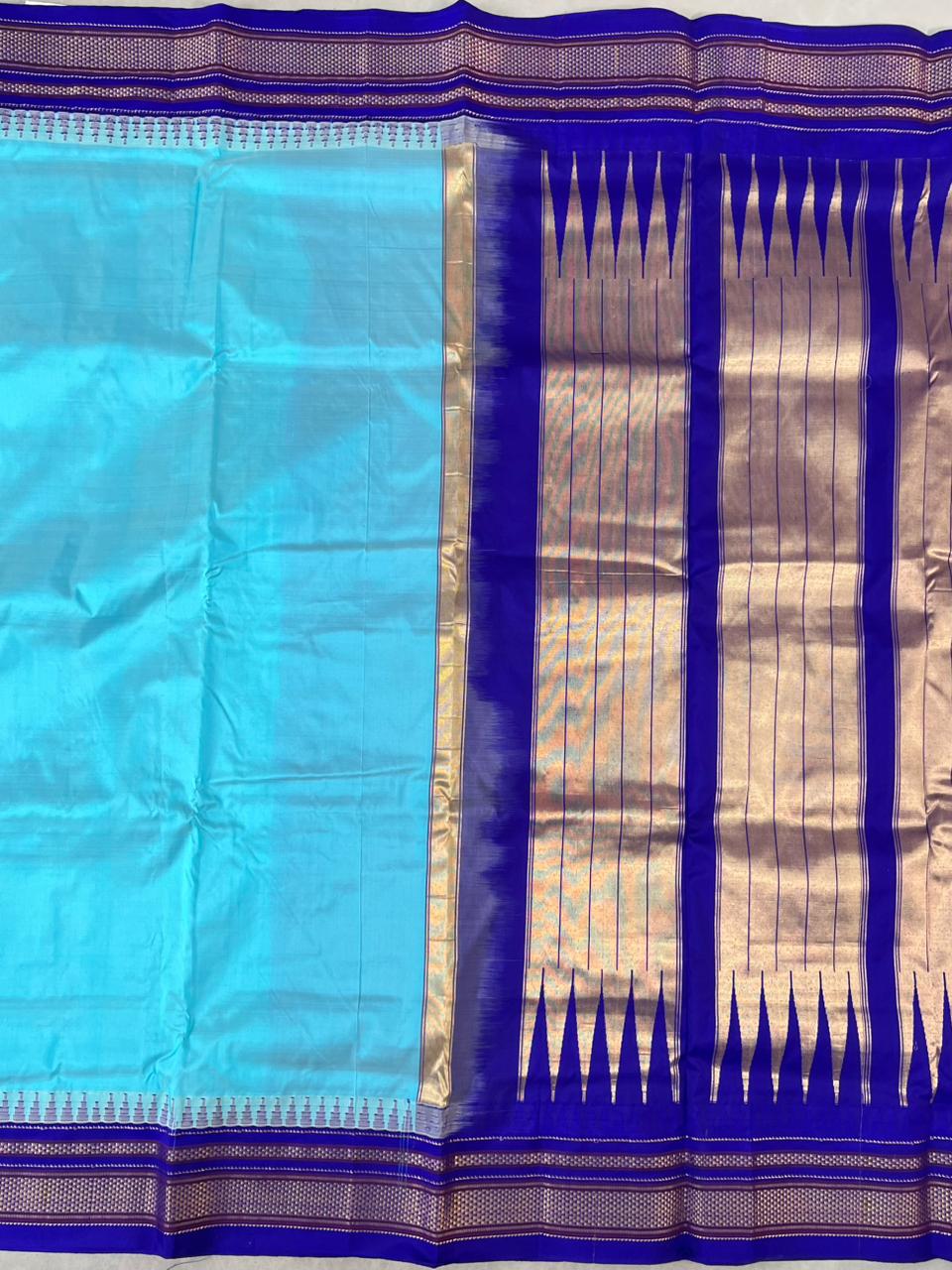 This elegant Narayanpet Pure Silk Handloom Saree features a Aqua Blue body, reflecting timeless handloom artistry. The saree is highlighted by a striking Navy Blue border, intricately crafted with traditional gold zari geometric and temple-inspired designs, adding a regal finish. Lightweight, lustrous, and graceful, this saree is perfect for festive occasions, weddings, poojas, and traditional celebrations, making it a classic addition to any silk saree collection, This saree comes with Contrast blouse and it is Silk mark certified.