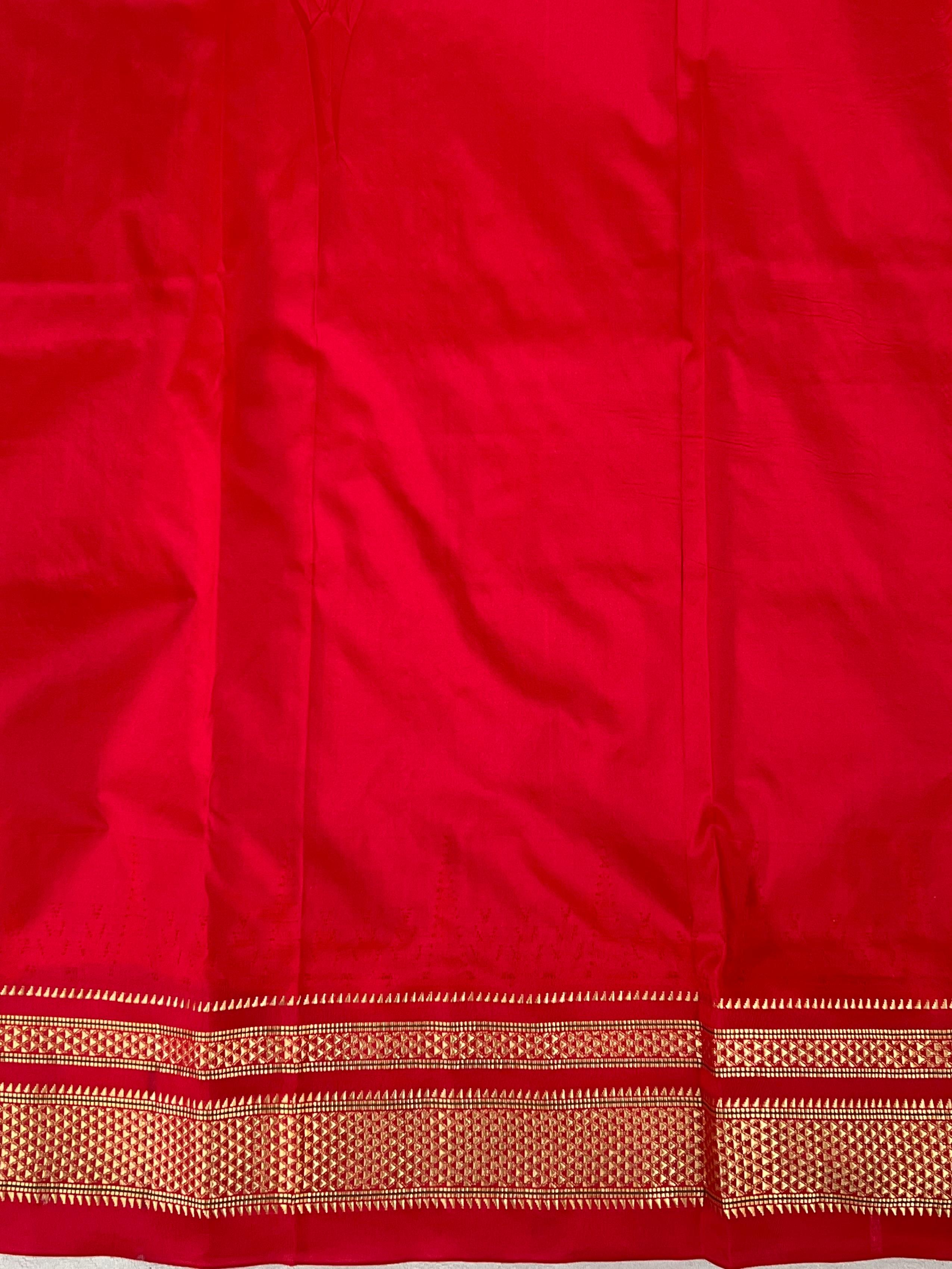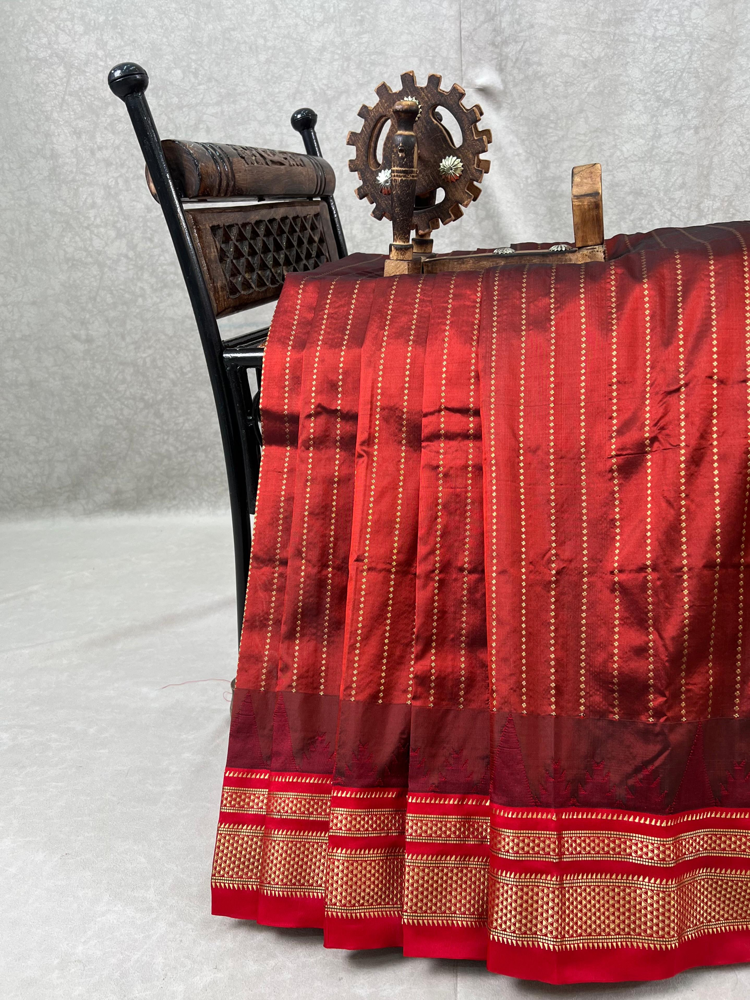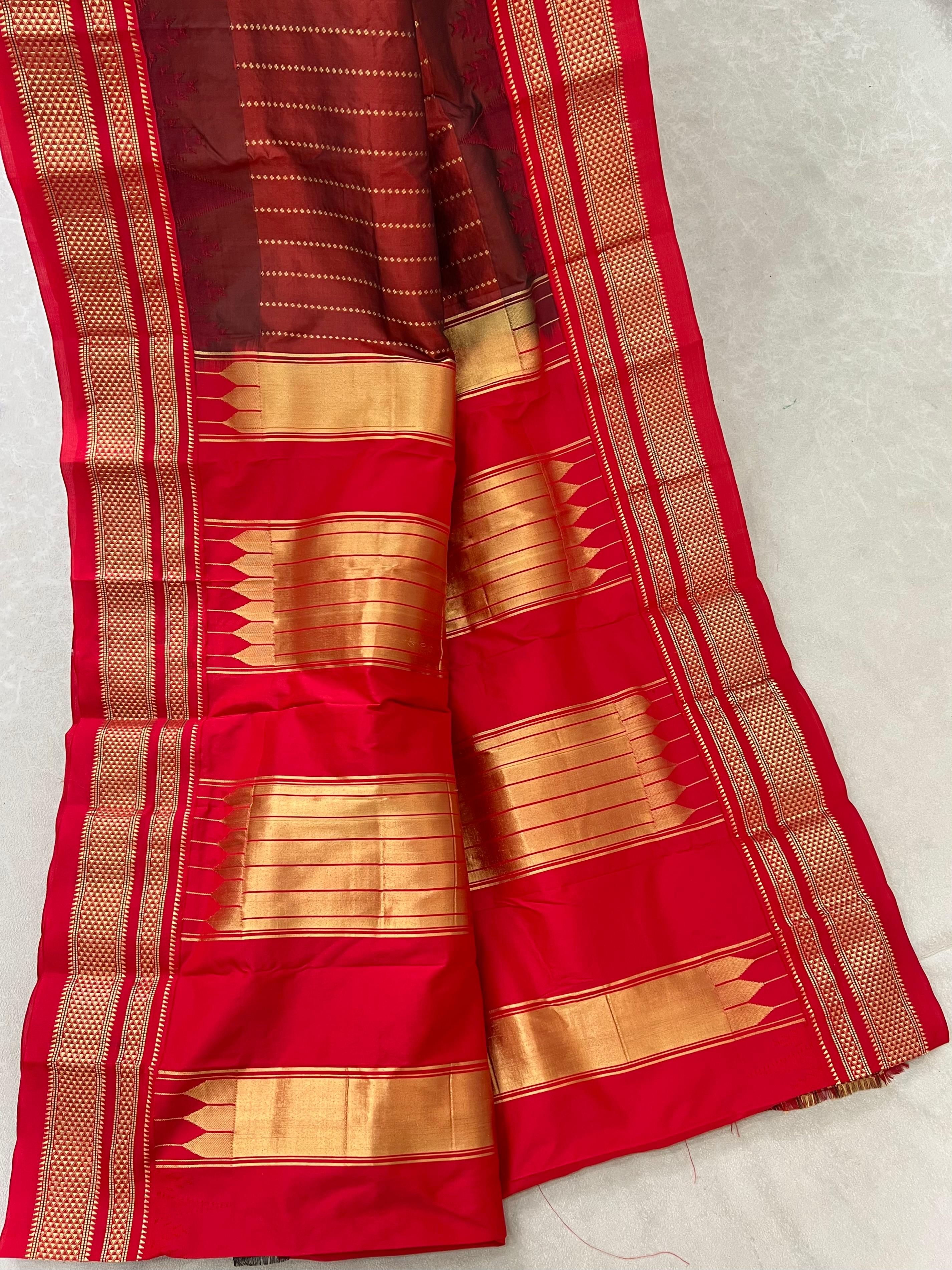 This elegant Narayanpet Pure Silk Handloom Saree features a Rust brown body beautifully woven with gold zari stripes, reflecting timeless handloom artistry. The saree is highlighted by a striking deep red border, intricately crafted with traditional gold zari geometric and temple-inspired designs, adding a regal finish. Lightweight, lustrous, and graceful, this saree is perfect for festive occasions, weddings, poojas, and traditional celebrations, making it a classic addition to any silk saree collection, This saree comes with Contrast blouse and it is Silk mark certified.