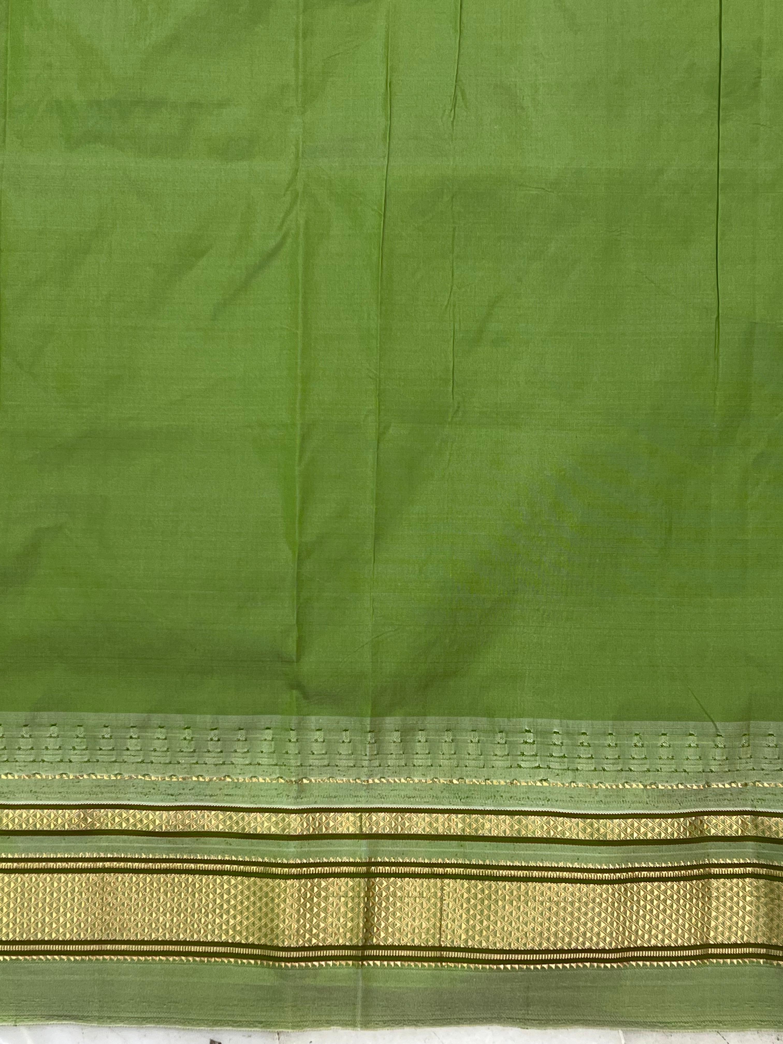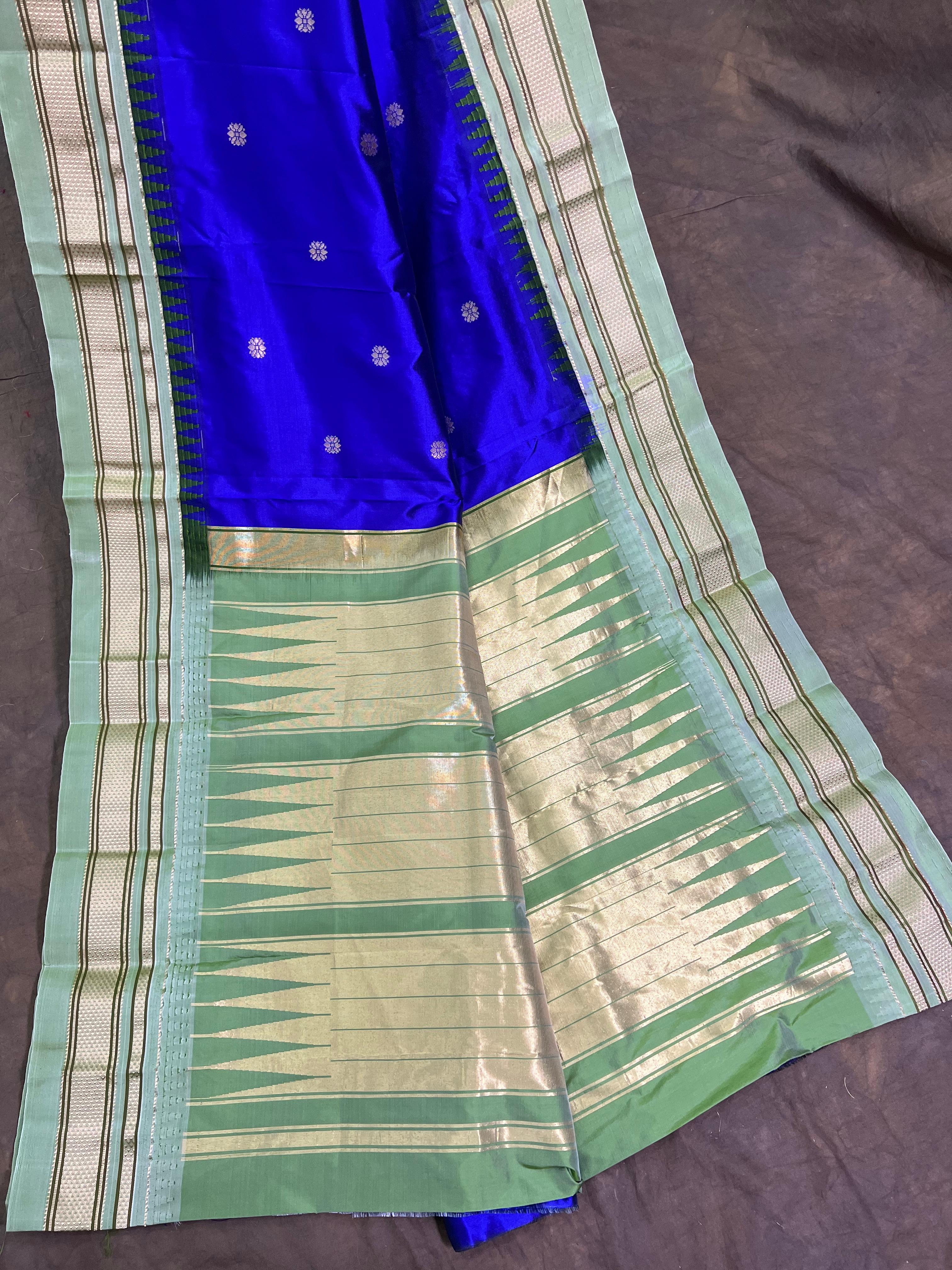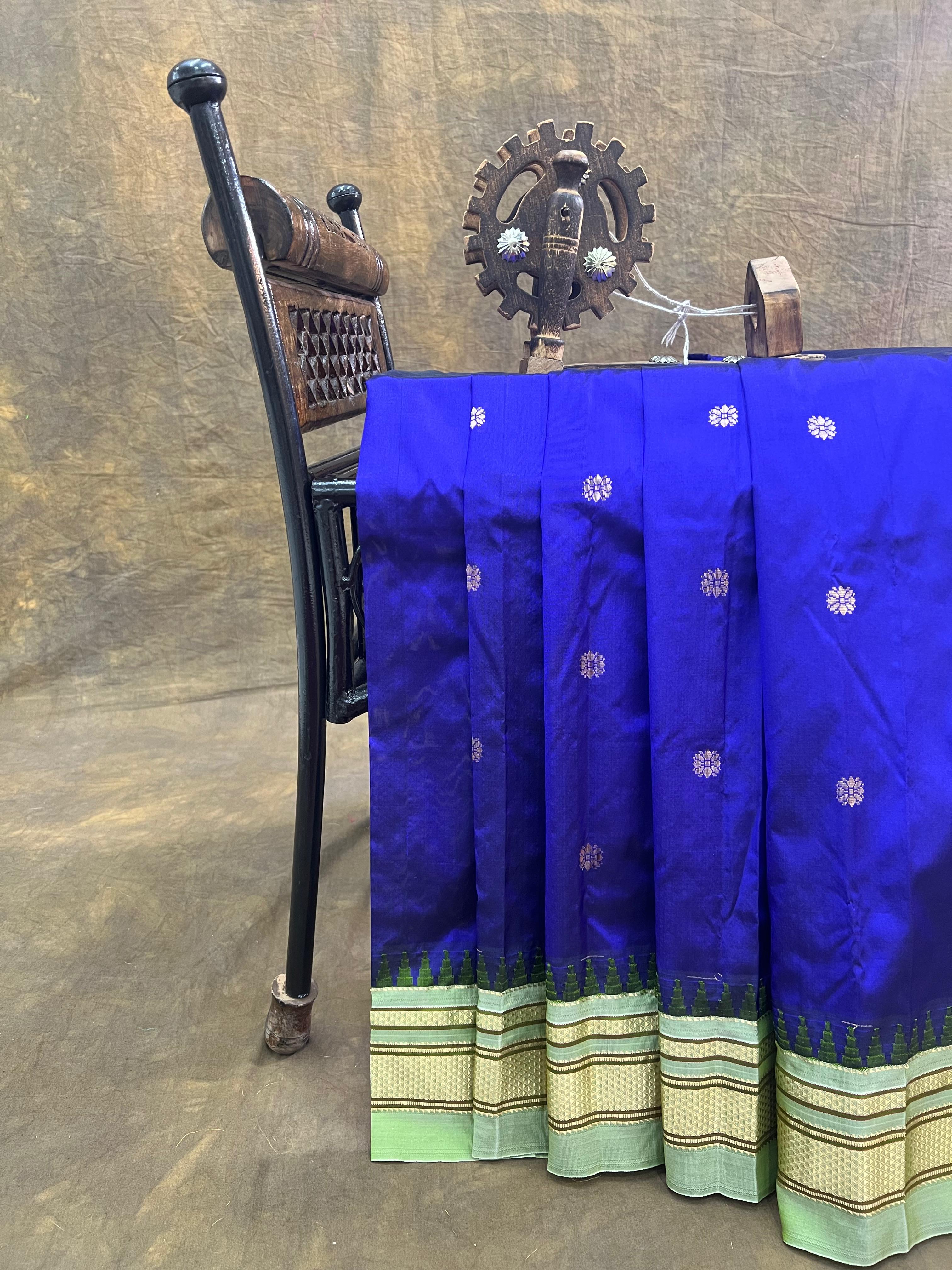 This elegant Narayanpet Pure Silk Saree showcases a timeless blend of tradition and sophistication. Crafted from rich royal blue silk, the saree is adorned with subtle golden motifs throughout the body, adding a touch of grace. The striking contrast light green and gold zari border features intricate patterns and temple motifs, enhancing its regal appeal. Perfect for festive occasions, weddings, or cultural celebrations. Coming with contrast blouse and silk mark certified. It is a perfect blend of tradition and festive flair.