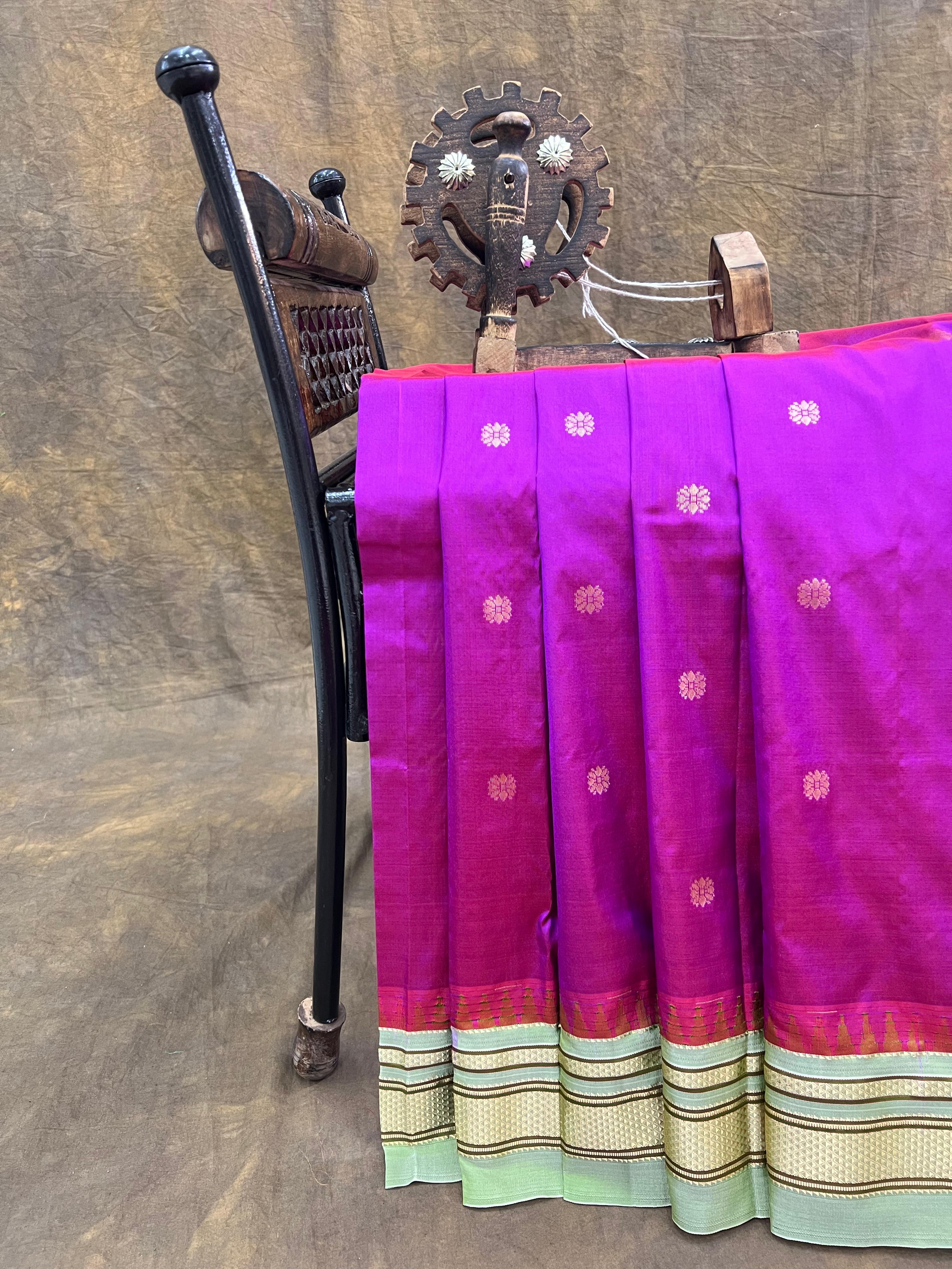 This elegant Narayanpet Pure Silk Saree showcases a timeless blend of tradition and sophistication. Crafted from rich magenta silk, the saree is adorned with subtle golden motifs throughout the body, adding a touch of grace. The striking contrast light green and gold zari border features intricate patterns and temple motifs, enhancing its regal appeal. Perfect for festive occasions, weddings, or cultural celebrations. Coming with contrast blouse and silk mark certified. It is a perfect blend of tradition and festive flair.