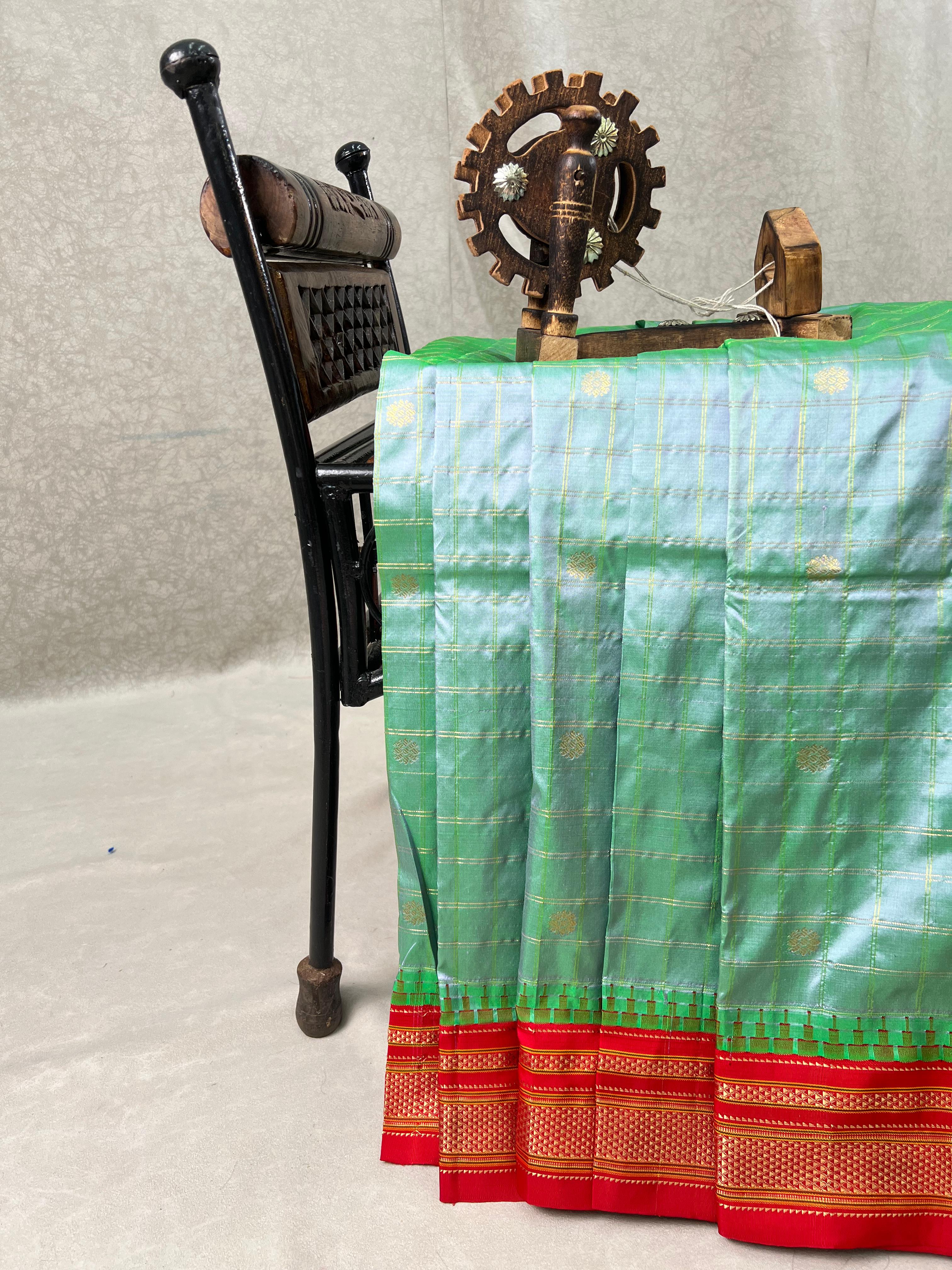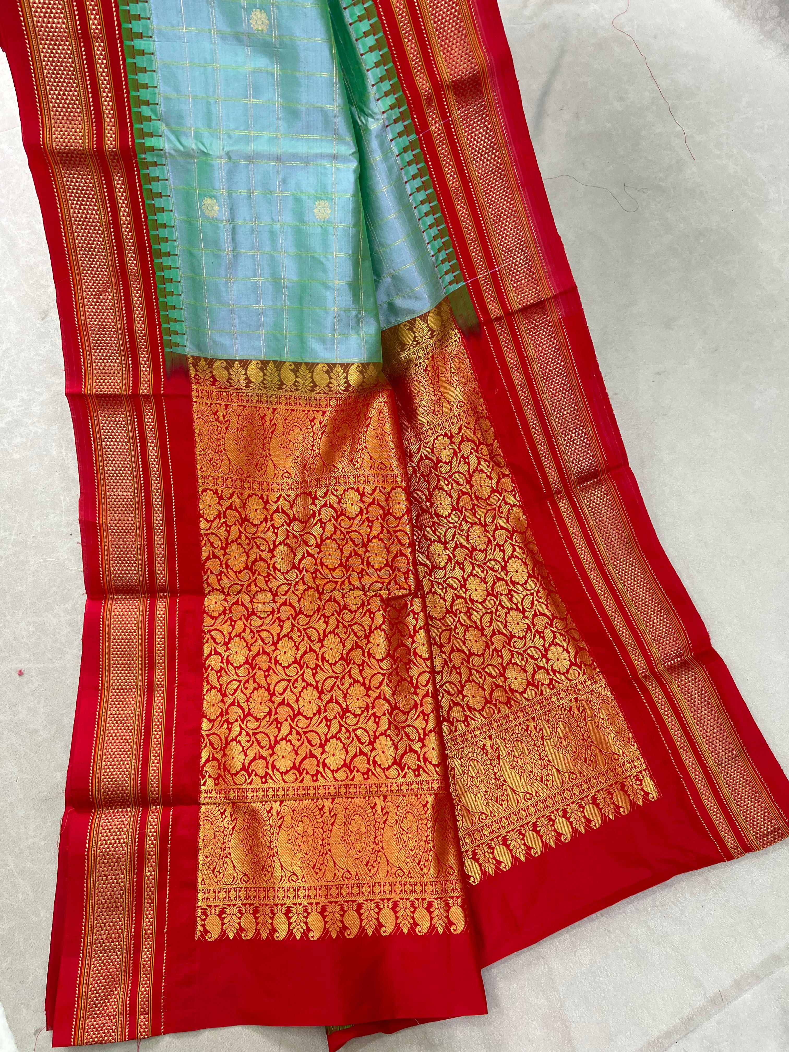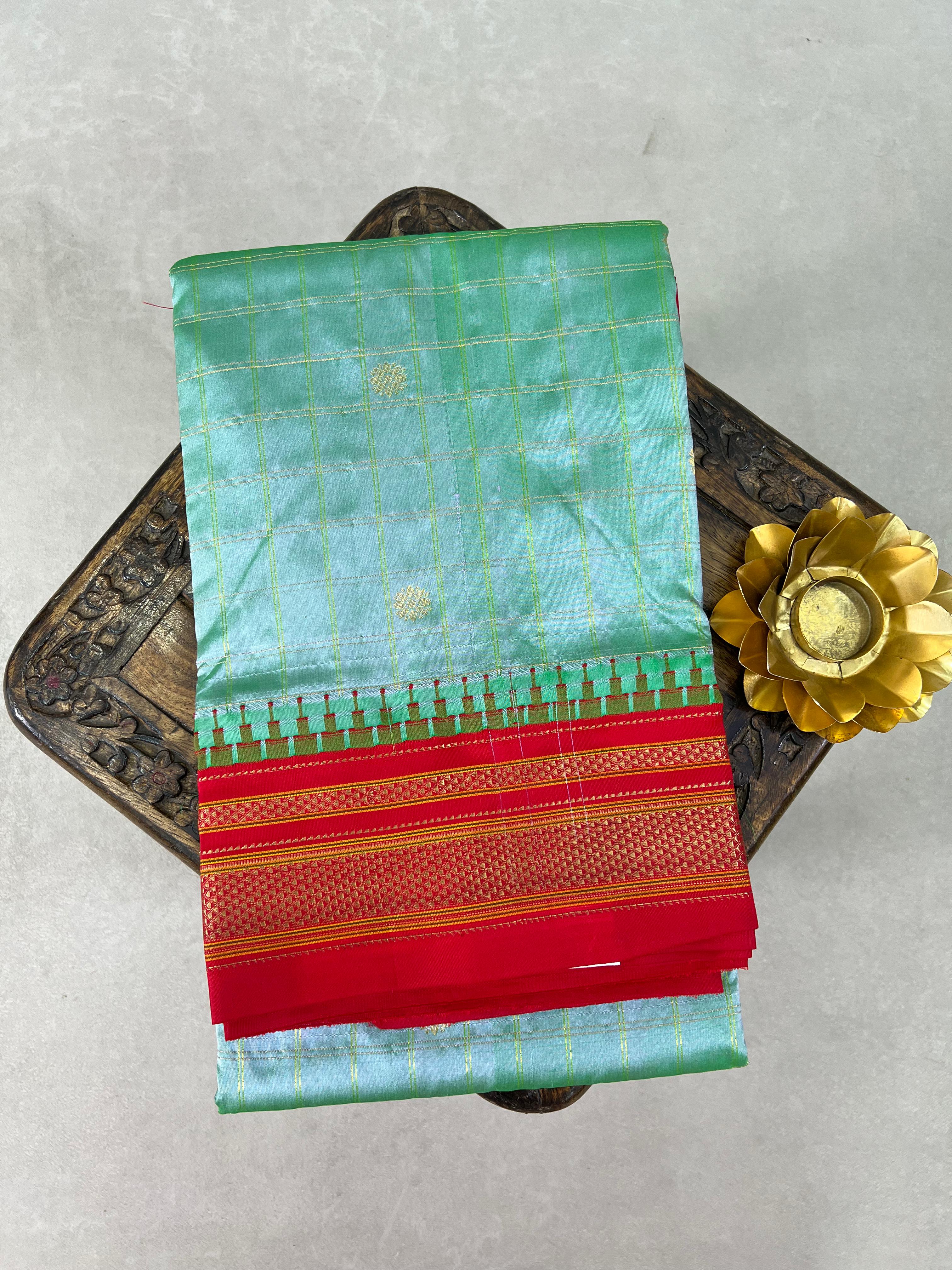 This elegant Narayanpet Pure Silk Saree showcases a timeless blend of tradition and sophistication. Crafted from rich sea blue silk, the saree is adorned with subtle golden checks and buttas throughout the body, adding a touch of grace. The striking contrast red and gold zari border features intricate patterns and temple motifs, enhancing its regal appeal. Perfect for festive occasions, weddings, or cultural celebrations. Coming with contrast blouse and silk mark certified. It is a perfect blend of tradition and festive flair.
