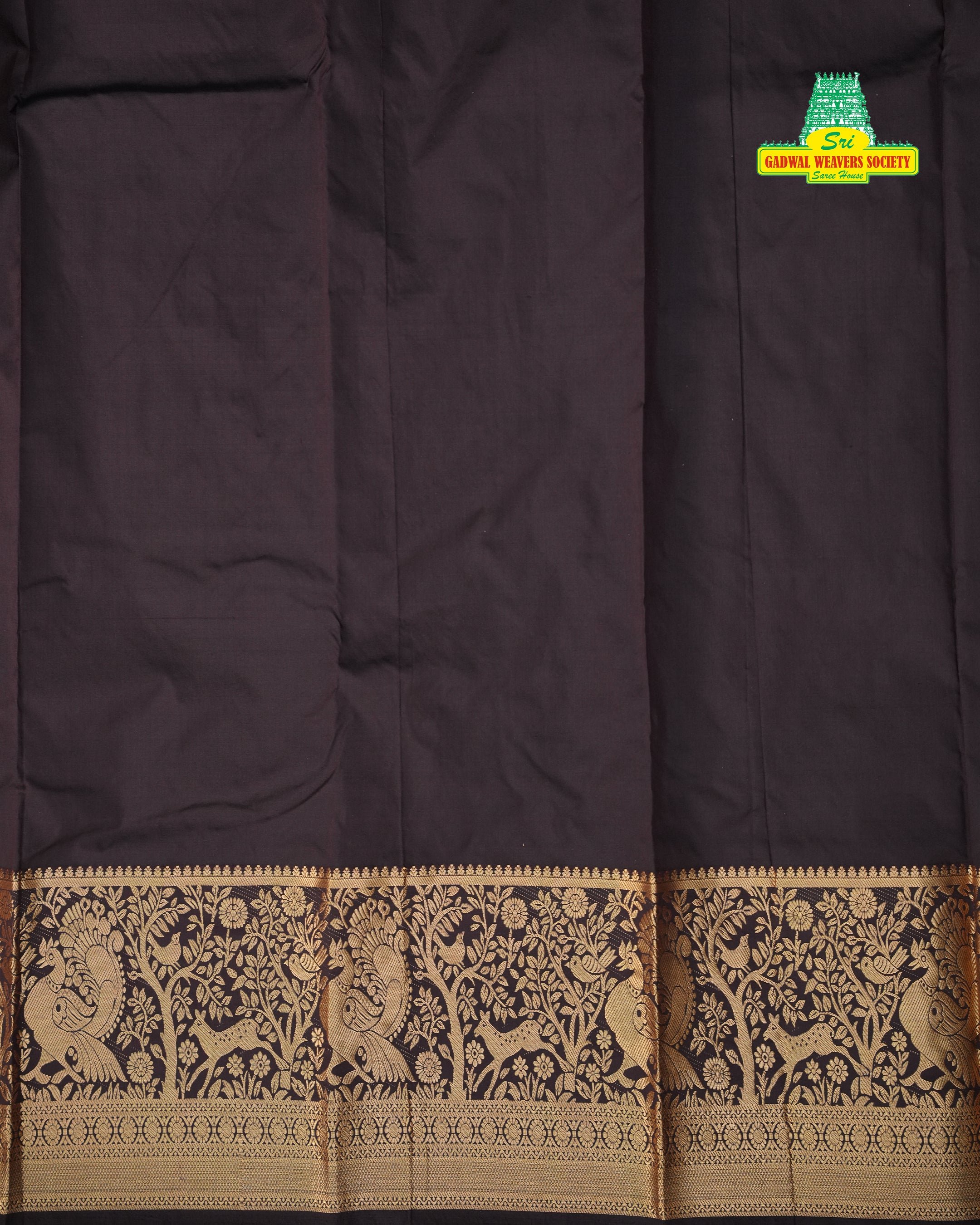 This exquisite Narayanpet Handloom Pure Silk Bridal Saree showcases timeless craftsmanship and rich tradition. The vibrant mango yellow body beautifully contrasts with the deep brown zari-woven border adorned with intricate peacock and floral motifs, symbolizing elegance and prosperity. Perfect for brides who adore traditional charm blended with luxurious silk finesse. Coming with contrast blouse and silk mark certified