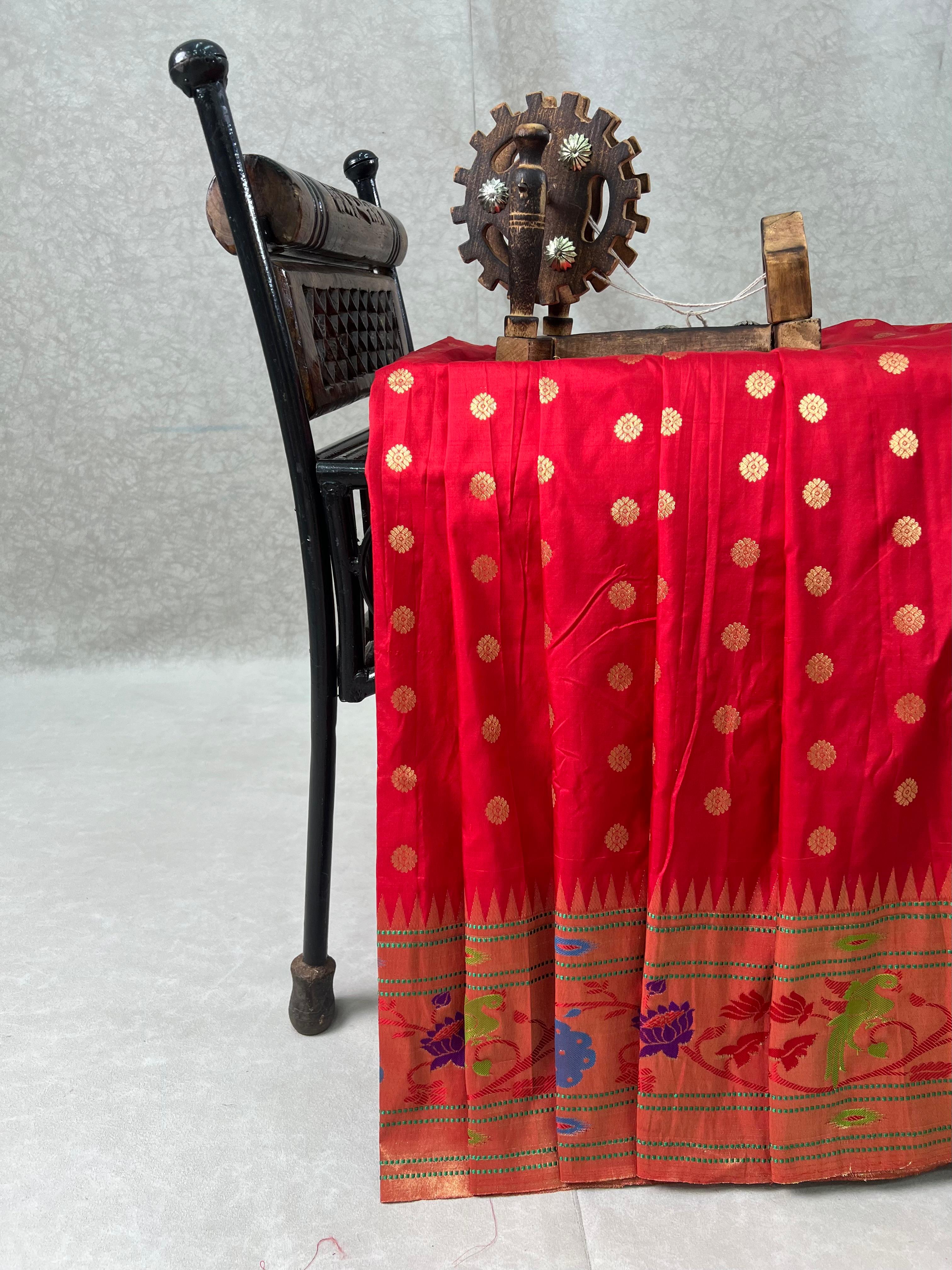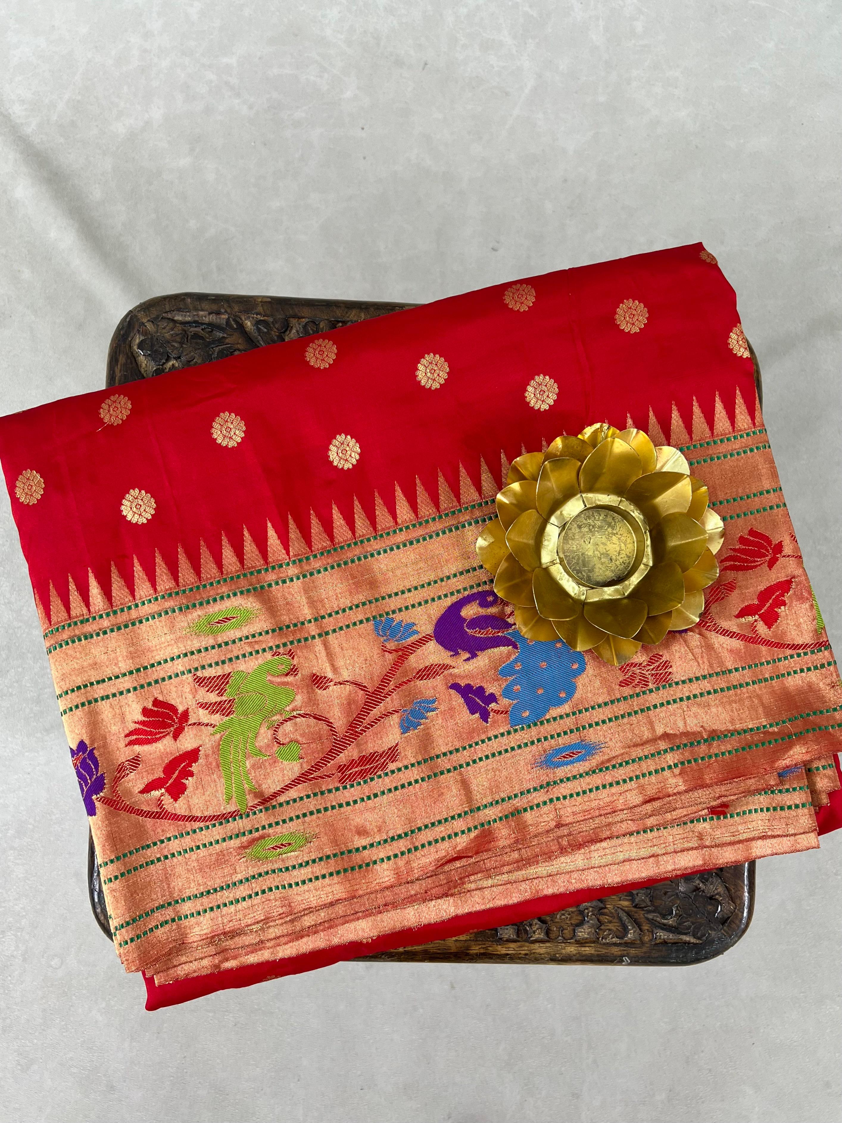This Paithani Pure Silk Handloom Saree showcases timeless craftsmanship with its rich red body adorned with delicate golden buttas. The highlight is the exquisite zari border featuring traditional peacock and floral motifs woven in vibrant hues of multicolour on a golden base — a perfect blend of elegance and heritage. Ideal for festive occasions and grand celebrations. comes with matching self blouse and Silk Mark Certified.