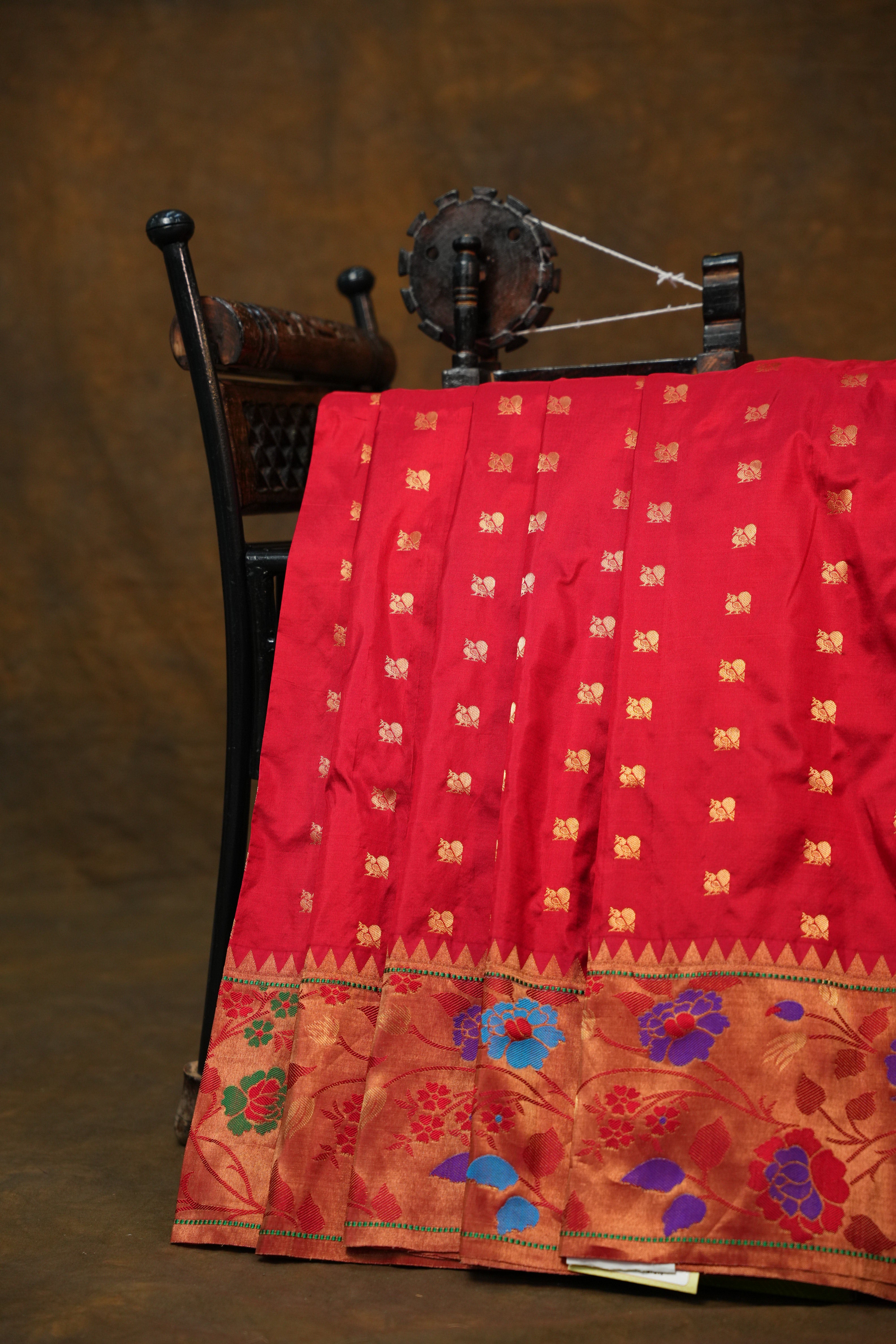 This Paithani Pure Silk Handloom Saree showcases timeless craftsmanship with its rich Red body adorned with delicate golden buttas. The highlight is the exquisite zari border featuring traditional Multicolor floral motifs woven in vibrant hues of multicolour on a golden base — a perfect blend of elegance and heritage. Ideal for festive occasions and grand celebrations. comes with matching Self blouse and Silk Mark Certified.