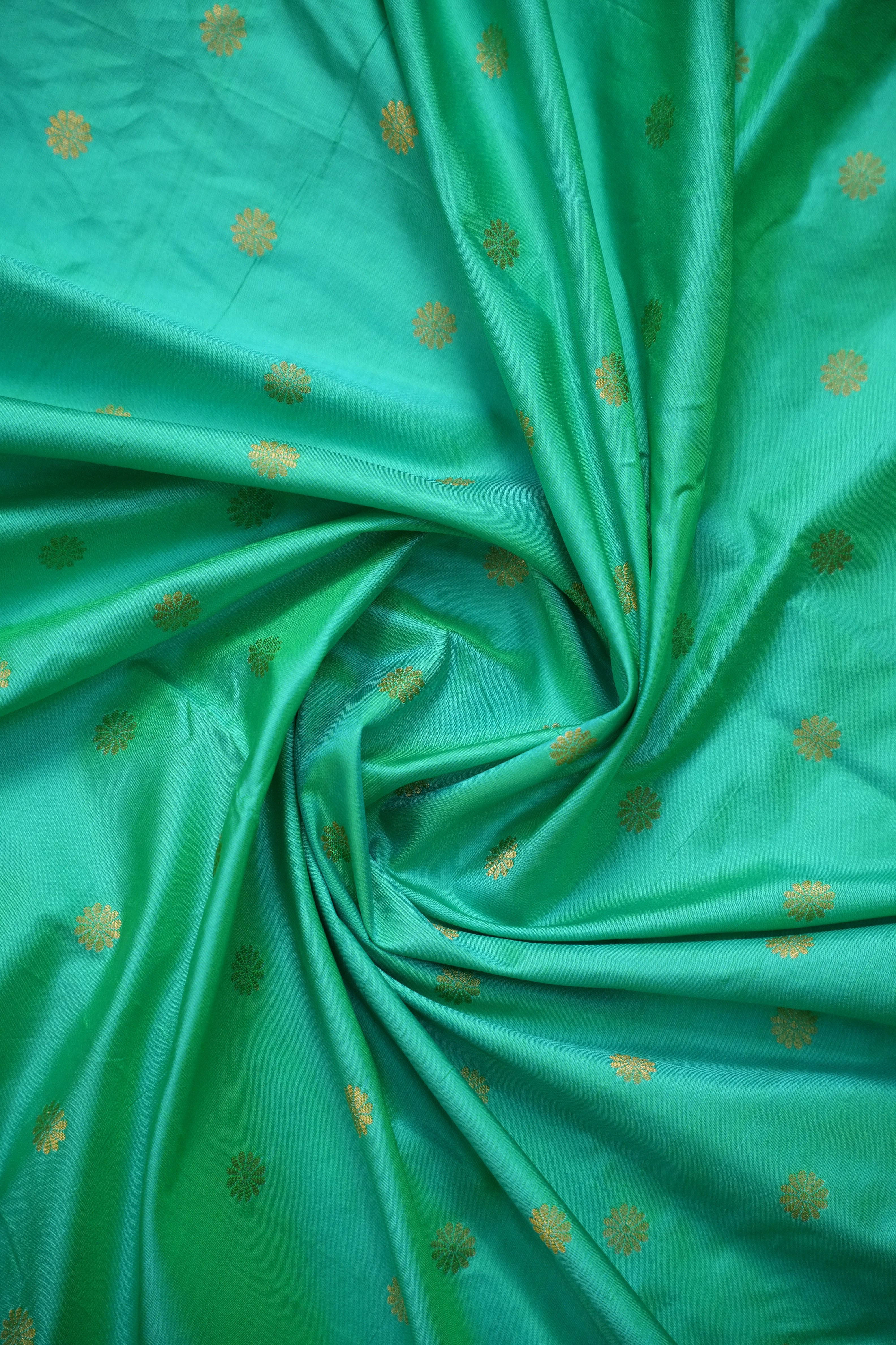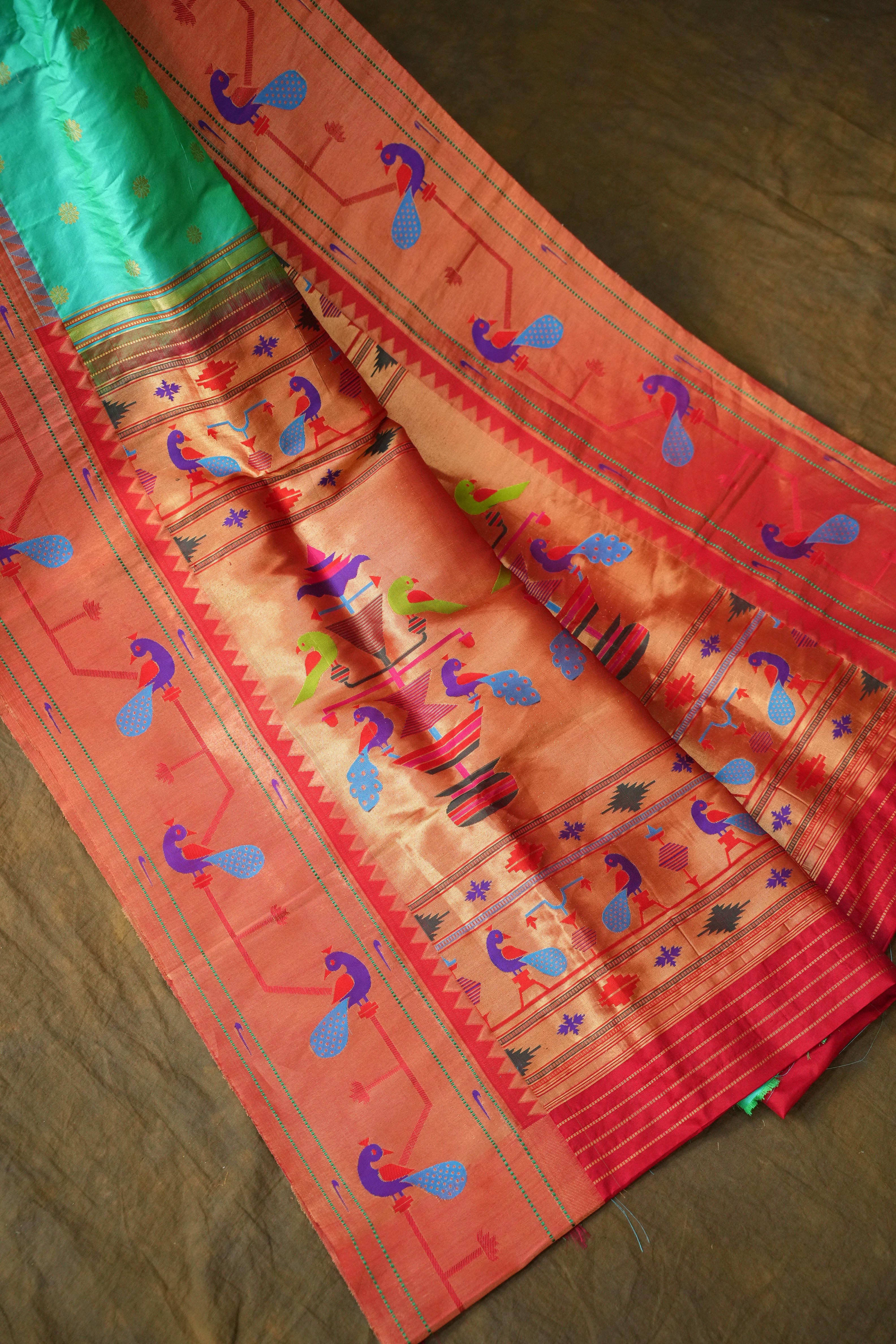 This Paithani Pure Silk Handloom Saree showcases timeless craftsmanship with its rich Sea Green body adorned with delicate golden buttas. The highlight is the exquisite zari Red border featuring traditional Multicolor peacock motifs woven in vibrant hues of multicolour on a golden base — a perfect blend of elegance and heritage. Ideal for festive occasions and grand celebrations. comes with matching Contrast blouse and Silk Mark Certified.