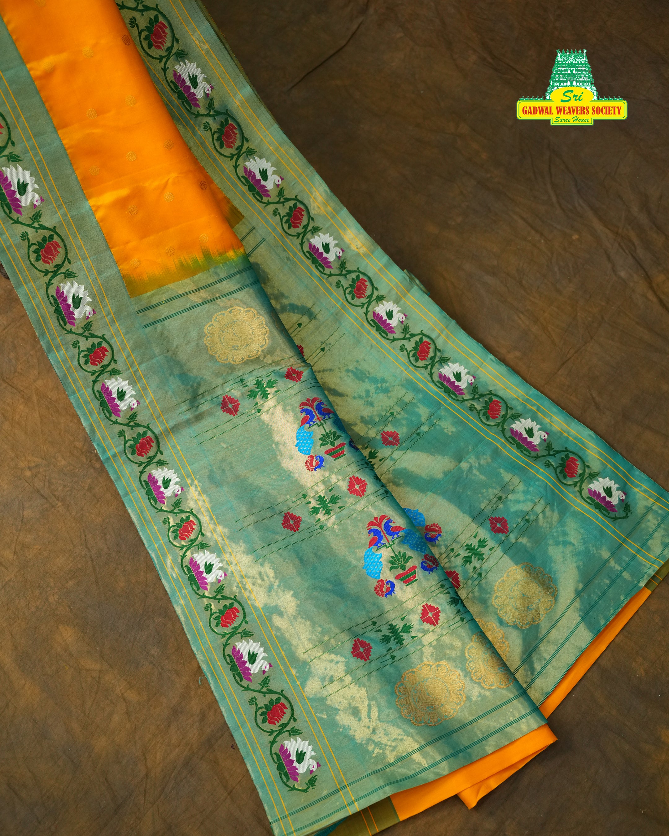 Radiant Gadwal Tissue Pure Silk Paithani Saree in a vibrant yellow  featuring rich golden tissue weave with bold . Its lustrous finish and traditional elegance make it a perfect choice for festive and wedding celebrations. Comes with a self blouse, and is Silk Mark certified for authenticate.