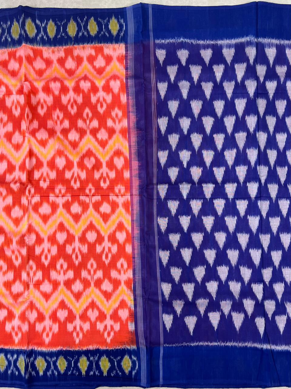 Discover the beauty of traditional craftsmanship with this elegant Pochampally Ikat Pure Cotton Saree, featuring a rich Neon Orange body that exudes timeless charm.The body is adorned with subtle ikat motifs, adding a touch of traditional elegance to its graceful drape.The striking Royal Blue border showcases a vibrant blend of hues with intricate woven patterns. . Soft, breathable, and lightweight, this saree ensures all-day comfort with an effortlessly elegant look. Blouse Not Included