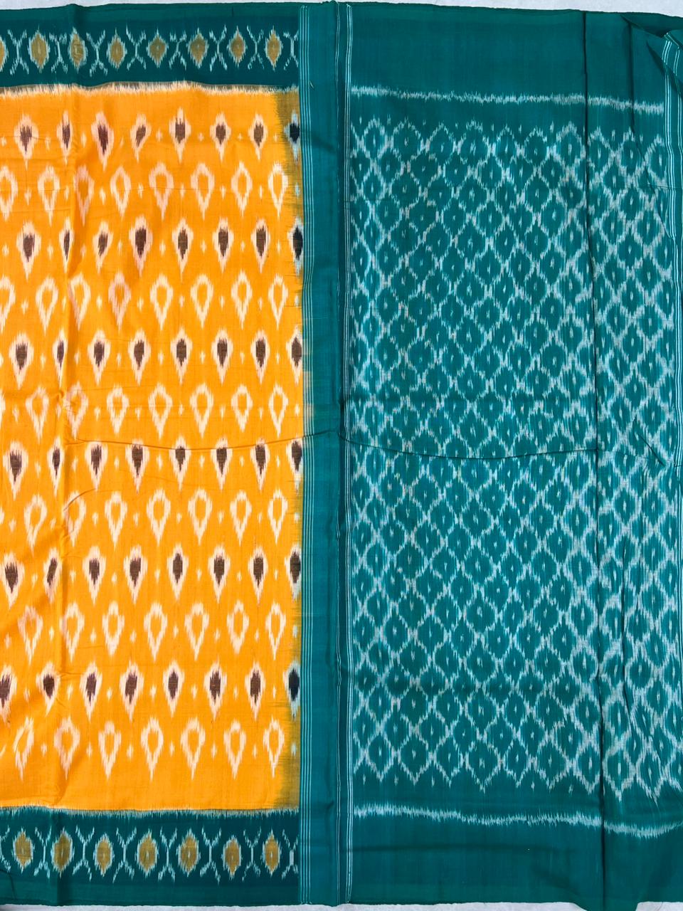 Discover the beauty of traditional craftsmanship with this elegant Pochampally Ikat Pure Cotton Saree, featuring a rich Yellow body that exudes timeless charm.The body is adorned with subtle ikat motifs, adding a touch of traditional elegance to its graceful drape.The striking Green border showcases a vibrant blend of hues with intricate woven patterns. . Soft, breathable, and lightweight, this saree ensures all-day comfort with an effortlessly elegant look. Blouse Not Included