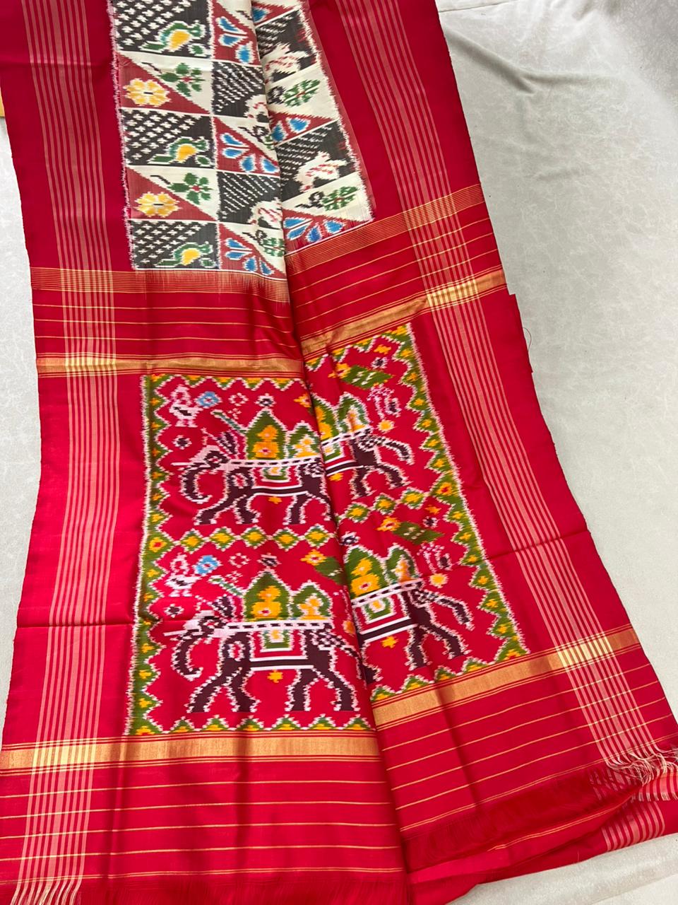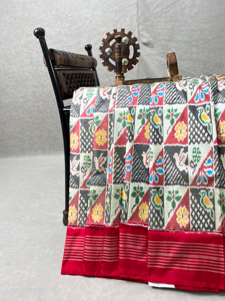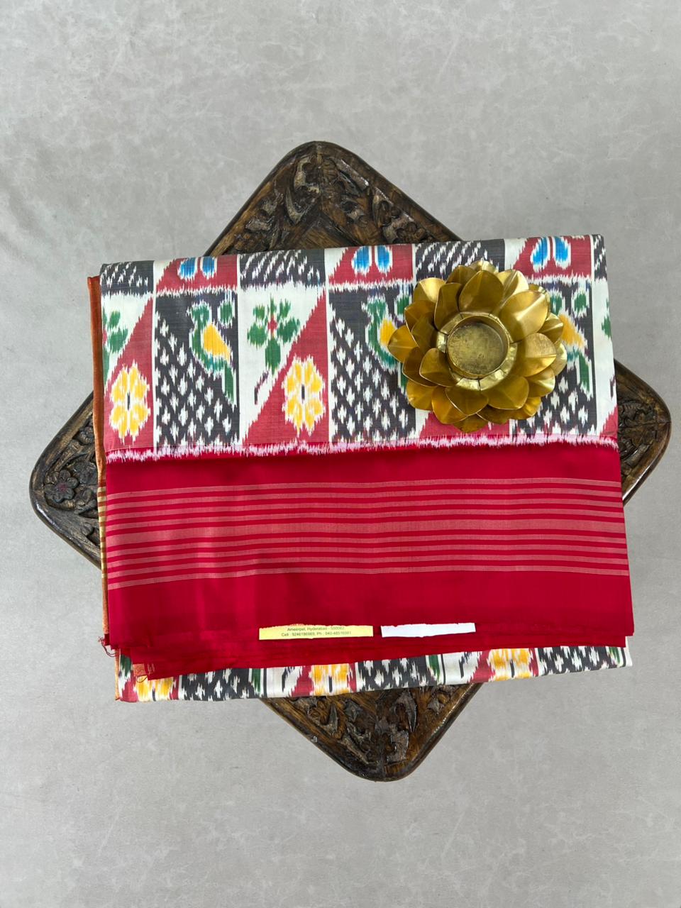 Pochampally Ikkat Pure Silk Handloom Saree featuring intricate geometric ikkat weaves in multicolour Ikkat design on a Off White color body. The Red kanchi border adds elegance, making it a perfect choice for traditional and festive occasions. Lightweight and elegant, it is Silk Mark certified, ensuring pure silk quality and heritage craftsmanship. Comes with a contrast blouse for a complete, graceful look.