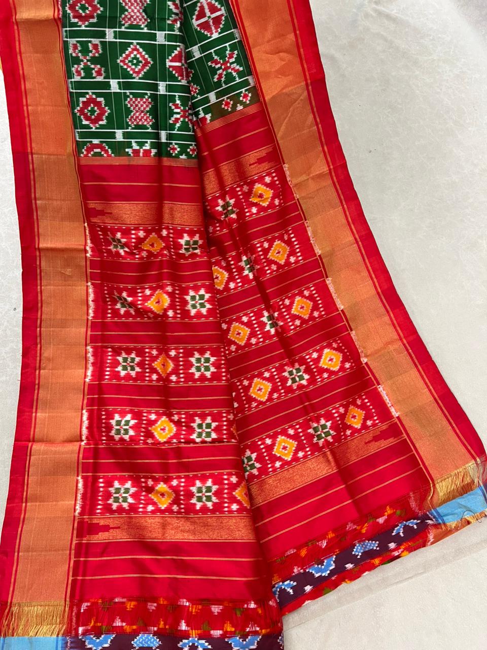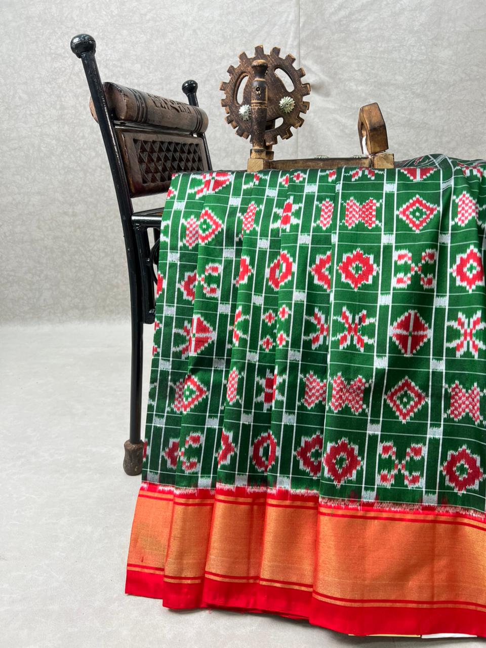 Pochampally Ikkat Pure Silk Handloom Saree featuring intricate geometric ikkat weaves in multicolour Ikkat design on a Bottle Green color body. The Red kanchi border adds elegance, making it a perfect choice for traditional and festive occasions. Lightweight and elegant, it is Silk Mark certified, ensuring pure silk quality and heritage craftsmanship. Comes with a contrast blouse for a complete, graceful look.