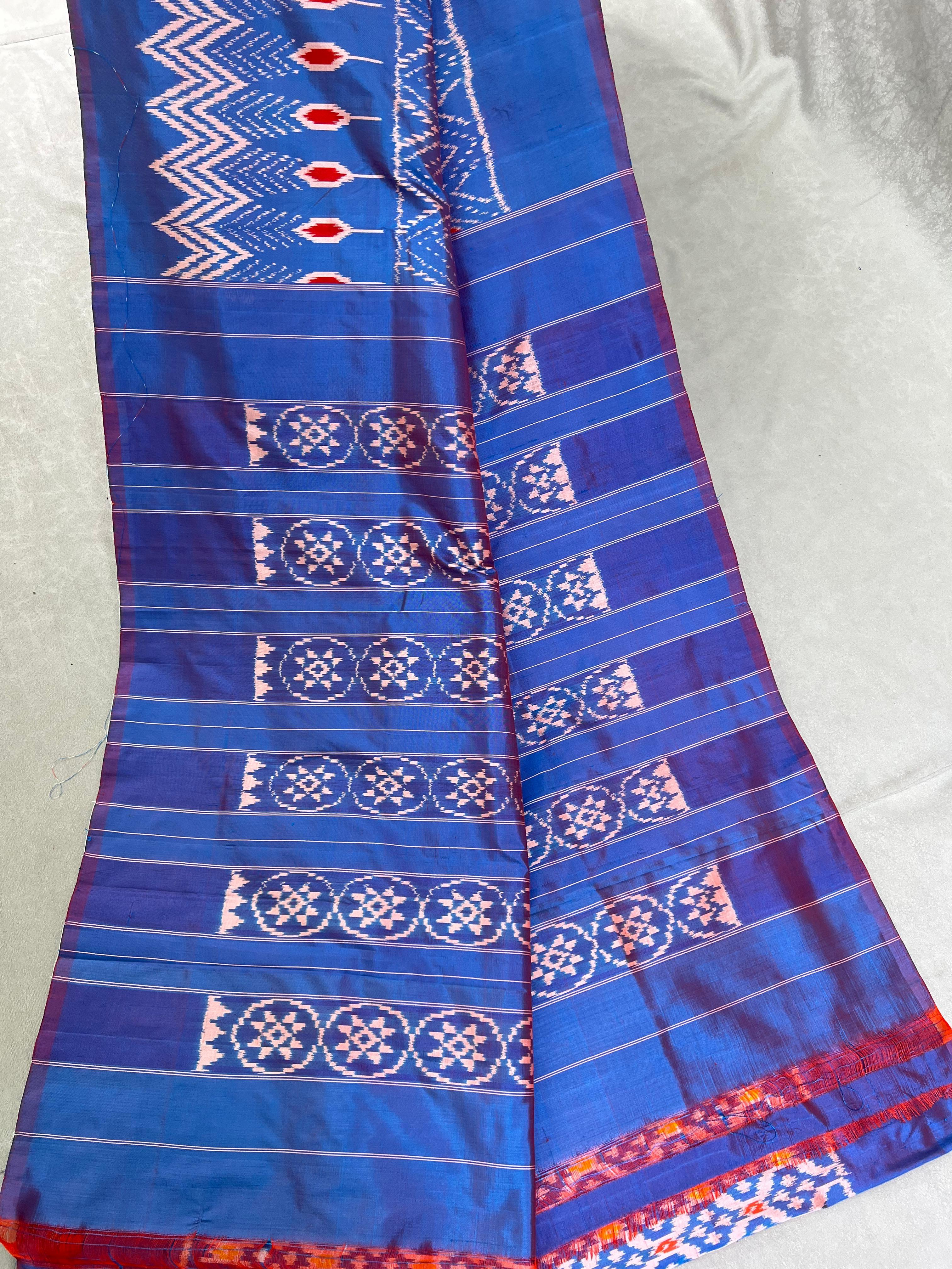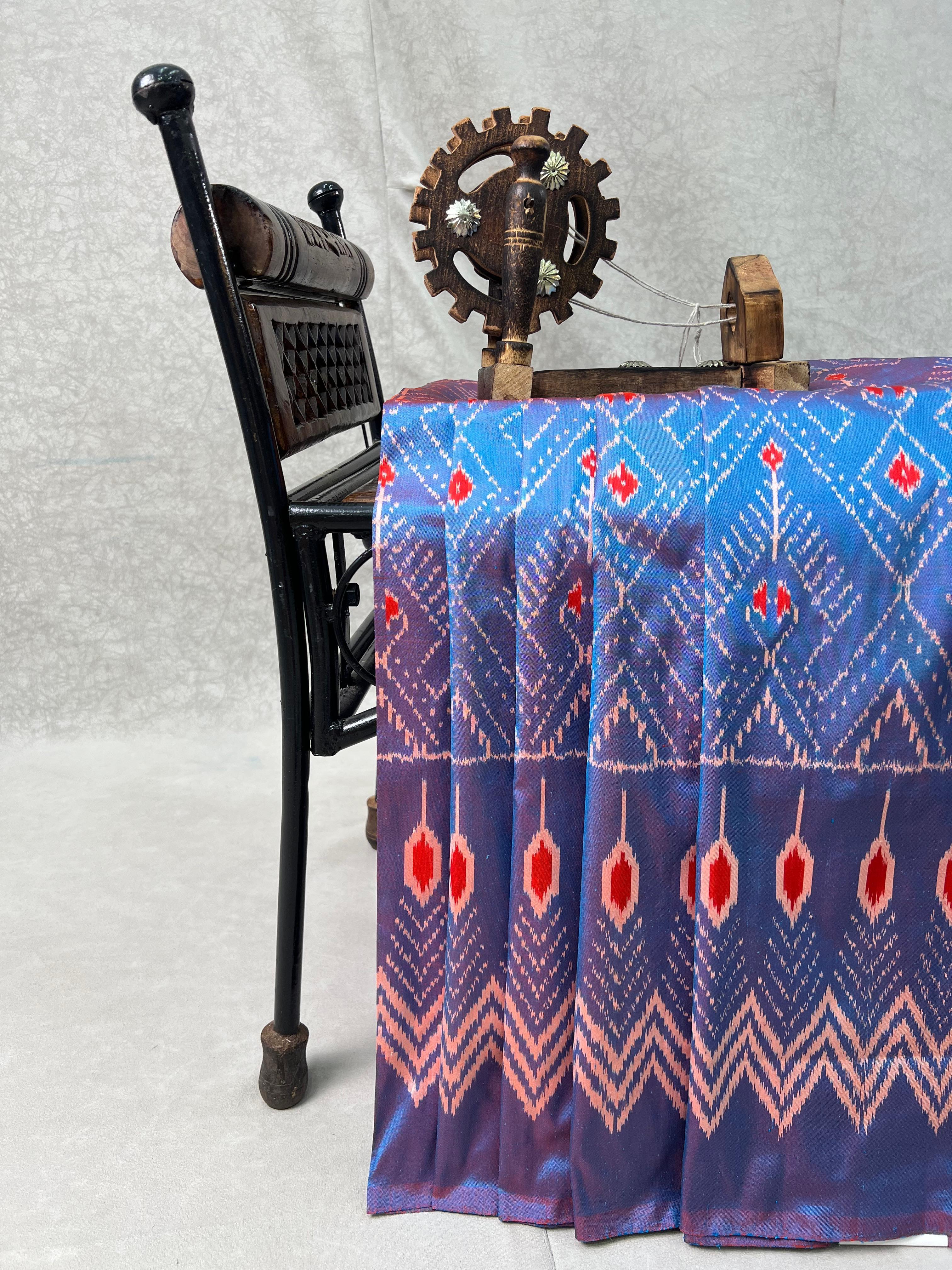 Pochampally Ikkat Pure Silk Handloom Saree featuring intricate geometric ikkat weaves in white and red on a dualshade blue body. The self colour border adds elegance, making it a perfect choice for traditional and festive occasions. Lightweight and elegant, it is Silk Mark certified, ensuring pure silk quality and heritage craftsmanship. Comes with a self blouse for a complete, graceful look.