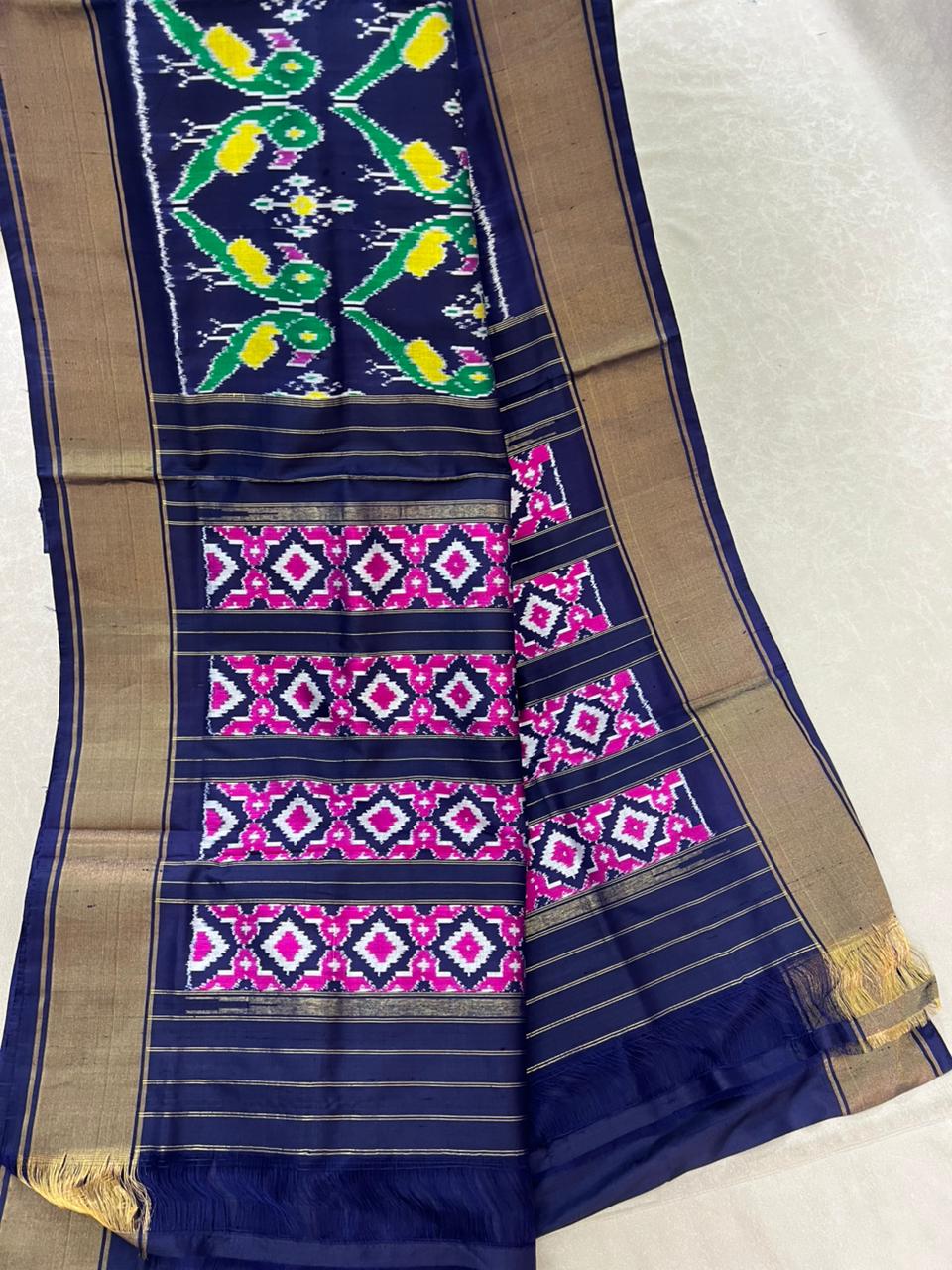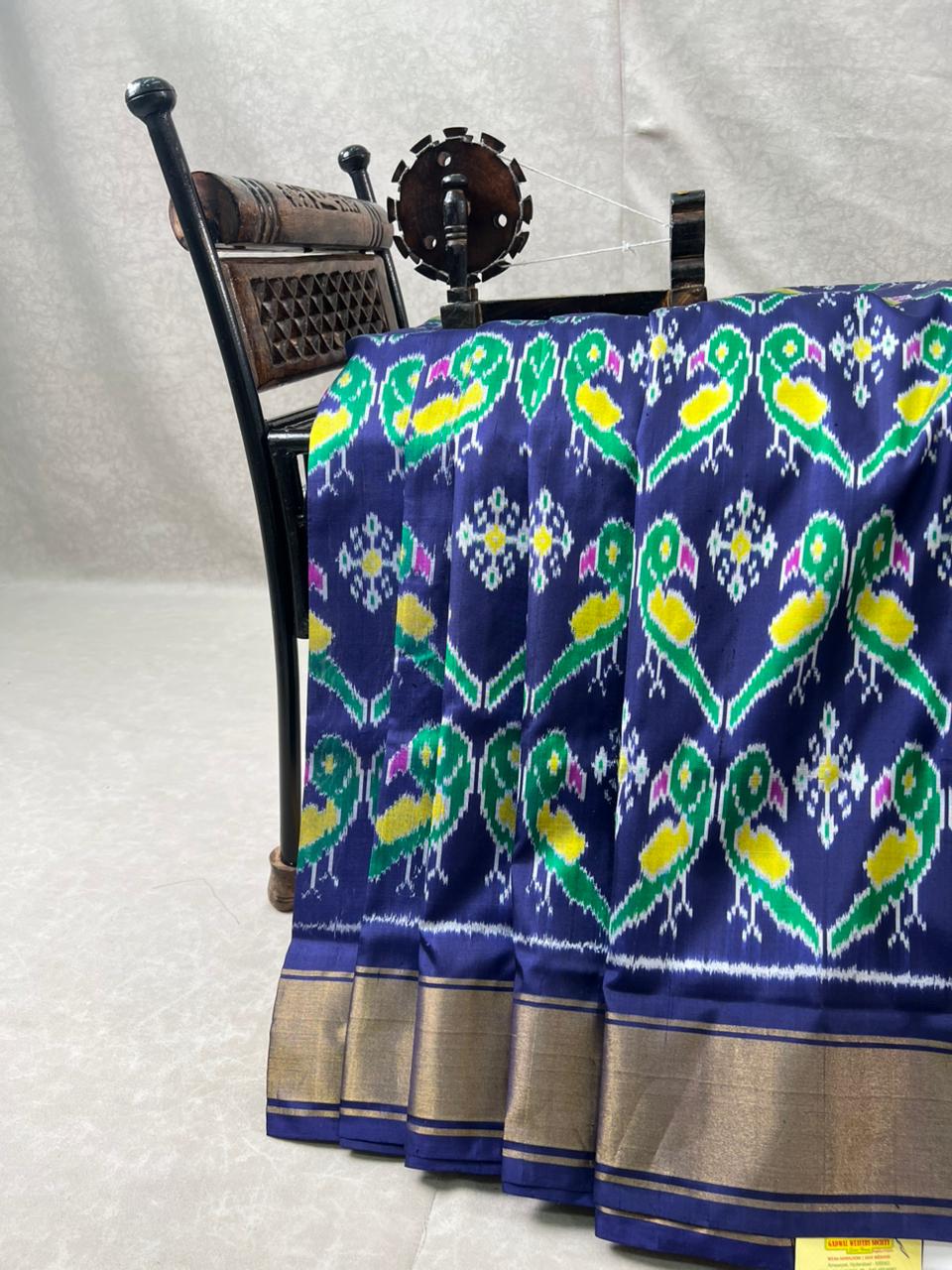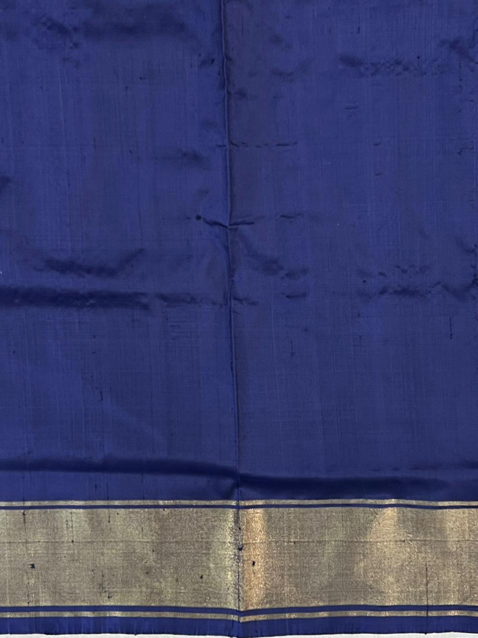 Pochampally Ikkat Pure Silk Handloom Saree featuring intricate geometric ikkat weaves in multicolour Ikkat design on a Blue body. The Blue self border adds elegance, making it a perfect choice for traditional and festive occasions. Lightweight and elegant, it is Silk Mark certified, ensuring pure silk quality and heritage craftsmanship. Comes with a Self blouse for a complete, graceful look.