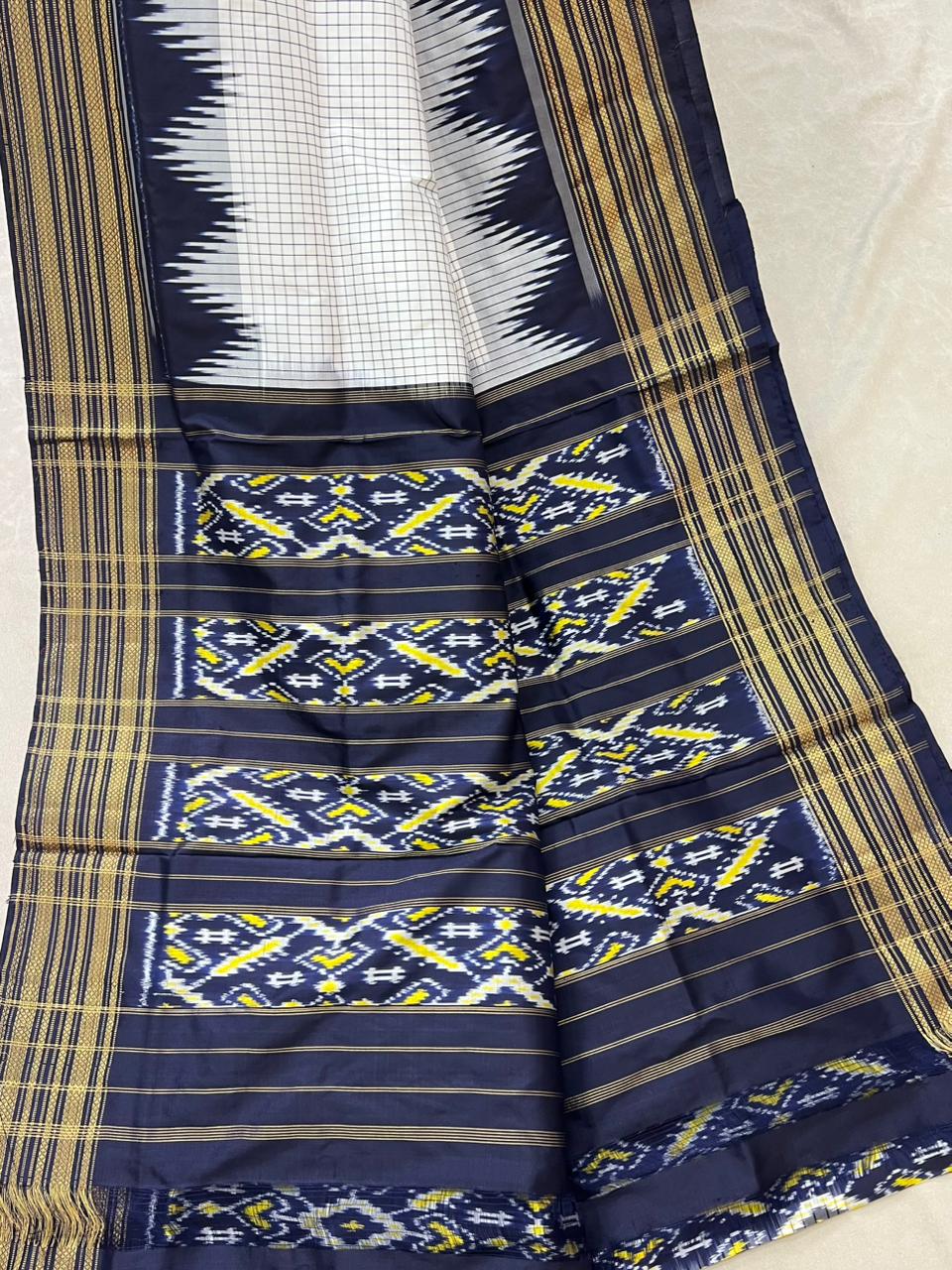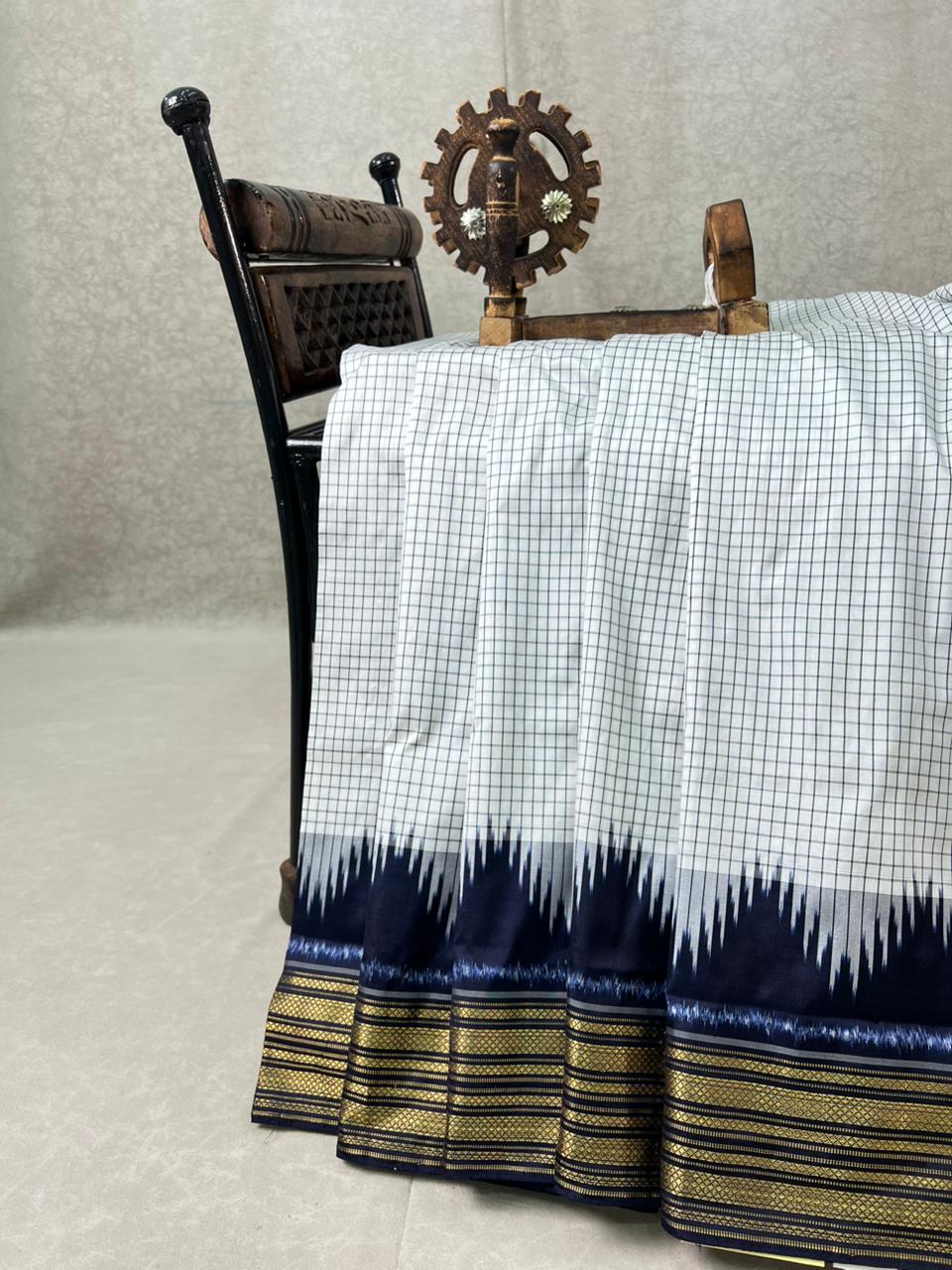 Pochampally Ikkat Pure Silk Handloom Saree featuring a Black checks on the white body. The Dark navy blue temple border with gold zari detailing adds a touch of elegance, making it a perfect choice for traditional and festive occasions. Lightweight yet luxurious, this saree reflects pure silk quality and heritage craftsmanship. It comes with a contrast blouse for a complete and graceful look and is proudly Silk Mark certified.