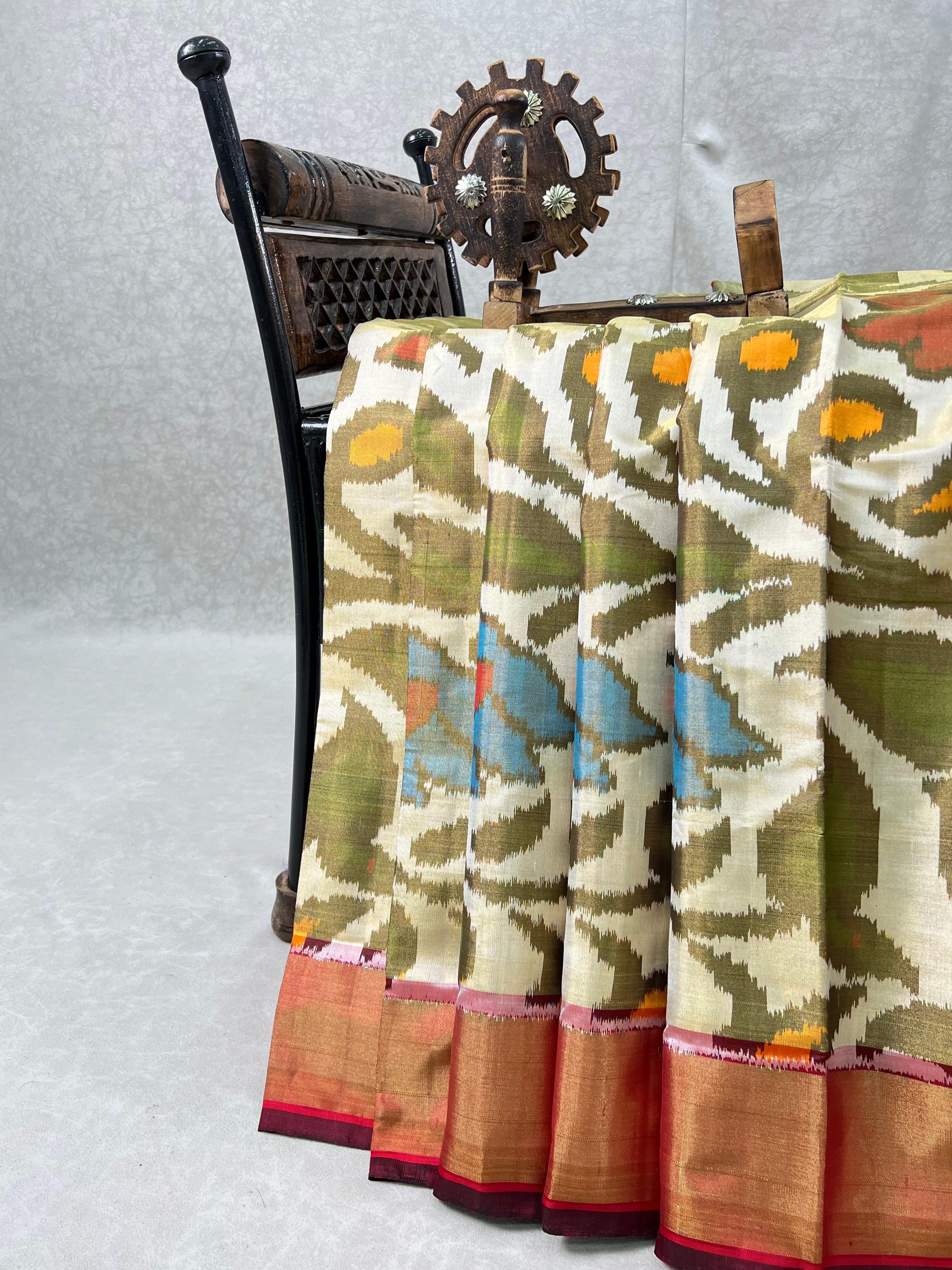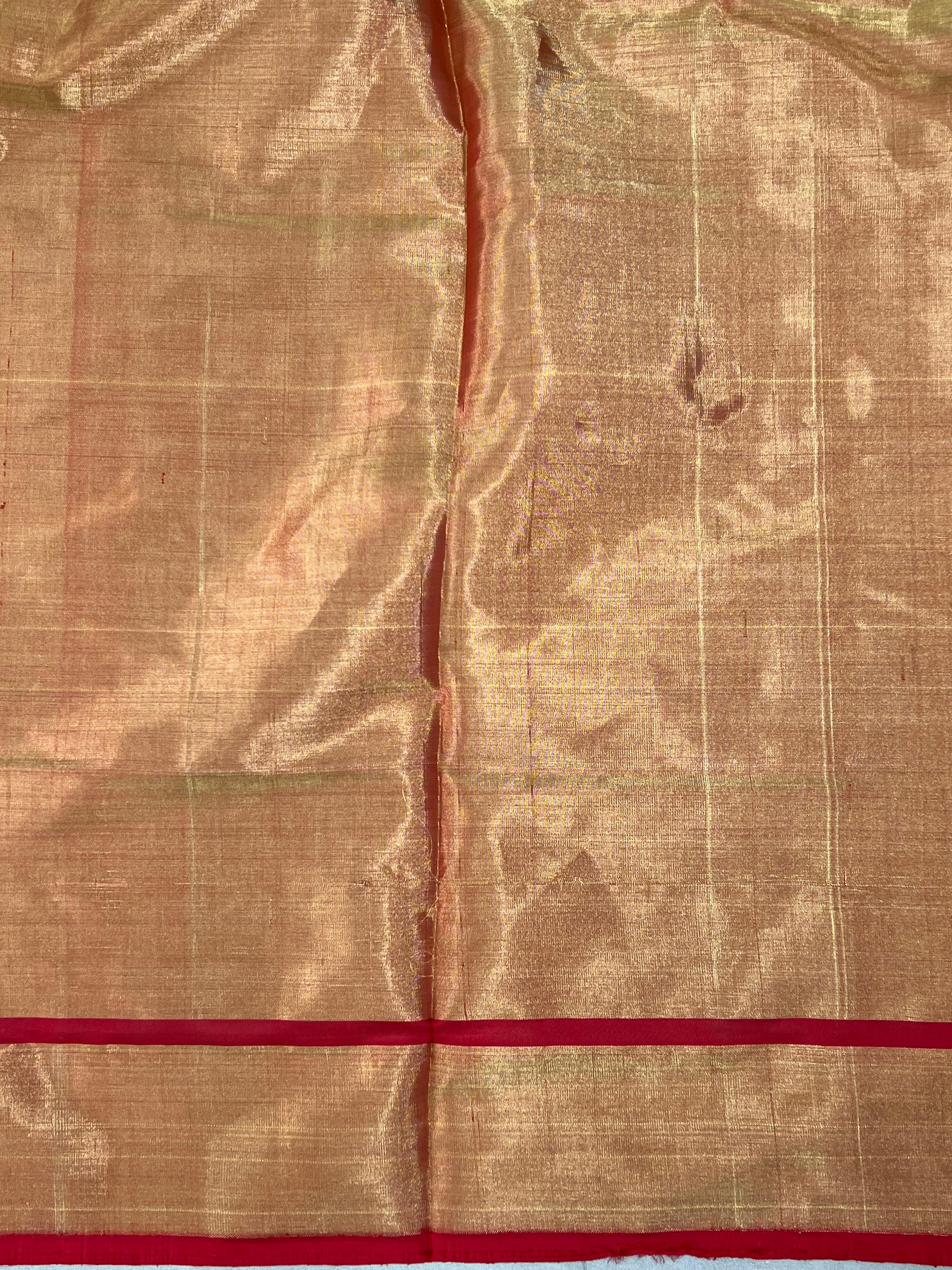 This Pochampally Ikat pure silk tissue handloom saree features a beautifully woven body in rich earthy tones with an intricate ikat pattern that reflects the timeless artistry of Pochampally handloom weaving. The body displays a harmonious blend of Multi color, and subtle golden hues, creating a graceful and elegant look with a soft natural sheen from the silk tissue fabric, allowing the design to flow seamlessly and stand out. The saree is finished with a striking red border with dark maroon selvedge, that adds a bold contrast, perfectly complementing the body colors. Paired with a contrast blouse and this saree is Silk mark certified.