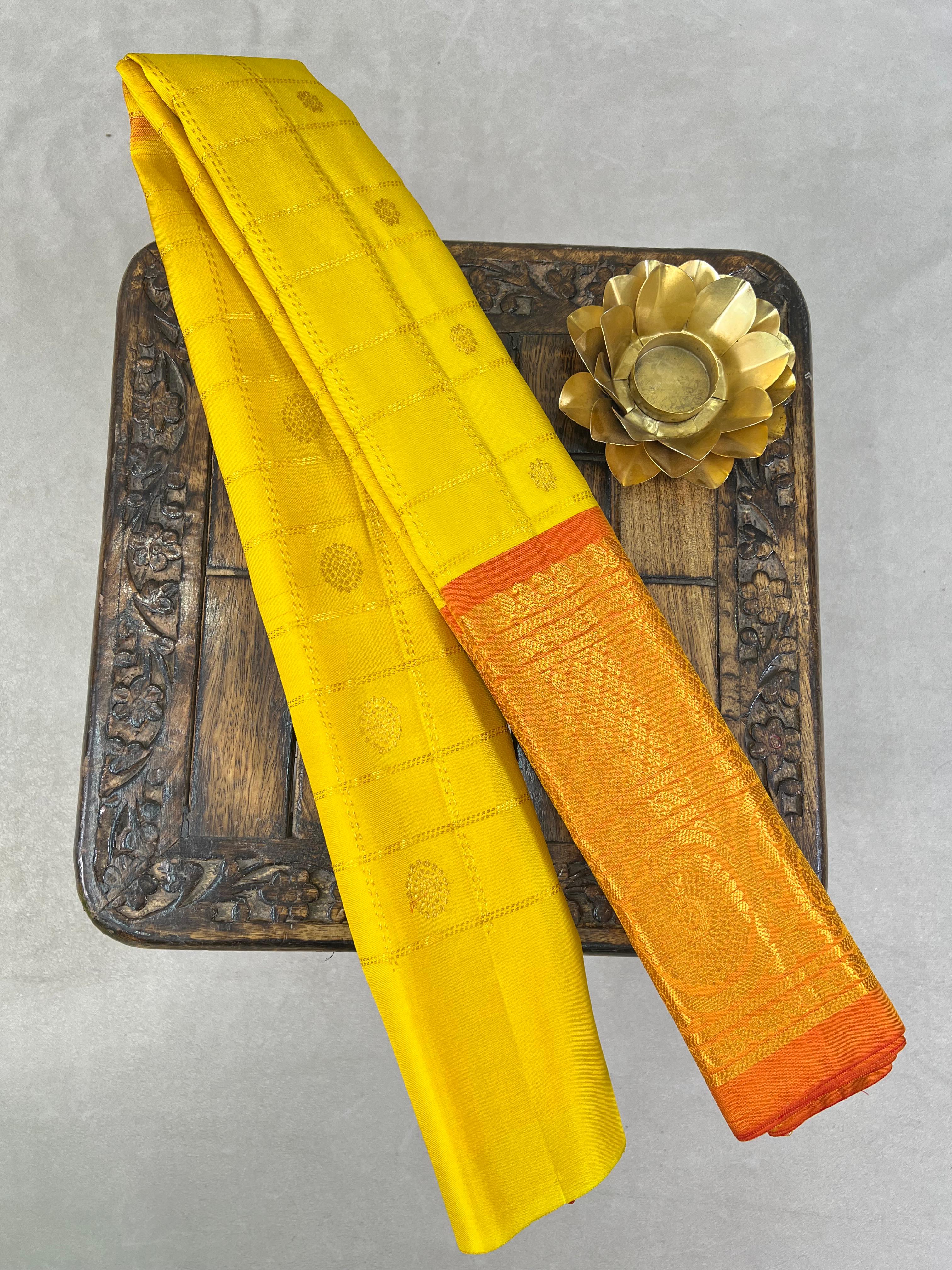 This Gadwal pure silk lehenga comes in yellow with gold checks and buttas. It has a rich orange colour border with gold zari design, paired with a contrast blouse. Silk mark certified for quality and authenticity.
