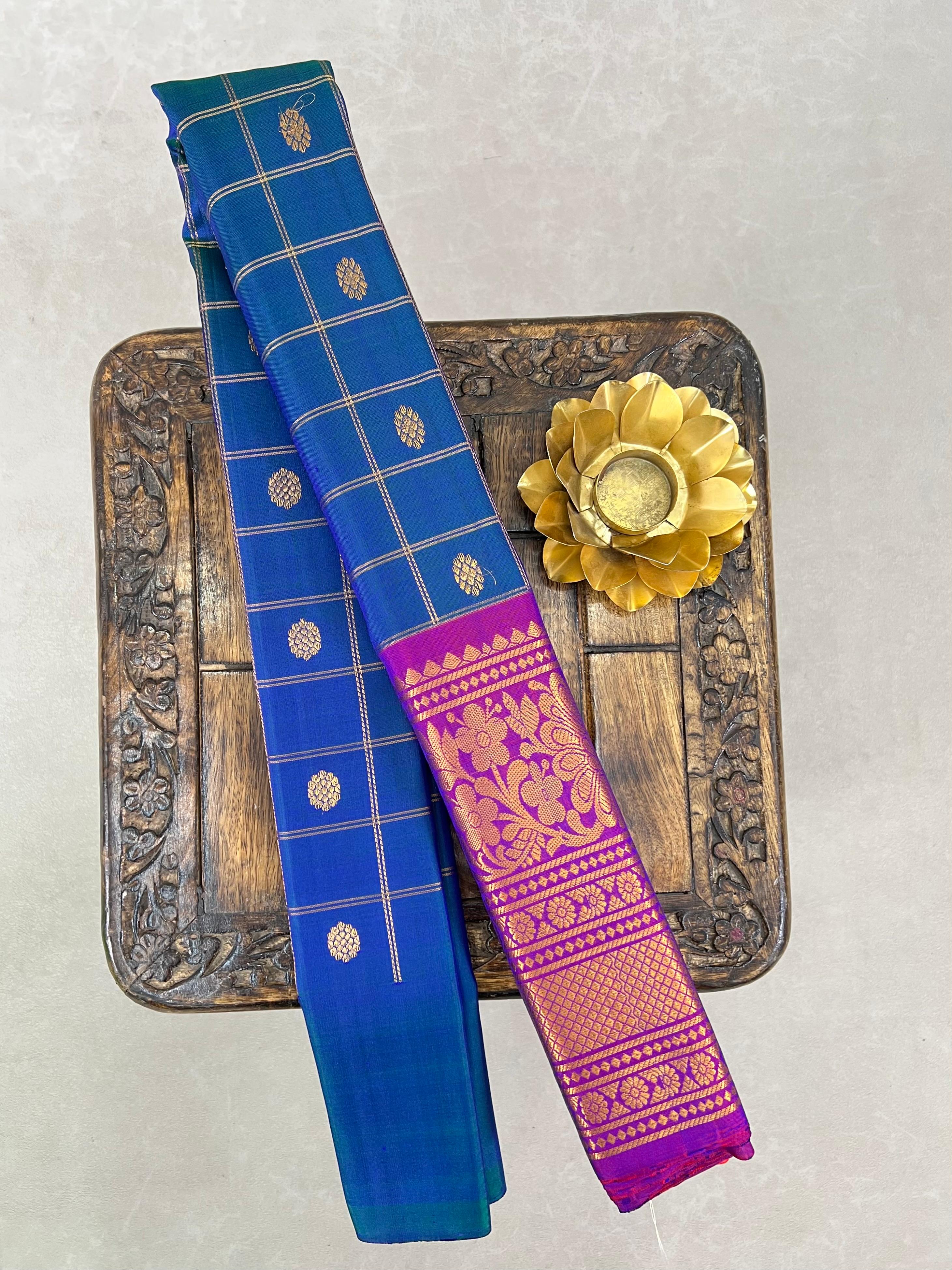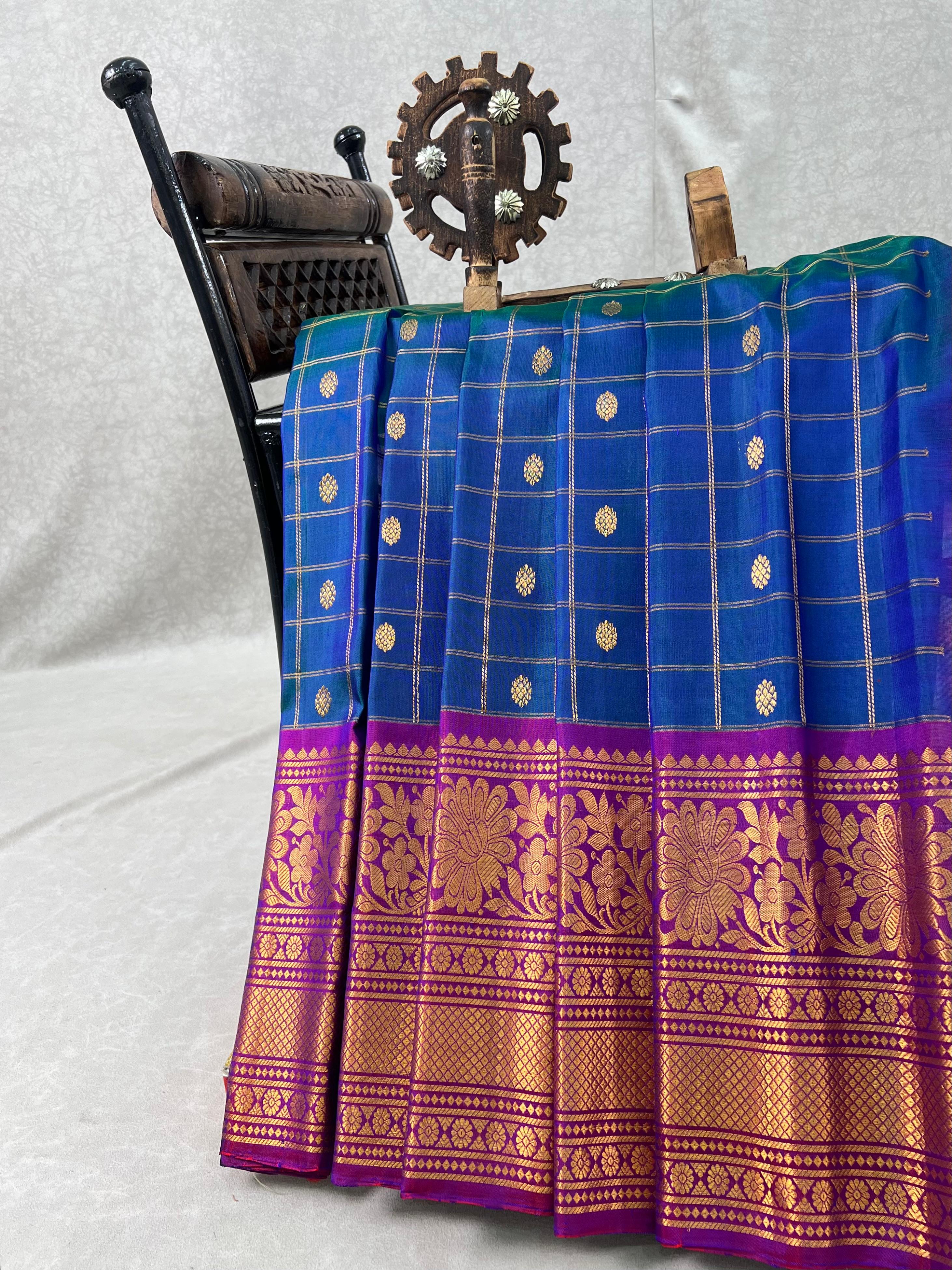 This Gadwal pure silk lehanga is a graceful Rama green body highlighted with a classic checked pattern and delicate gold zari buttas that add subtle shimmer and sophistication. The contrast Magenta border is richly adorned with intricate gold zari detailing, that enhance its regal appeal. The fine weaving, vibrant color combination, and lustrous finish make this lehanga an ideal choice for weddings, festive occasions, and grand celebrations, reflecting heritage charm with a refined aesthetic. It is Silk Mark Certified.