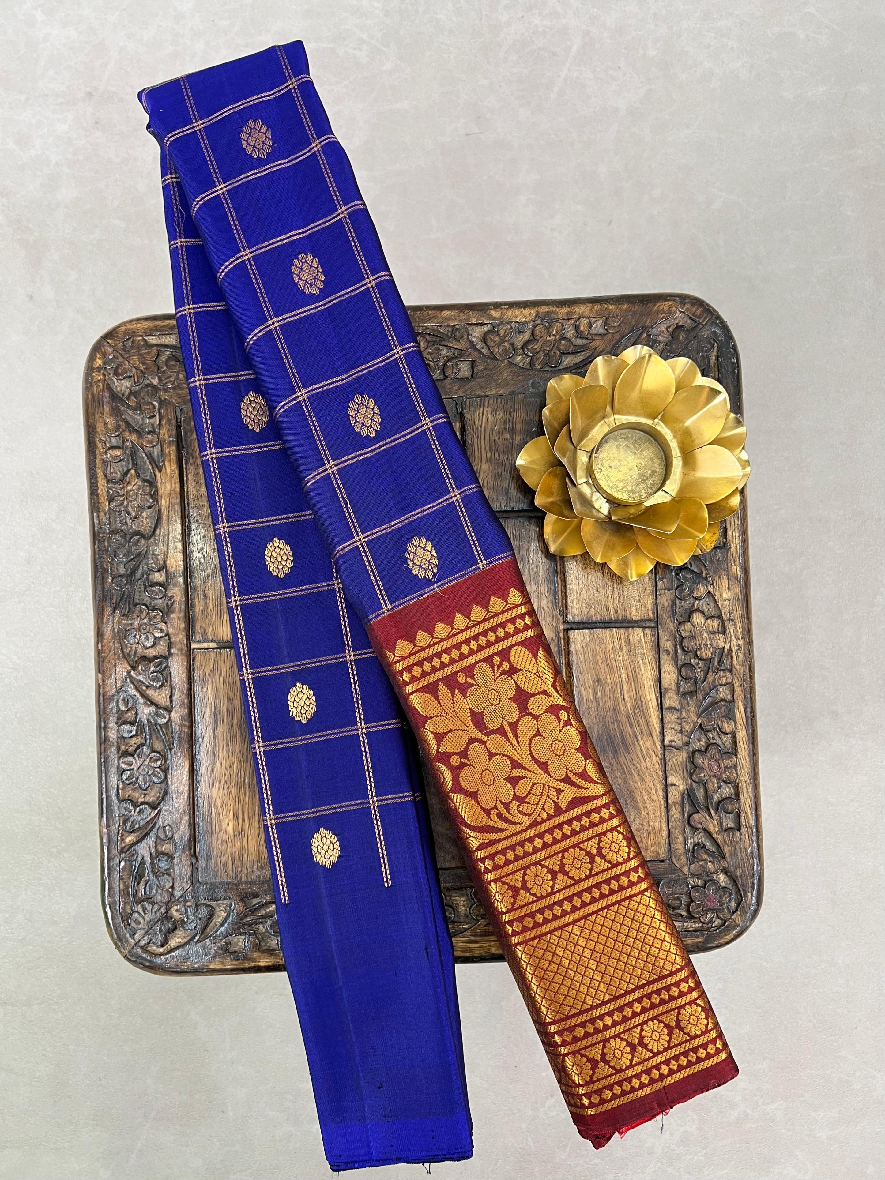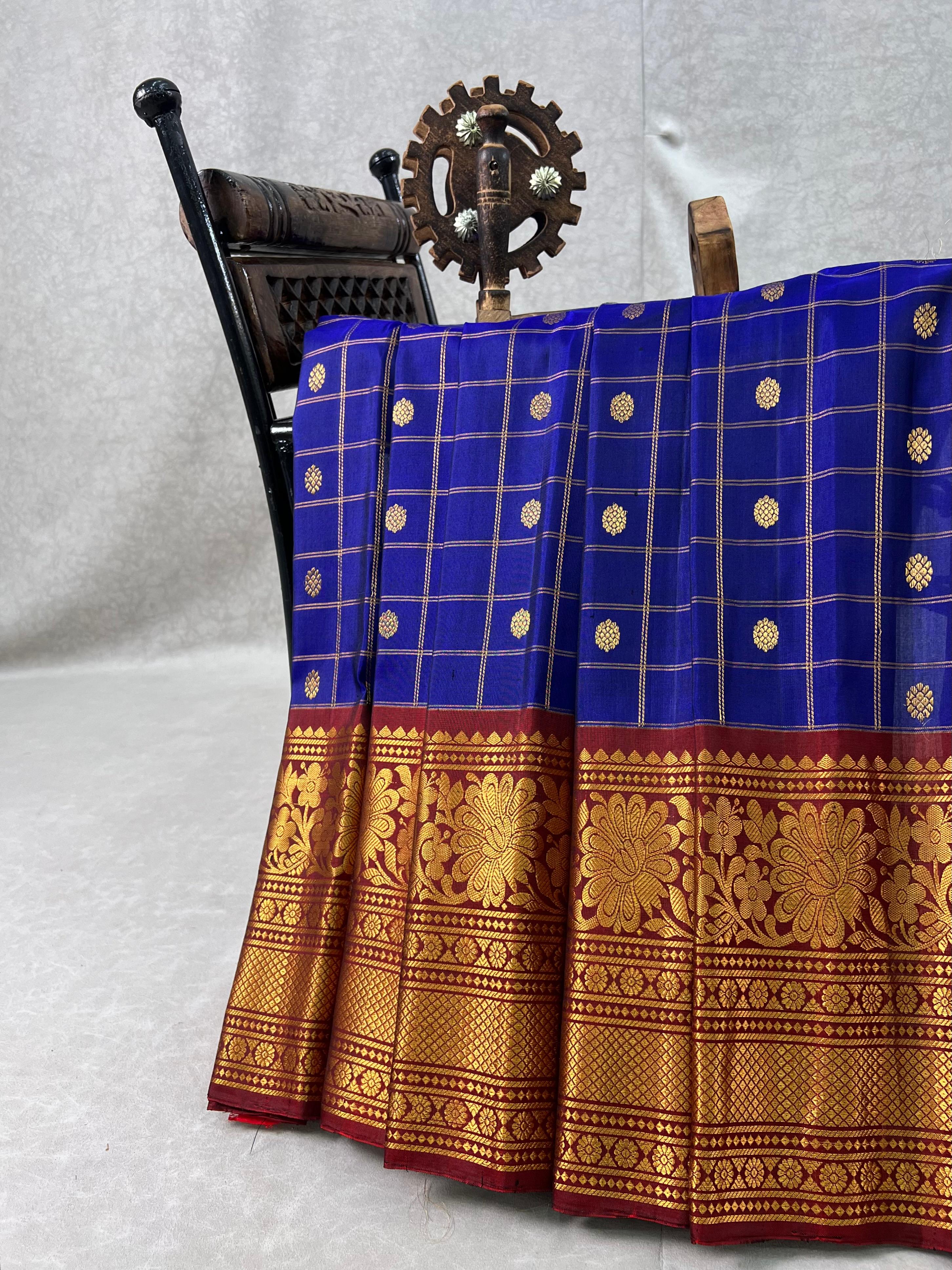 This Gadwal pure silk lehanga is a graceful Rich blue body highlighted with a Zari checked pattern and delicate gold zari buttas that add subtle shimmer and sophistication. The contrast Rust brown border is richly adorned with intricate gold zari detailing, that enhance its regal appeal. The fine weaving, vibrant color combination, and lustrous finish make this lehanga an ideal choice for weddings, festive occasions, and grand celebrations, reflecting heritage charm with a refined aesthetic. It is Silk Mark Certified.