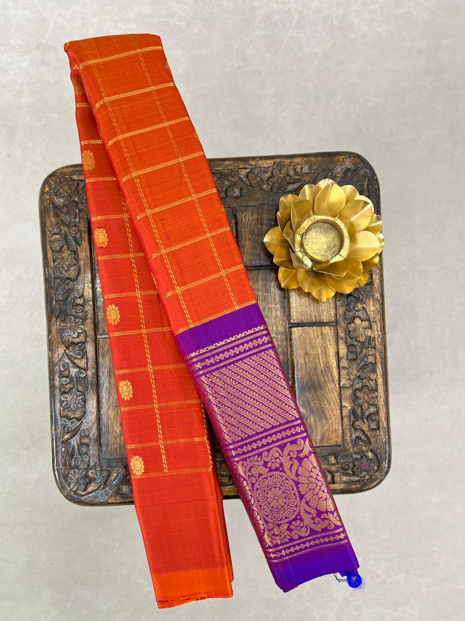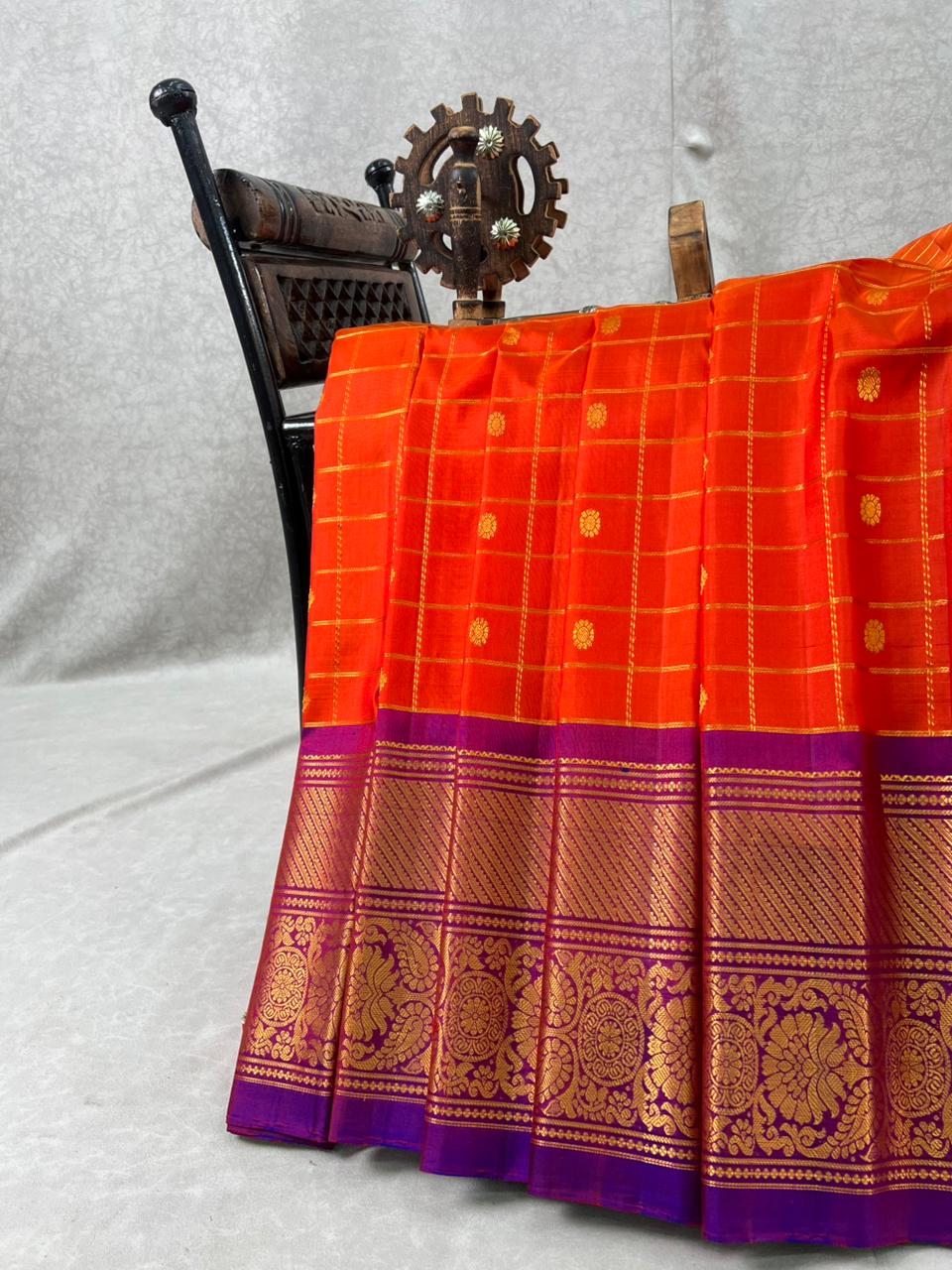 This Gadwal pure silk lehanga is a graceful Orange Body highlighted with a Zari checked pattern and delicate gold zari buttas that add subtle shimmer and sophistication. The contrast Purple border is richly adorned with intricate gold zari detailing, that enhance its regal appeal. The fine weaving, vibrant color combination, and lustrous finish make this lehanga an ideal choice for weddings, festive occasions, and grand celebrations, reflecting heritage charm with a refined aesthetic. It is Silk Mark Certified.