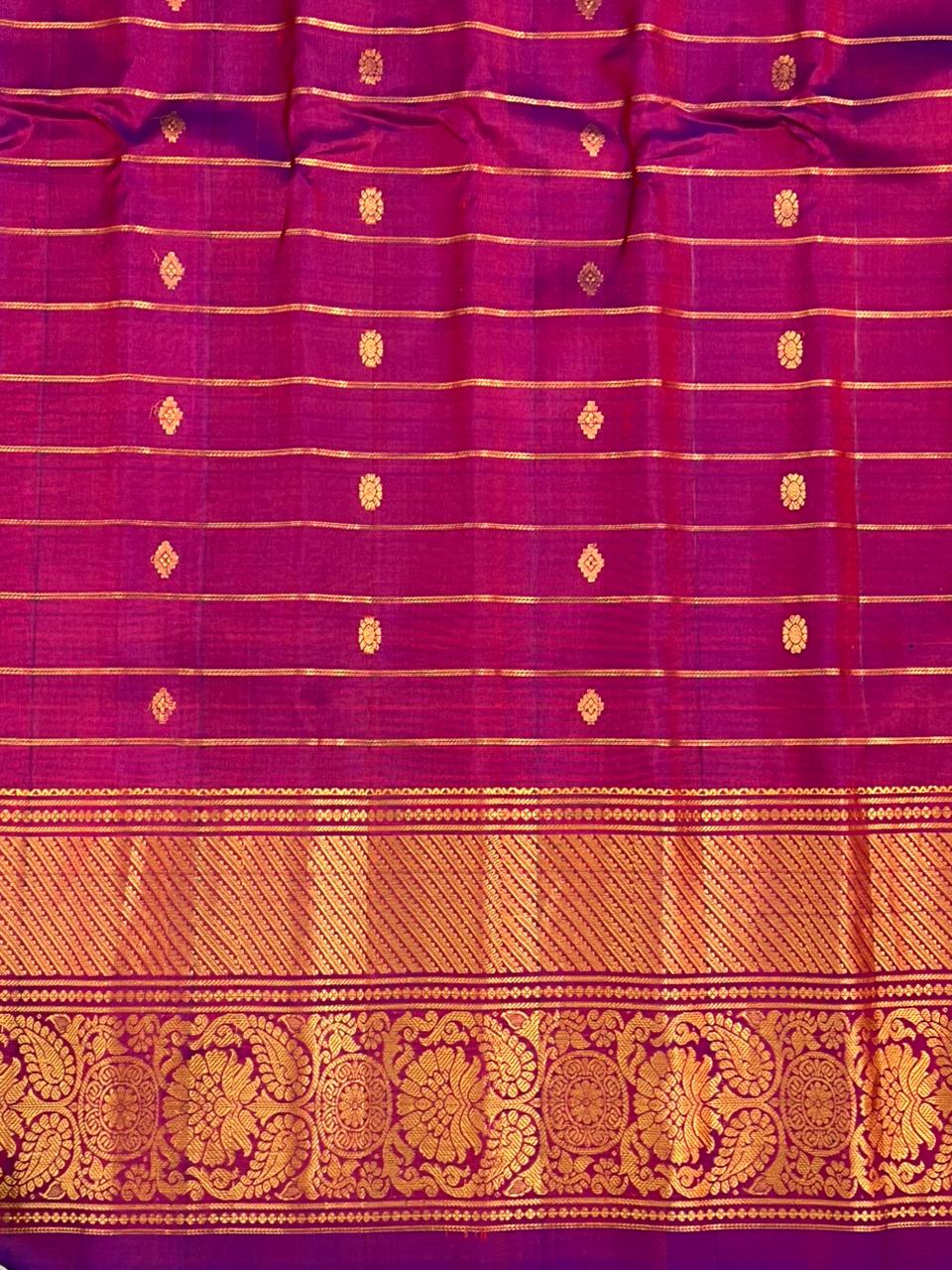 TThis Gadwal pure silk lehanga is a graceful Dual shade mehendi green body highlighted with a classic checked pattern and delicate gold zari buttas that add subtle shimmer and sophistication. The contrast Magenta border is richly adorned with intricate gold zari detailing, that enhance its regal appeal. The fine weaving, vibrant color combination, and lustrous finish make this lehanga an ideal choice for weddings, festive occasions, and grand celebrations, reflecting heritage charm with a refined aesthetic. It is Silk Mark Certified.