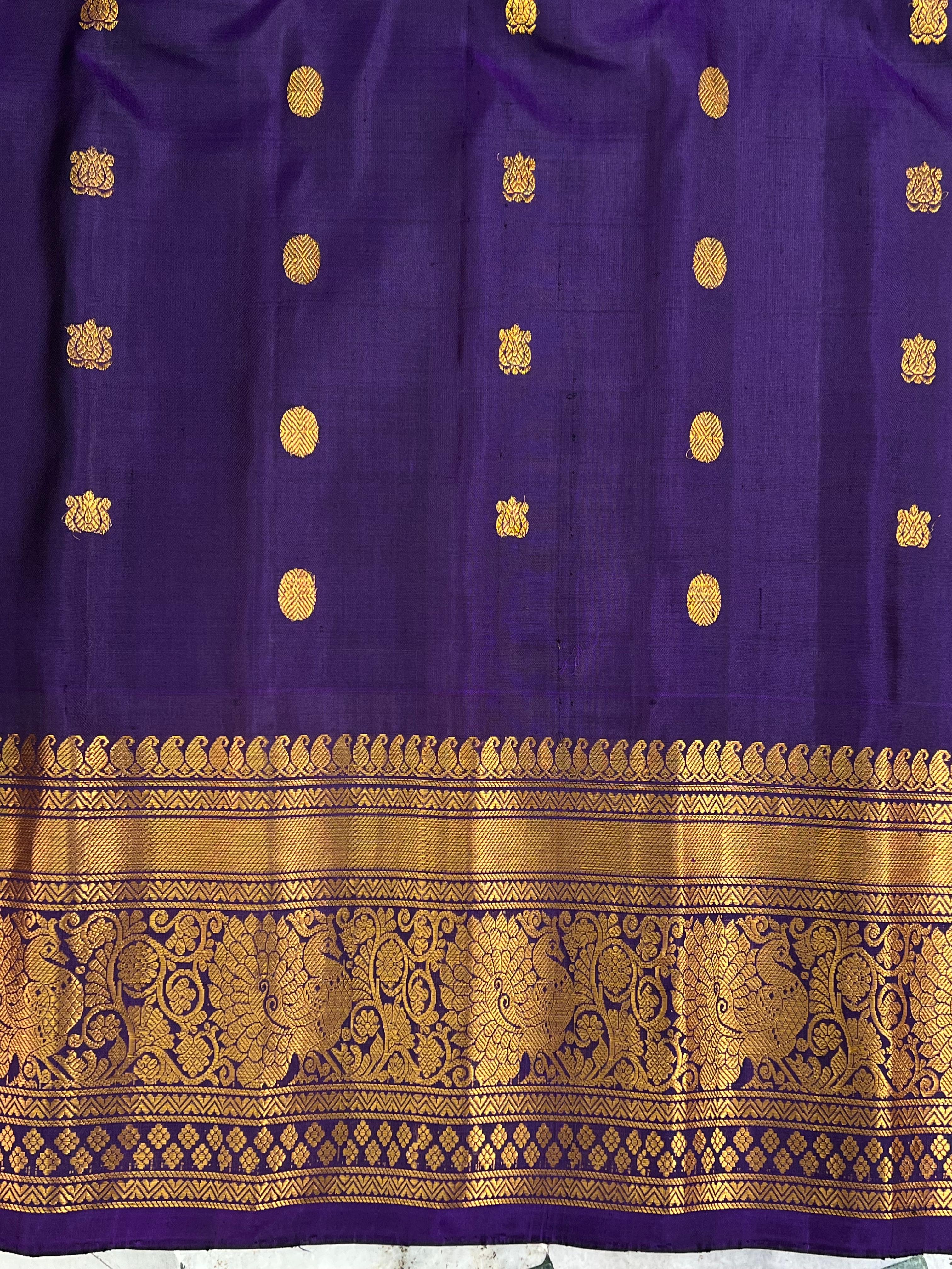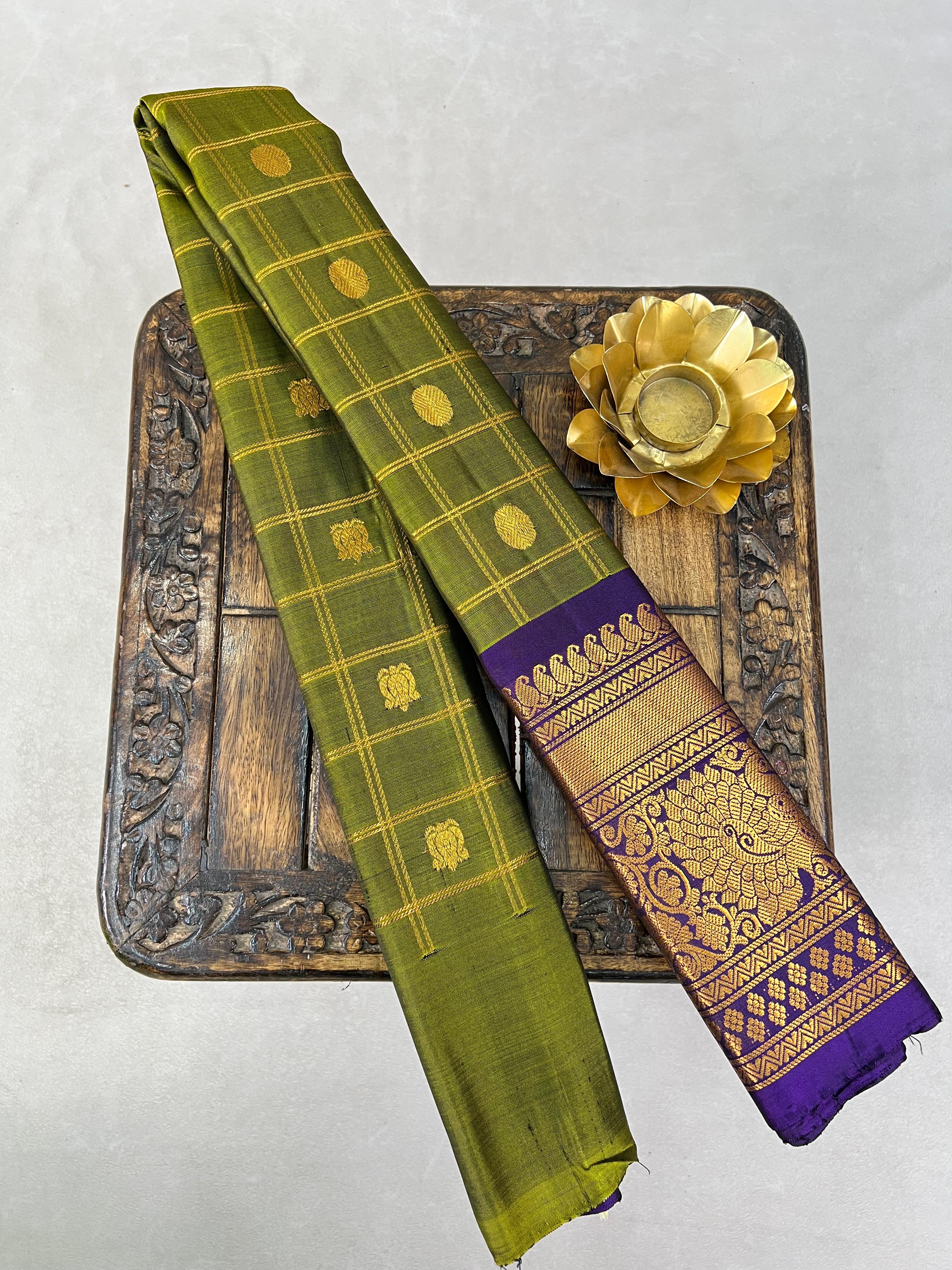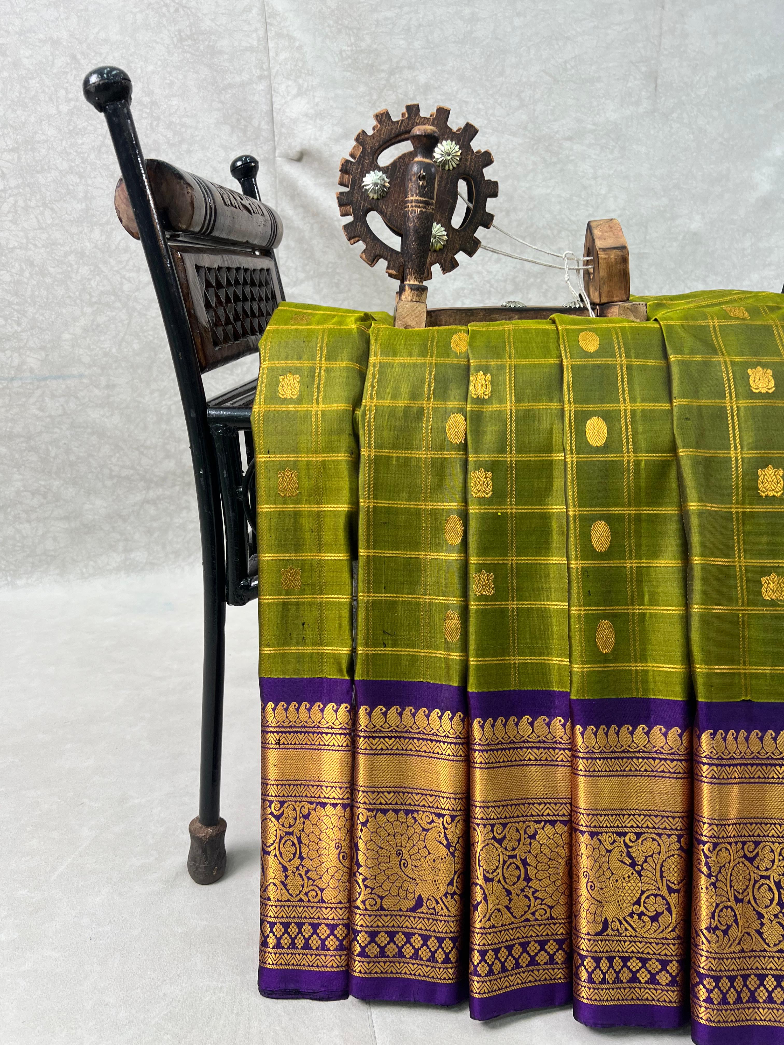 This Gadwal pure silk lehenga comes in green colour with gold checks and buttas. It has a rich royal blue colour border with gold zari design, paired with a contrast blouse. Silk mark certified for quality and authenticity.
