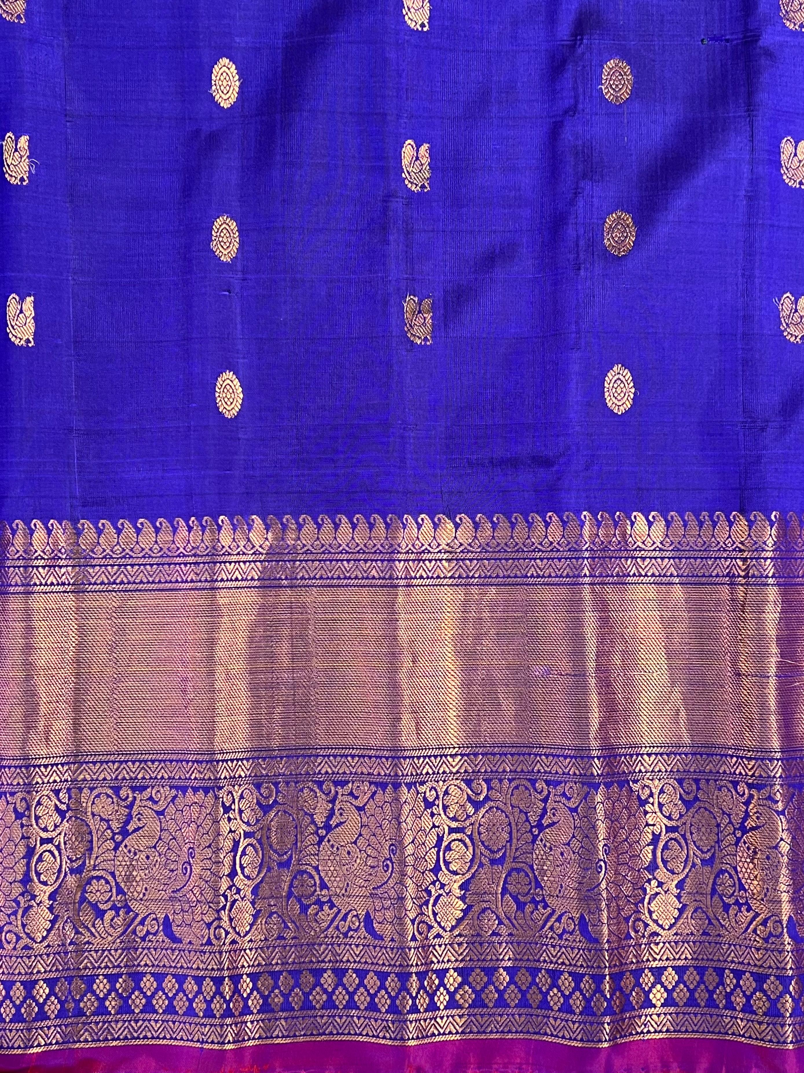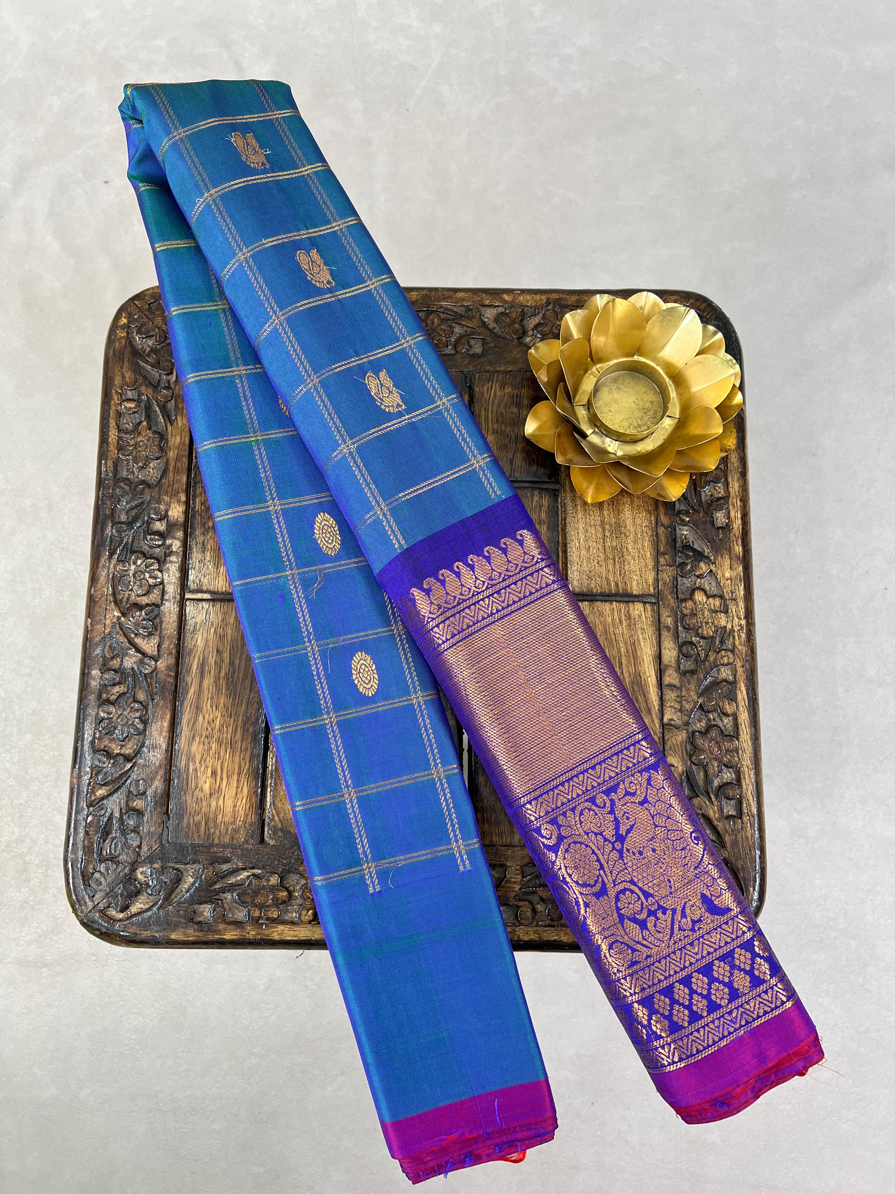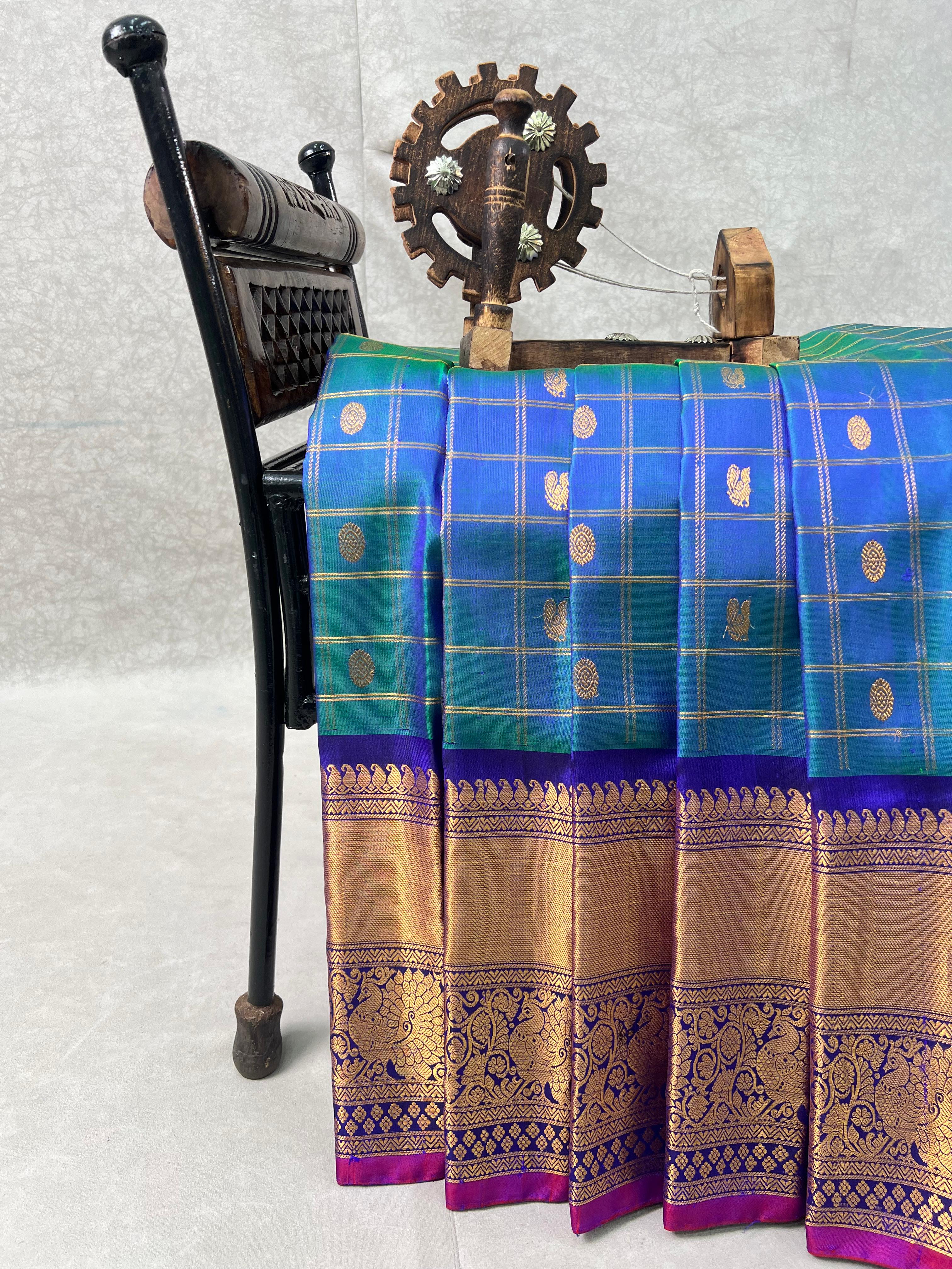 This Gadwal pure silk lehenga comes in peacock blue colour with gold checks and buttas. It has a rich royal blue colour border with gold zari design and with purple selvedge, paired with a contrast blouse. Silk mark certified for quality and authenticity.