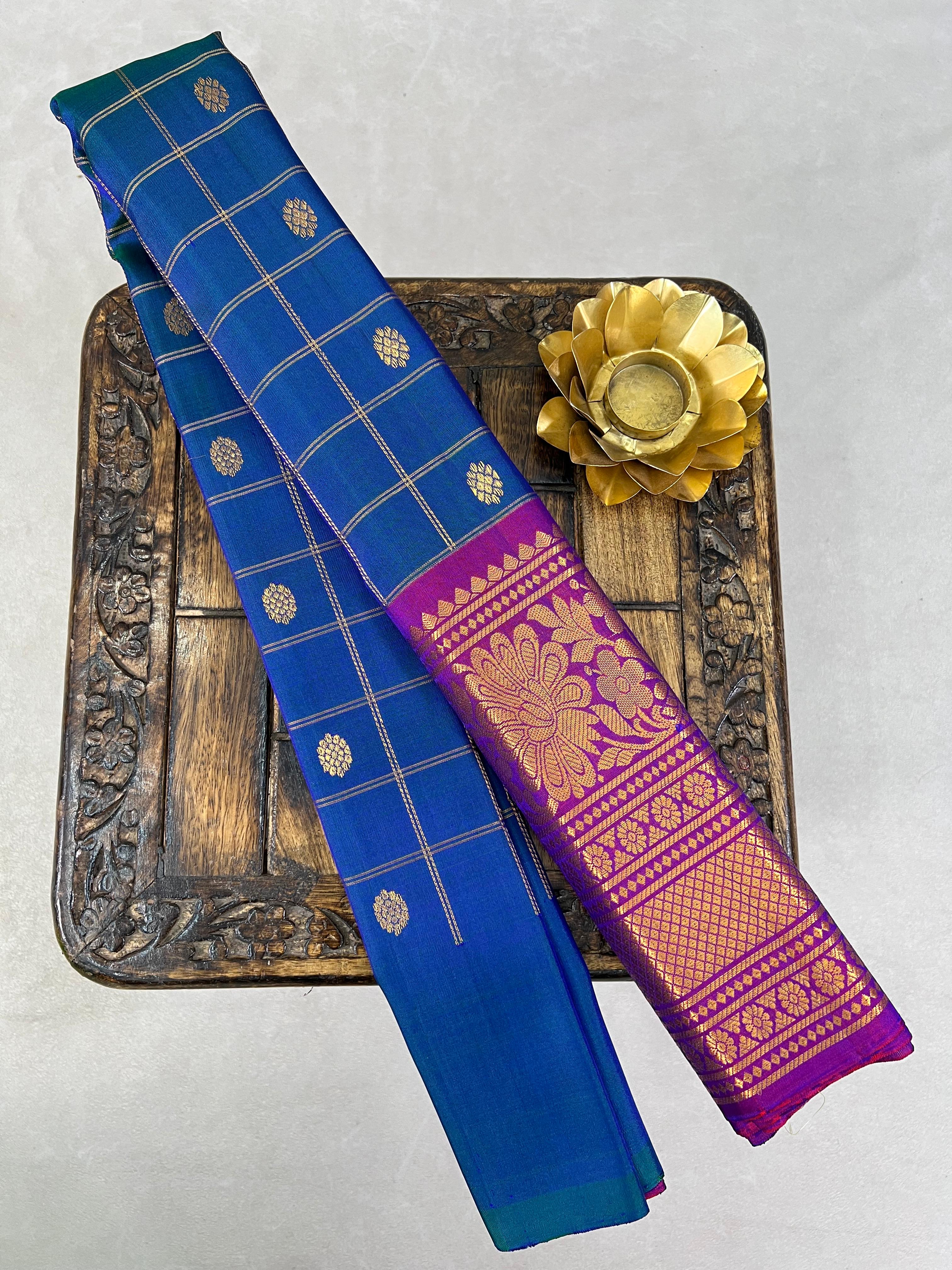 This Gadwal pure silk lehenga comes in royal blue colour with gold checks and buttas. It has a rich purple colour border with gold zari design, paired with a contrast blouse. Silk mark certified for quality and authenticity.