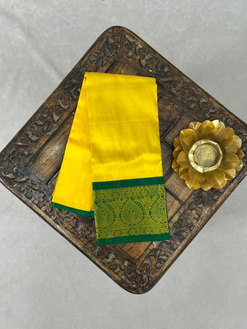 This beautiful Kanchi Pure Silk Handloom Kids Lehenga Set is designed for ages 1-2 years, comes in 20 Size and featuring a Lemon Yellow skirt adorned and paired with a rich gold zari border highlighted by a striking Green kuttu border panel with intricate floral weaving. It comes with Contrast blouse, that enhances the overall festive appeal, making it a perfect choice for all vacations. This lehenga blends elegance, tradition, and premium craftsmanship, and it is Silk Mark certified.