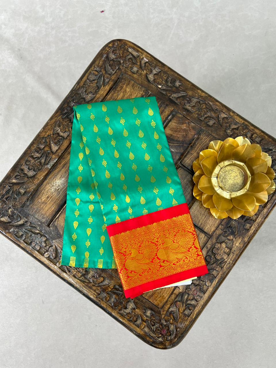 This beautiful Kanchi Pure Silk Handloom Kids Lehenga Set is designed for ages 1-2 years, comes in 20 Size and featuring a Green skirt adorned with delicate gold butti and paired with a rich gold zari border highlighted by a striking Red kuttu border panel with intricate floral weaving. It comes with Contrast blouse, that enhances the overall festive appeal, making it a perfect choice for all vacations. This lehenga blends elegance, tradition, and premium craftsmanship, and it is Silk Mark certified.