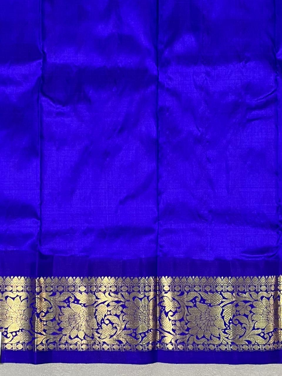 This beautiful Kanchi Pure Silk Handloom Kids Lehenga Set is designed for ages 1-2 years, comes in 20 Size and featuring a Ice blue skirt adorned with delicate gold butti and paired with a rich gold zari border highlighted by a striking Blue kuttu border panel with intricate floral weaving. It comes with Contrast blouse, that enhances the overall festive appeal, making it a perfect choice for all vacations. This lehenga blends elegance, tradition, and premium craftsmanship, and it is Silk Mark certified.