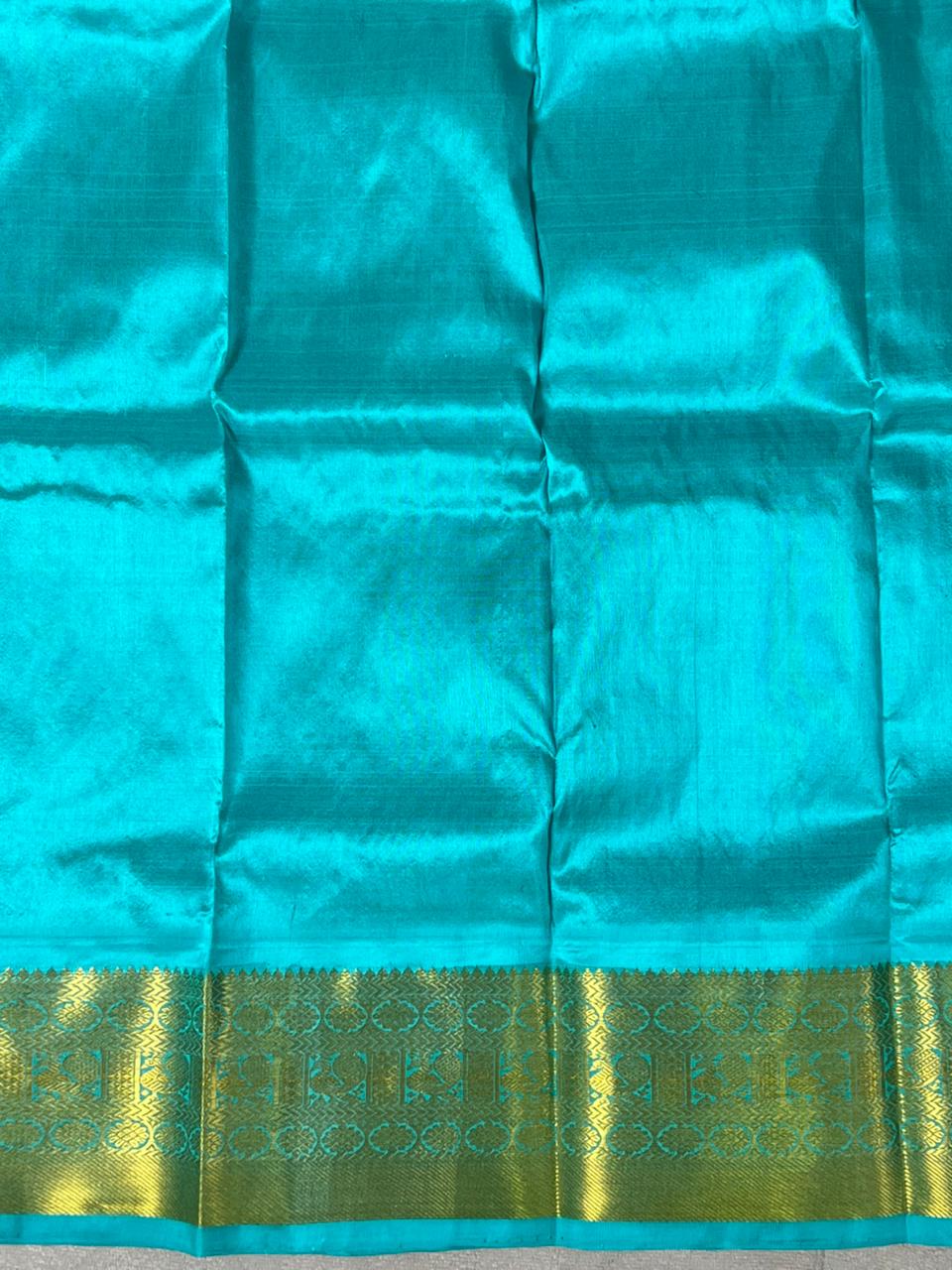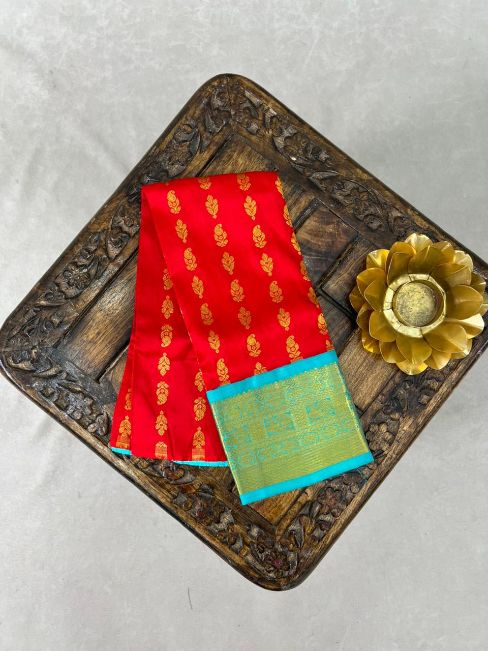 This beautiful Kanchi Pure Silk Handloom Kids Lehenga Set is designed for ages 1-2 years, comes in 20 Size and featuring a Red skirt adorned with delicate gold butti and paired with a rich gold zari border highlighted by a striking Light sea green kuttu border panel with intricate floral weaving. It comes with Contrast blouse, that enhances the overall festive appeal, making it a perfect choice for all vacations. This lehenga blends elegance, tradition, and premium craftsmanship, and it is Silk Mark certified.