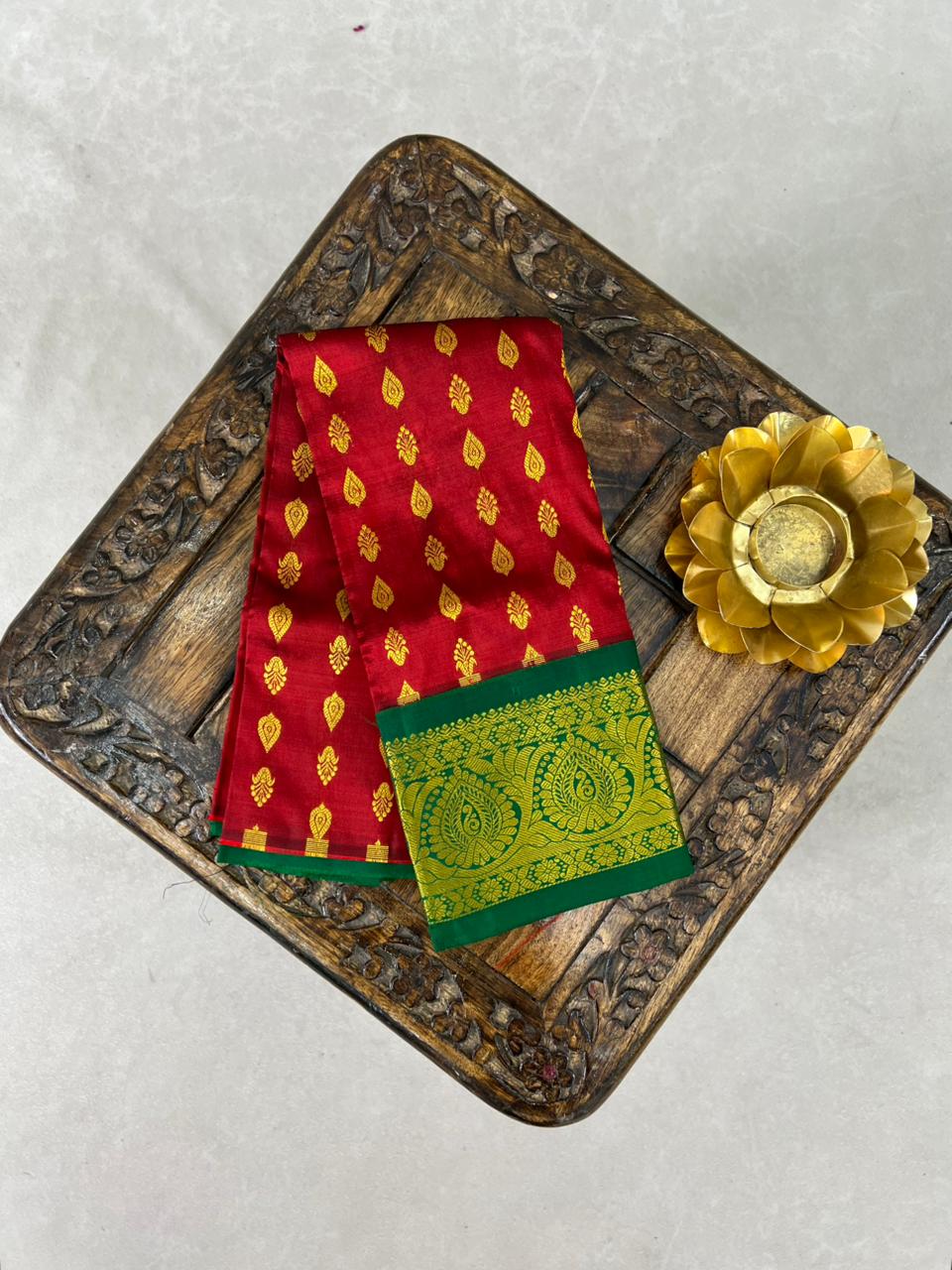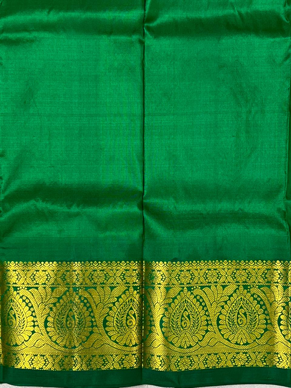This beautiful Kanchi Pure Silk Handloom Kids Lehenga Set is designed for ages 1-2 years, comes in 20 Size and featuring a Maroon skirt adorned with delicate gold butti and paired with a rich gold zari border highlighted by a striking Green kuttu border panel with intricate floral weaving. It comes with Contrast blouse, that enhances the overall festive appeal, making it a perfect choice for all vacations. This lehenga blends elegance, tradition, and premium craftsmanship, and it is Silk Mark certified.