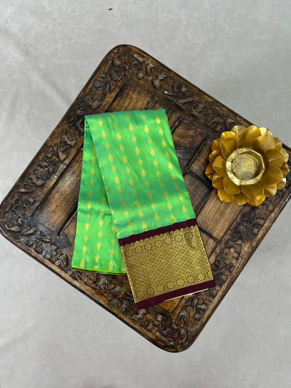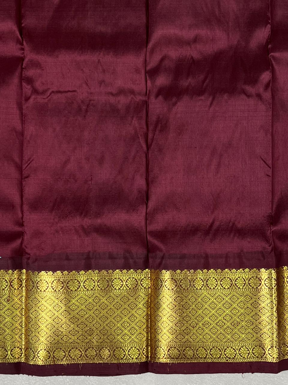 This beautiful Kanchi Pure Silk Handloom Kids Lehenga Set is designed for ages 1-2 years, comes in 20 Size and featuring a Parrot green skirt adorned with delicate gold butti and paired with a rich gold zari border highlighted by a striking Dark chocolate kuttu border panel with intricate floral weaving. It comes with Contrast blouse, that enhances the overall festive appeal, making it a perfect choice for all vacations. This lehenga blends elegance, tradition, and premium craftsmanship, and it is Silk Mark certified.