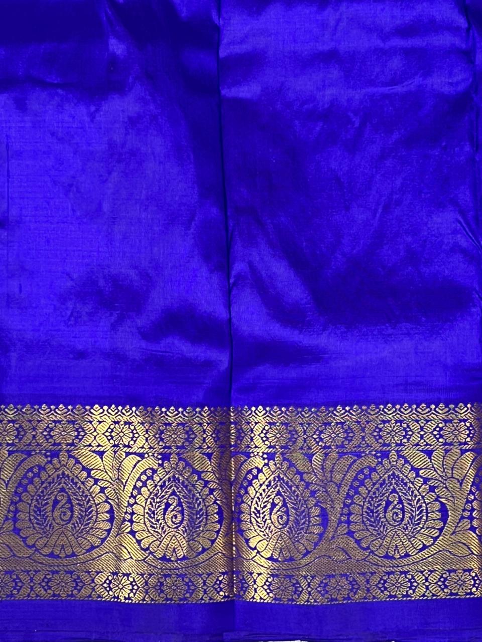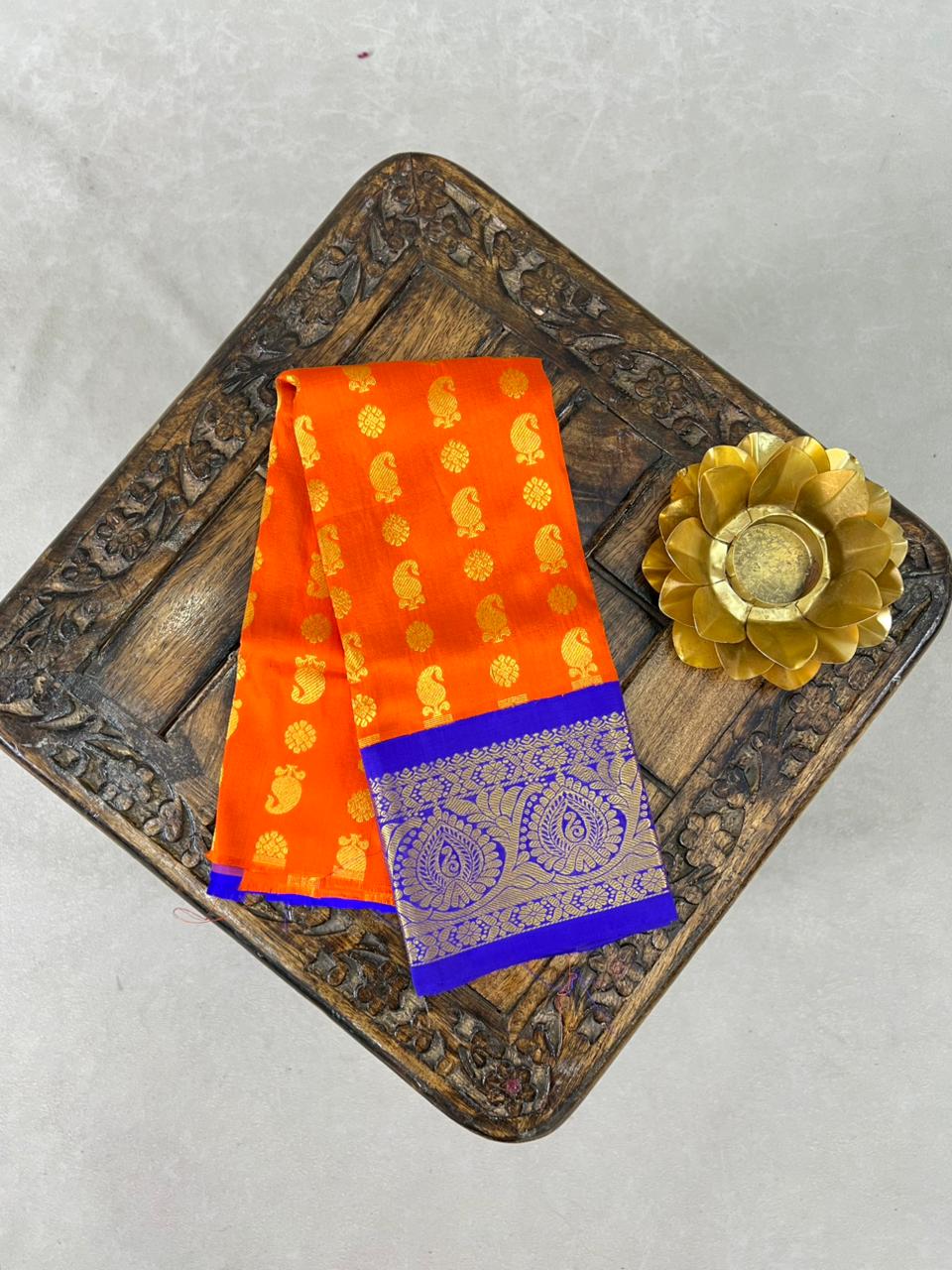 This beautiful Kanchi Pure Silk Handloom Kids Lehenga Set is designed for ages 1-2 years, comes in 20 Size and featuring a Bright Orange skirt adorned with delicate gold butti and paired with a rich gold zari border highlighted by a striking Blue border panel with intricate floral weaving. It comes with Contrast blouse, that enhances the overall festive appeal, making it a perfect choice for all vacations. This lehenga blends elegance, tradition, and premium craftsmanship, and it is Silk Mark certified.