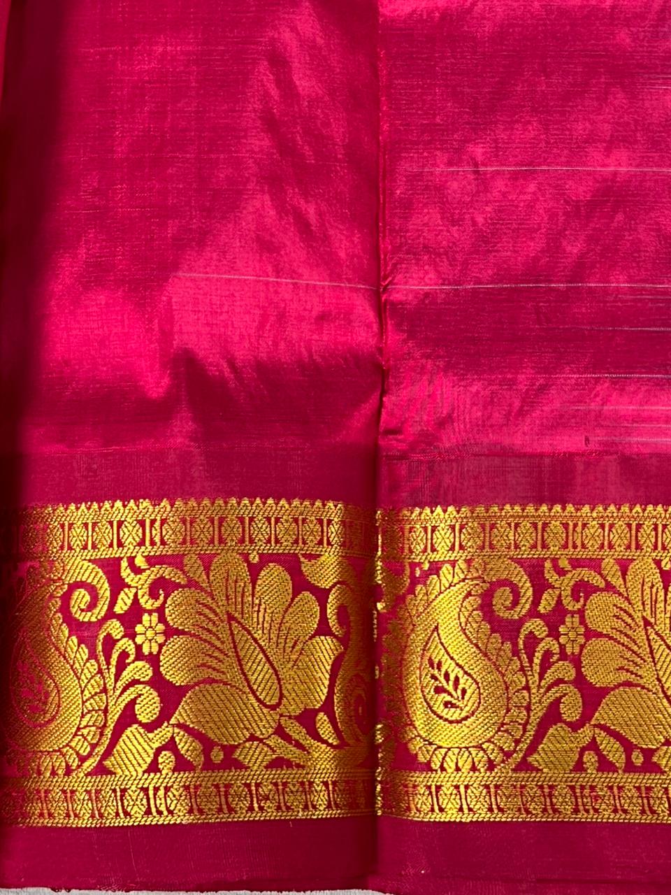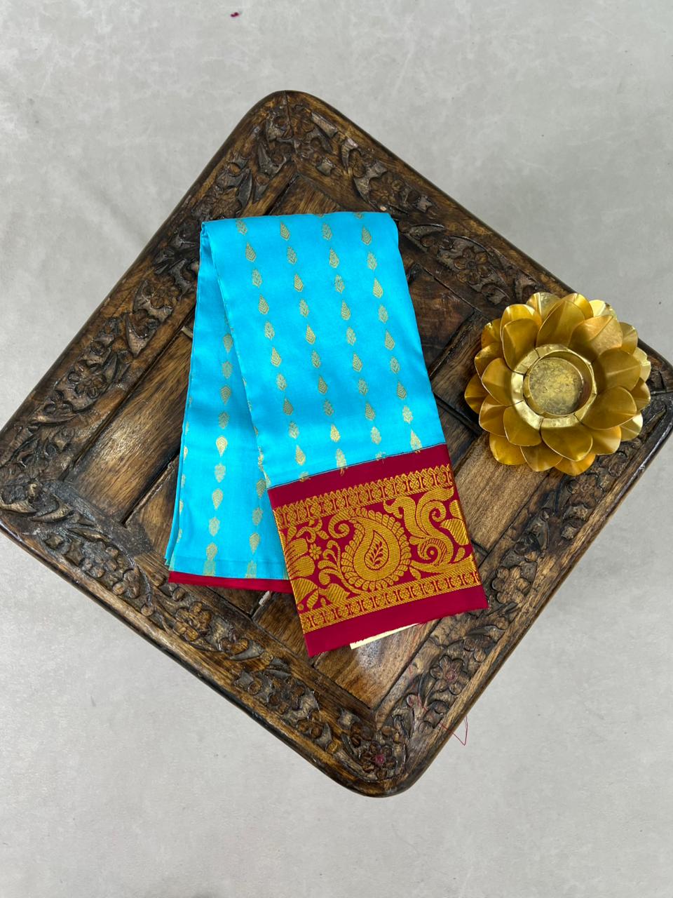 This beautiful Kanchi Pure Silk Handloom Kids Lehenga Set is designed for ages 1-2 years, comes in 20 Size and featuring a Sky blue skirt adorned with delicate gold butti and paired with a rich gold zari border highlighted by a striking Maroon border panel with intricate floral weaving. It comes with Contrast blouse, that enhances the overall festive appeal, making it a perfect choice for all vacations. This lehenga blends elegance, tradition, and premium craftsmanship, and it is Silk Mark certified.