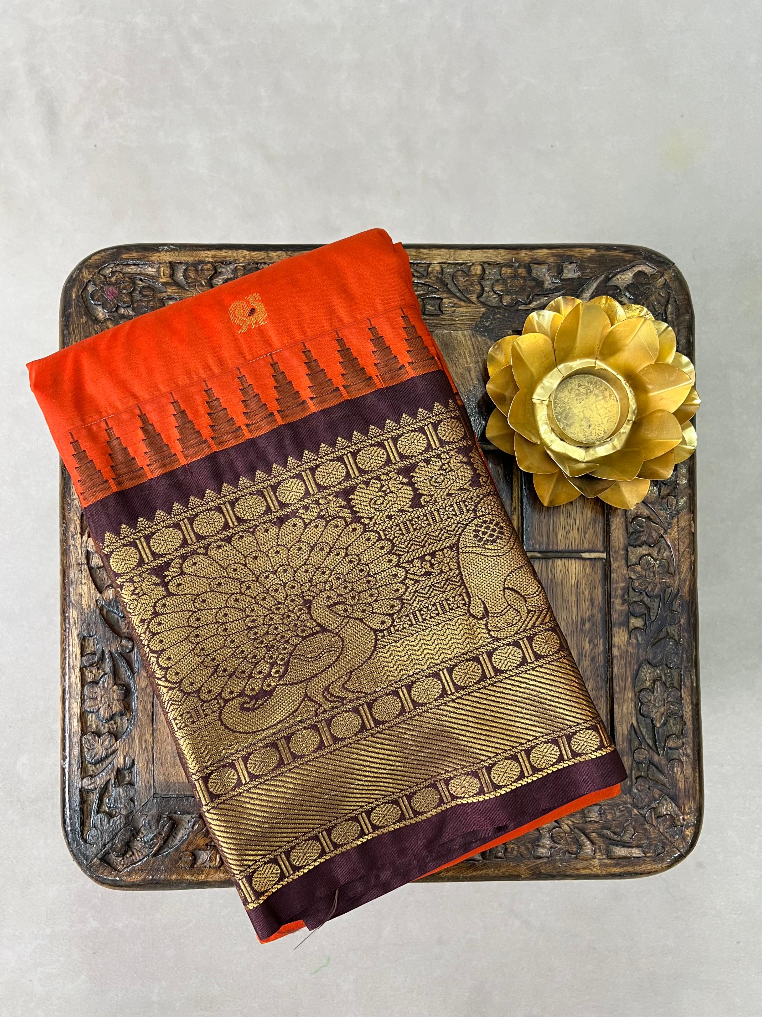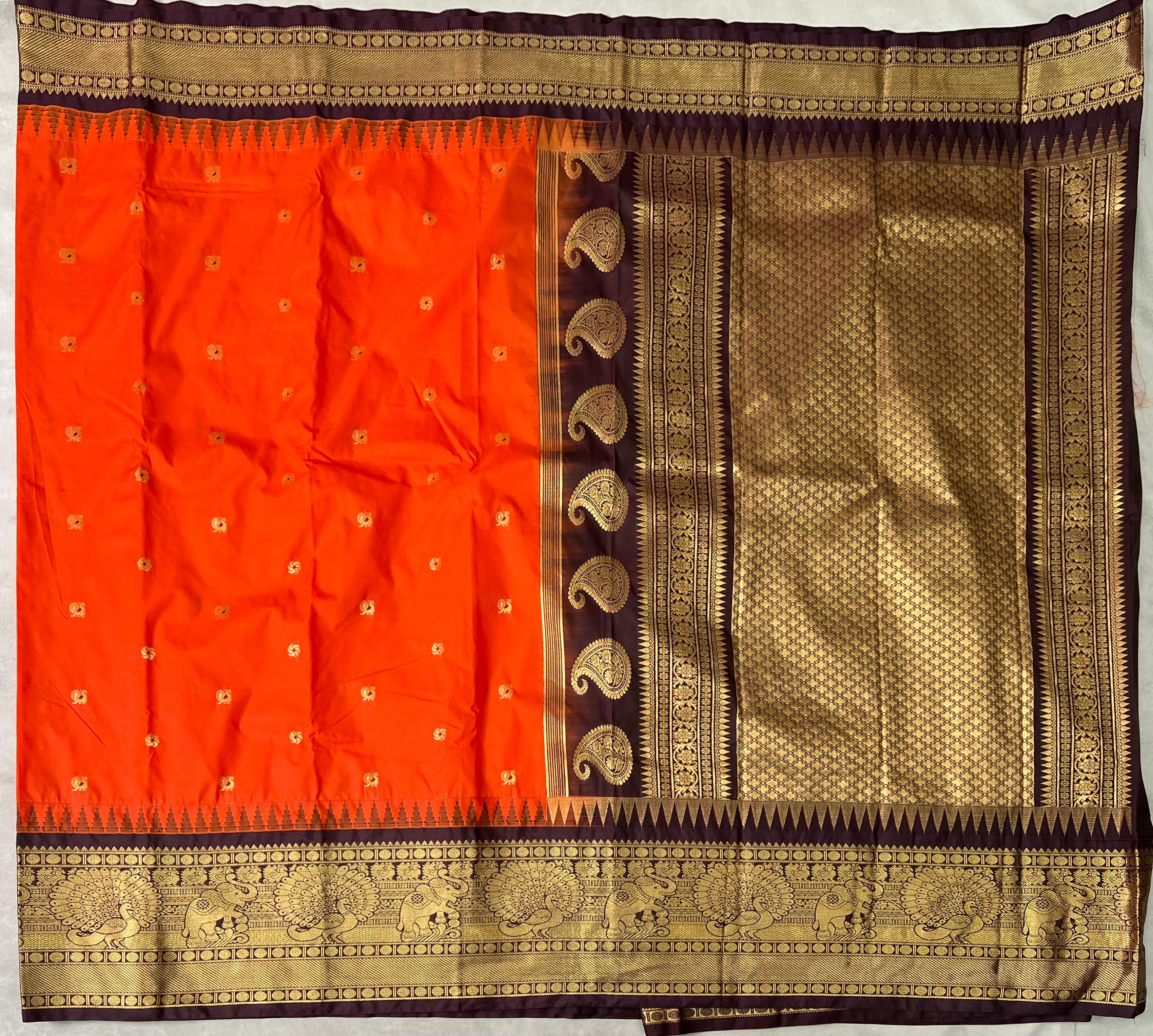 This stunning semi Gadwal saree showcases a vibrant rust colour body with subtle gold zari  meena motifs and a rich brow zari border adorned with intricate golden patterns. The perfect blend of tradition and elegance, it’s ideal for festive occasions and special celebrations, reflecting the classic charm and craftsmanship of Gadwal weaving. Comes with contrast blouse.