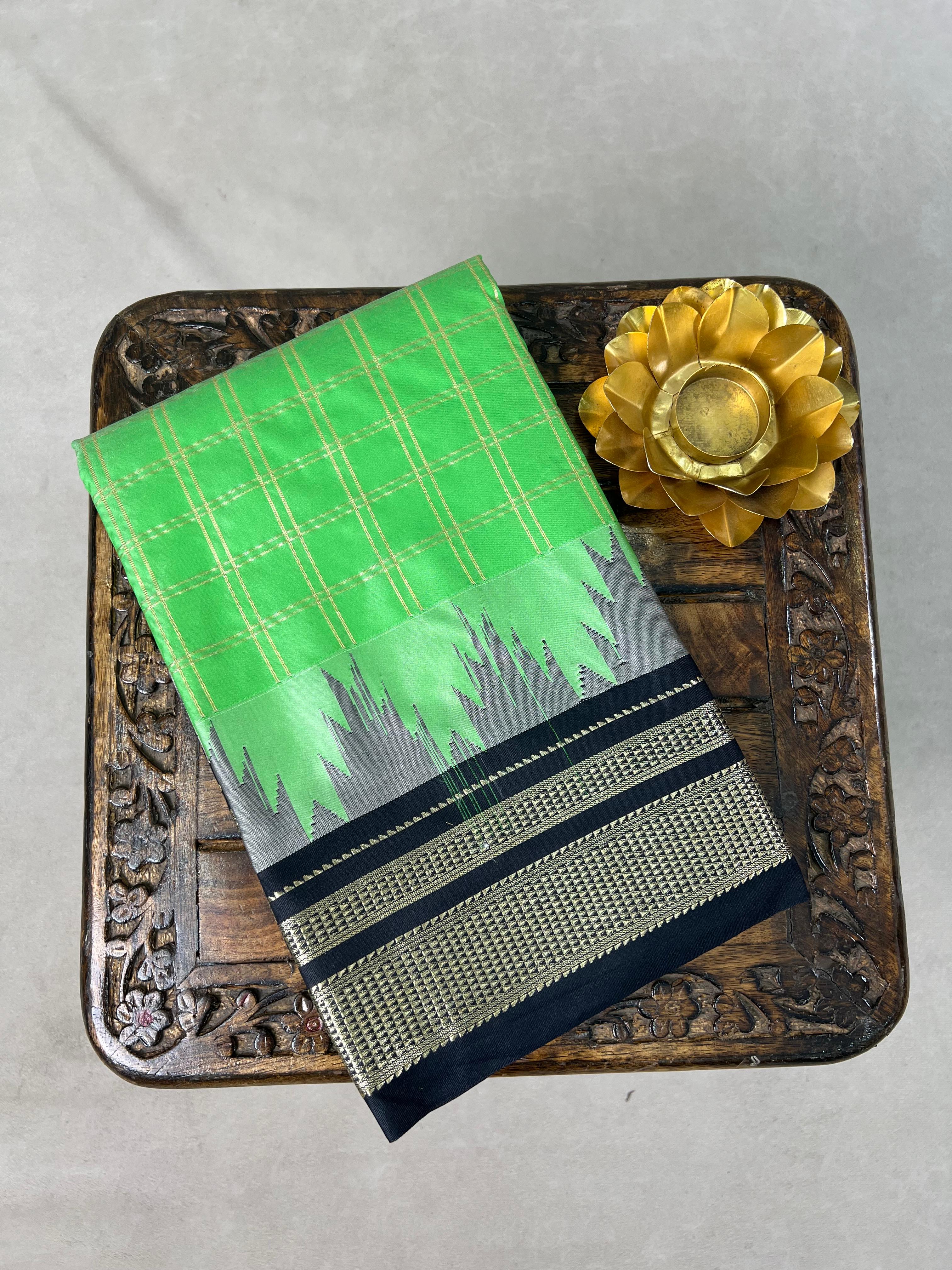This stunning semi gadwal Ilkal saree showcases a vibrant pista green colour body with subtle gold zari checks and a rich black zari ilkal border adorned with intricate gold patterns. The perfect blend of tradition and elegance, it’s ideal for festive occasions and special celebrations, reflecting the classic charm and craftsmanship of Gadwal weaving. Comes with contrast blouse.