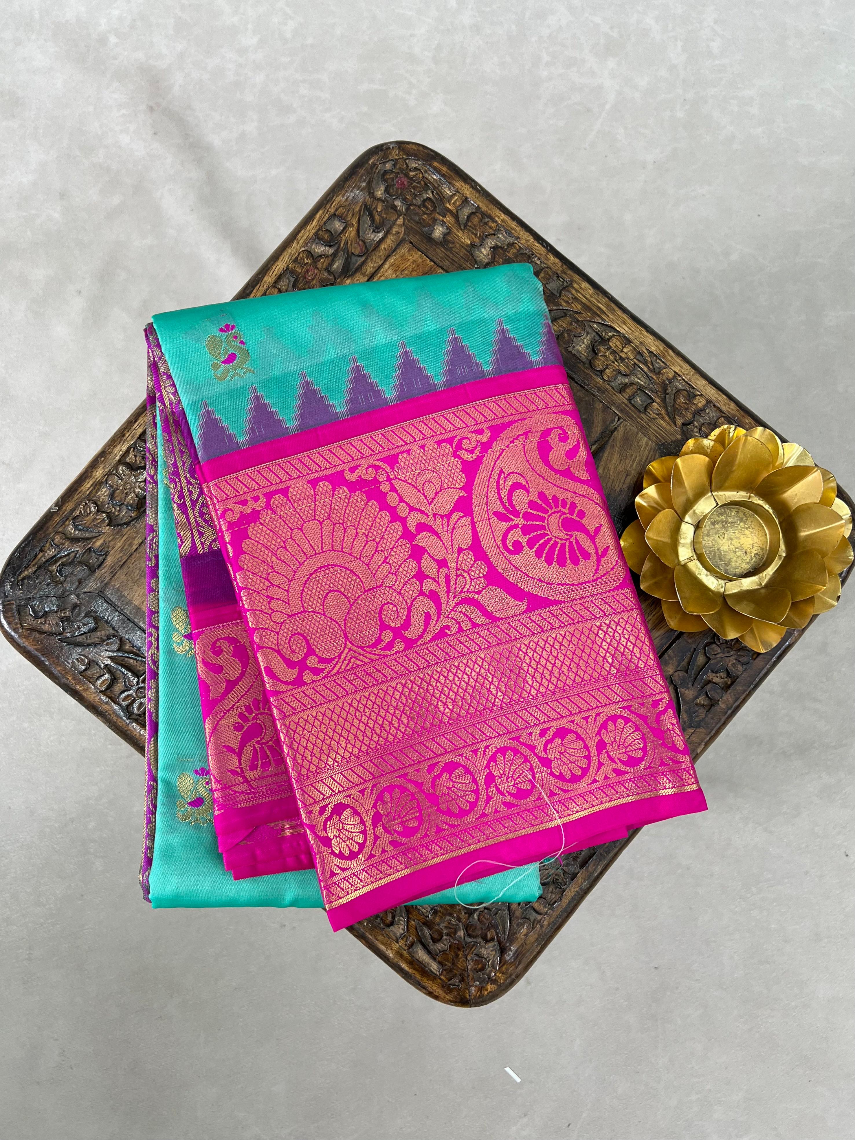This stunning Semi Gadwal Saree showcases a light Seafoam green body with subtle gold zari meenakari buttas and a Pink border adorned with intricate golden zari detailing. The perfect blend of tradition and elegance, it’s ideal for festive occasions and special celebrations, reflecting the classic charm and craftsmanship of Gadwal weaving. This saree comes with contrast blouse, and it is Silk Mark Certified.