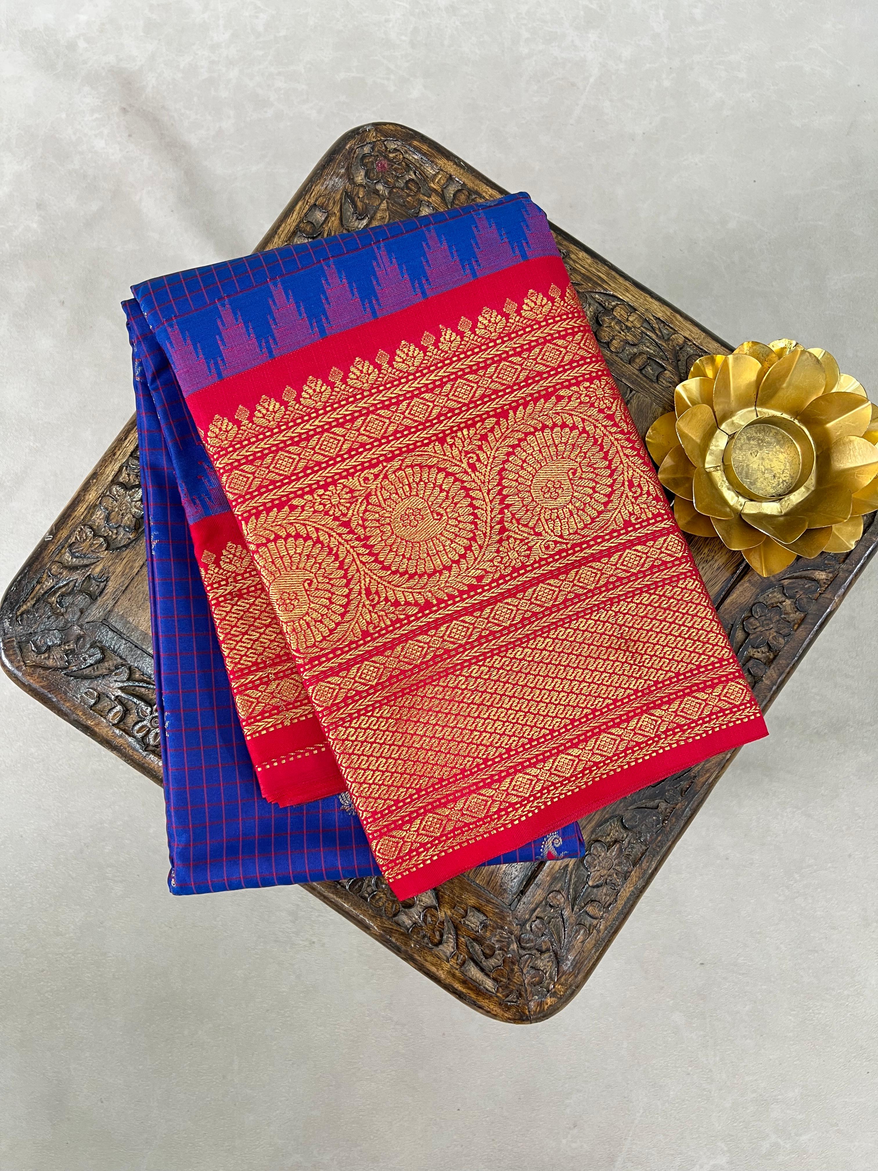 This stunning Semi Gadwal Saree features a dark Blue body with subtle red checks and gold zari meenakari buttas, complemented by red border adorned with intricate golden zari detailing. Blending tradition with elegance, it is perfect for festive occasions and special celebrations, beautifully reflecting the classic charm and craftsmanship of Gadwal weaving. This saree comes with a contrast blouse and is Silk Mark certified.