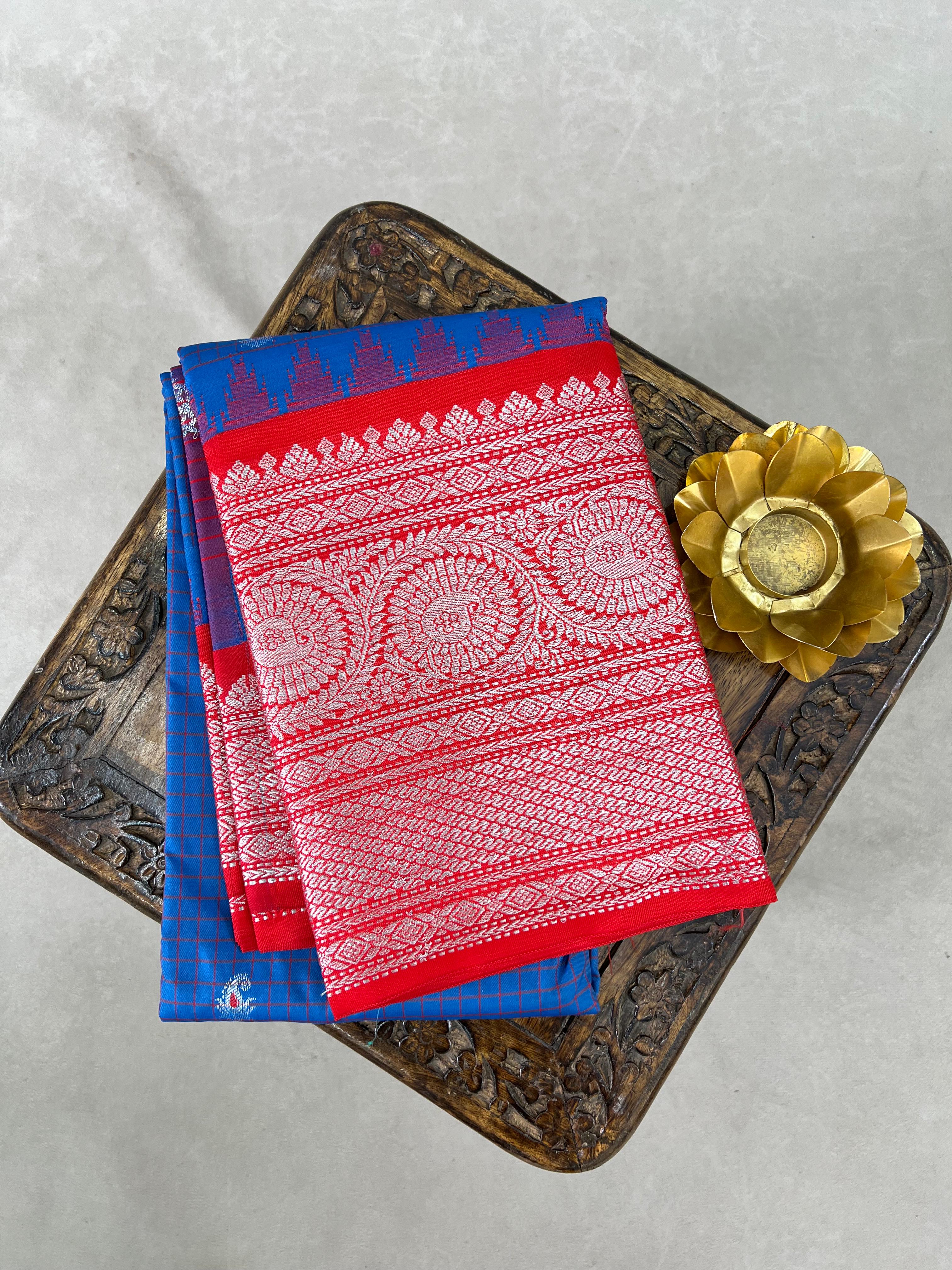 This stunning Semi Gadwal Saree features a dark Blue body with subtle red checks and silver zari meenakari buttas, complemented by red border adorned with intricate silver zari detailing. Blending tradition with elegance, it is perfect for festive occasions and special celebrations, beautifully reflecting the classic charm and craftsmanship of Gadwal weaving. This saree comes with a contrast blouse and is Silk Mark certified.