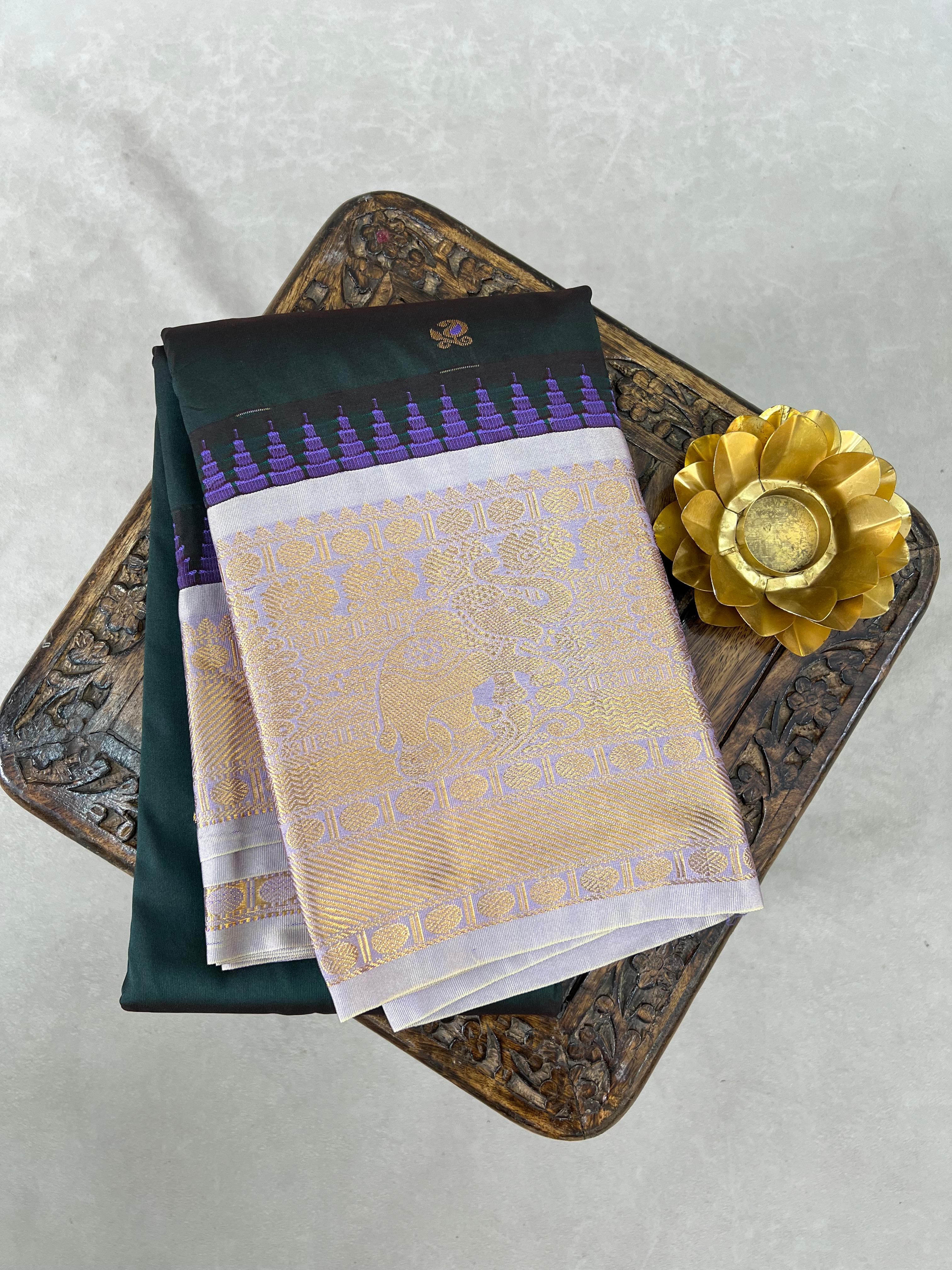This stunning Semi Gadwal Saree features a Olive green body with subtle gold zari meenakari buttas, complemented by Light grey border adorned with intricate gold zari detailing. Blending tradition with elegance, it is perfect for festive occasions and special celebrations, beautifully reflecting the classic charm and craftsmanship of Gadwal weaving. This saree comes with a contrast blouse and is Silk Mark certified.