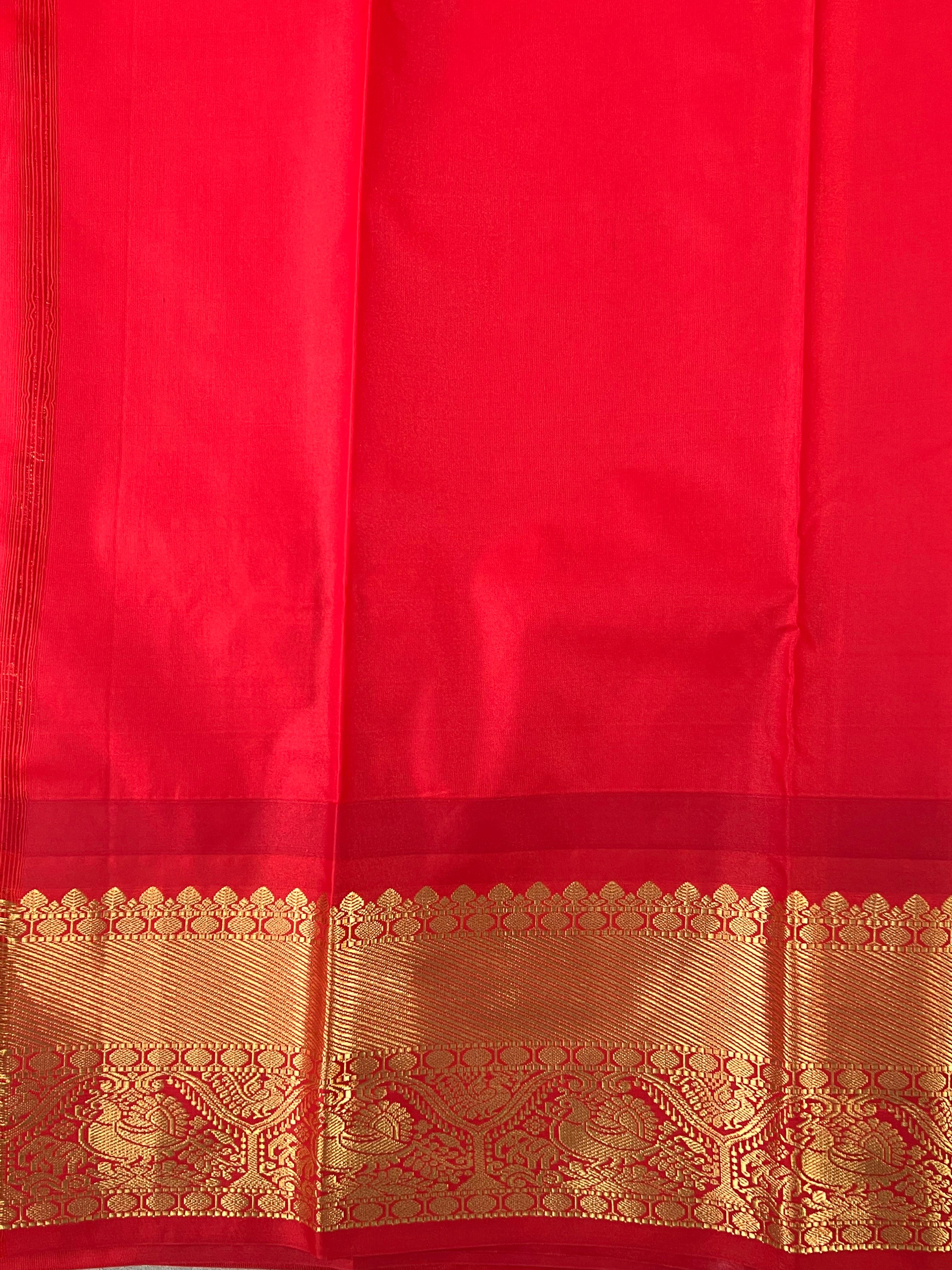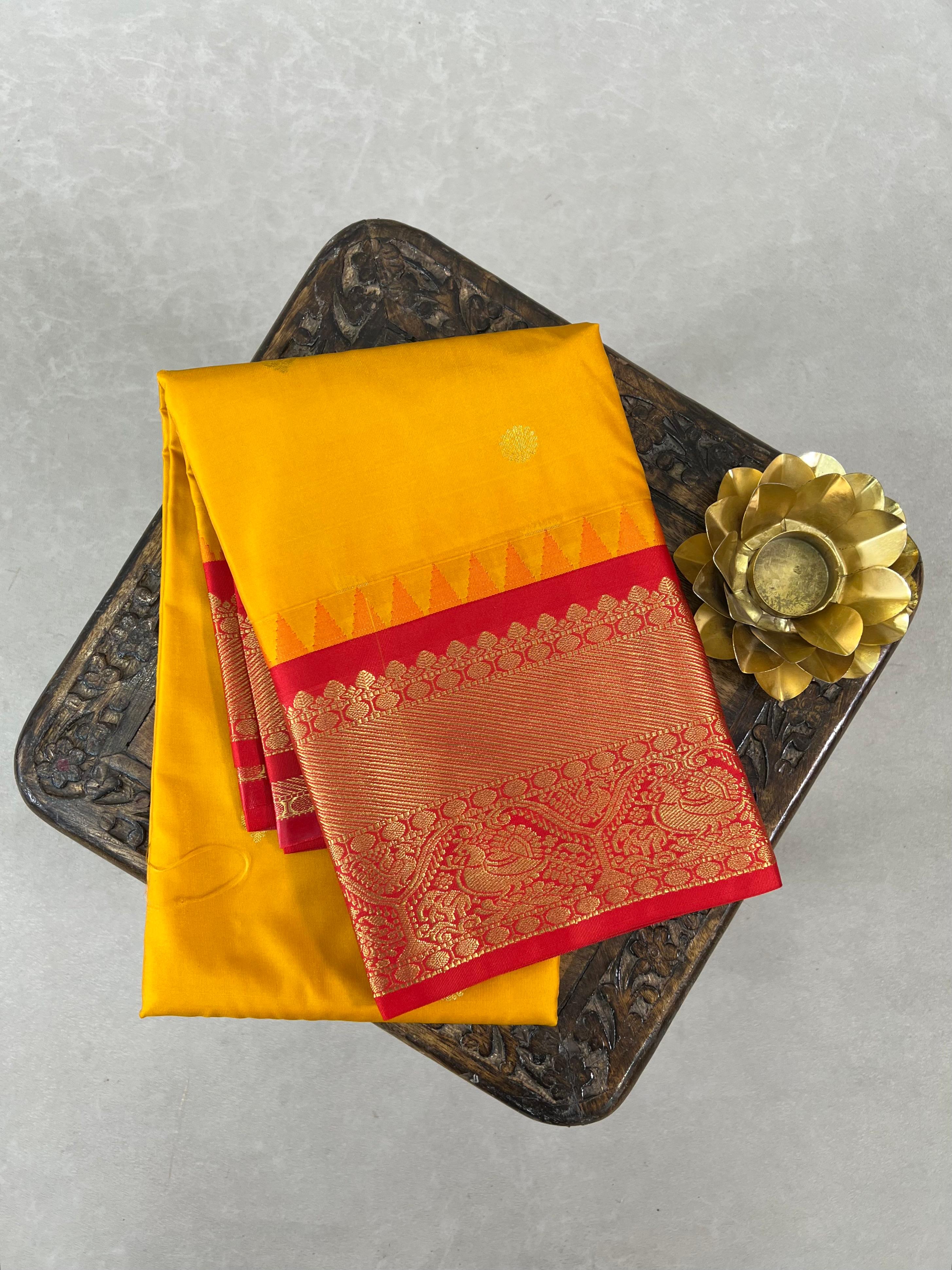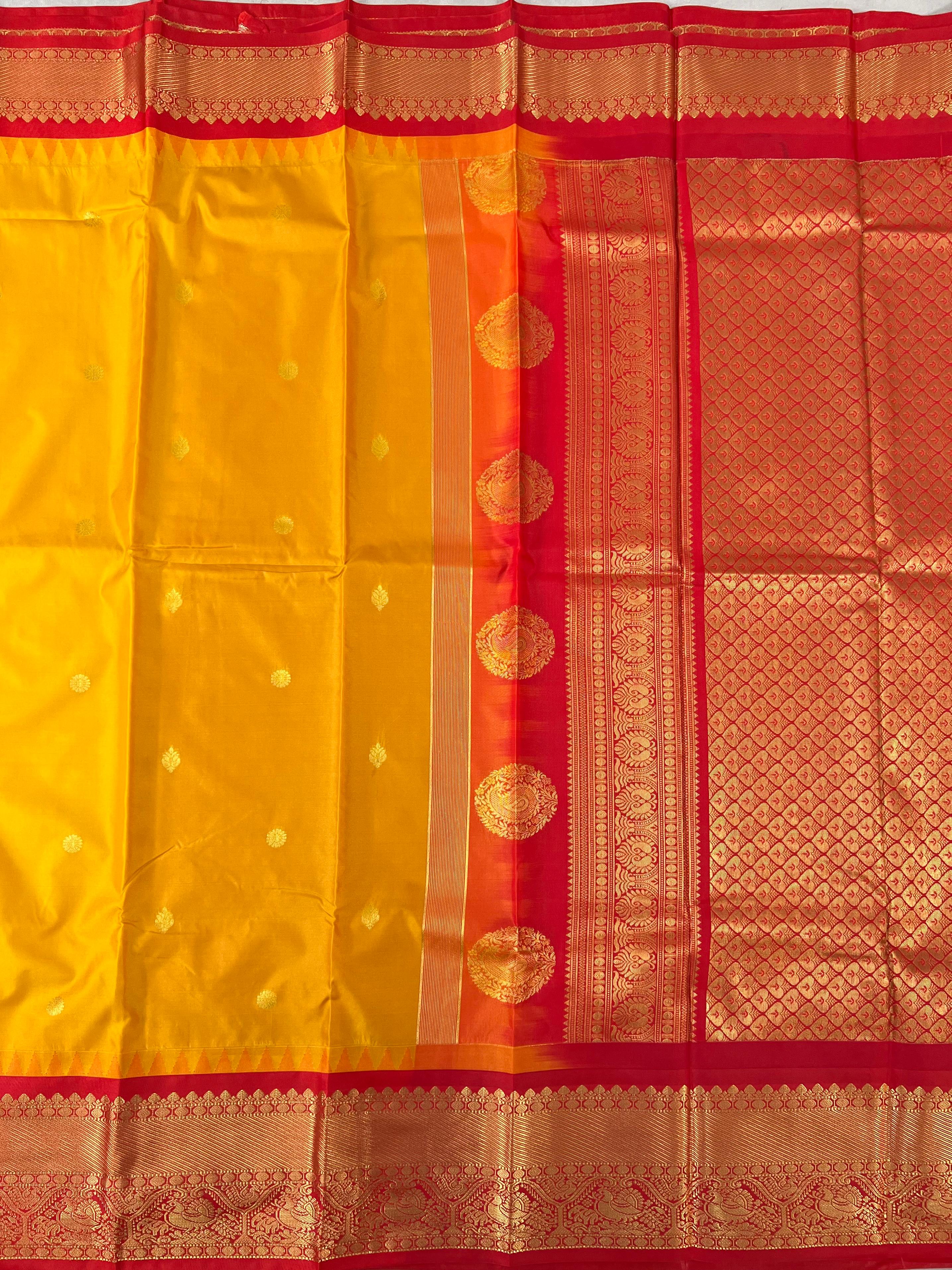 This stunning Semi Gadwal Saree features a Yellow body subtle with Gold zari buttas, complemented by Red border adorned with intricate gold zari detailing. Blending tradition with elegance, it is perfect for festive occasions and special celebrations, beautifully reflecting the classic charm and craftsmanship of Gadwal weaving. This saree comes with a contrast blouse.