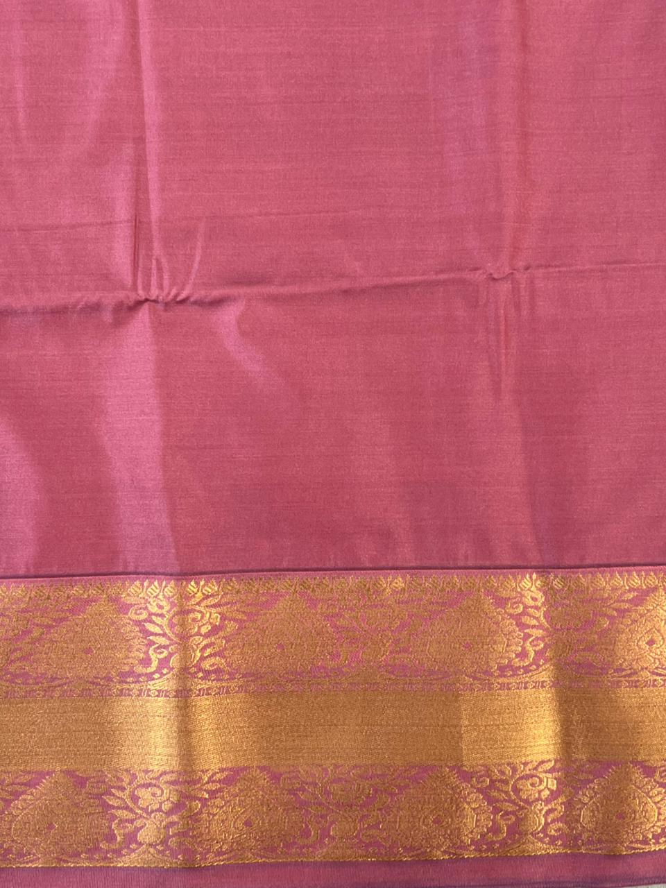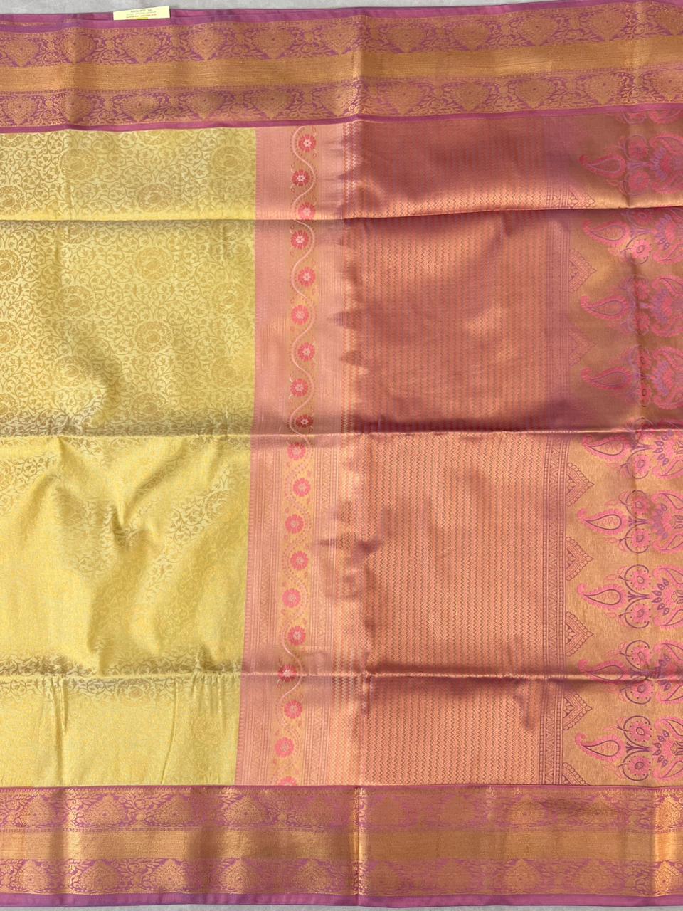 This beautiful Semi Kanchi saree features a refreshing lemon yellow pink woven with elegant gold zari floral patterns, giving it a refined and graceful appeal. The Purple border highlighted with intricate gold zari work inspired by classic Kanchipuram designs. The lustrous zari pallu adds depth and grandeur, making this saree an ideal choice for festive occasions, weddings, and traditional celebrations while remaining lightweight and comfortable to wear. This saree comes with Contrast blouse.