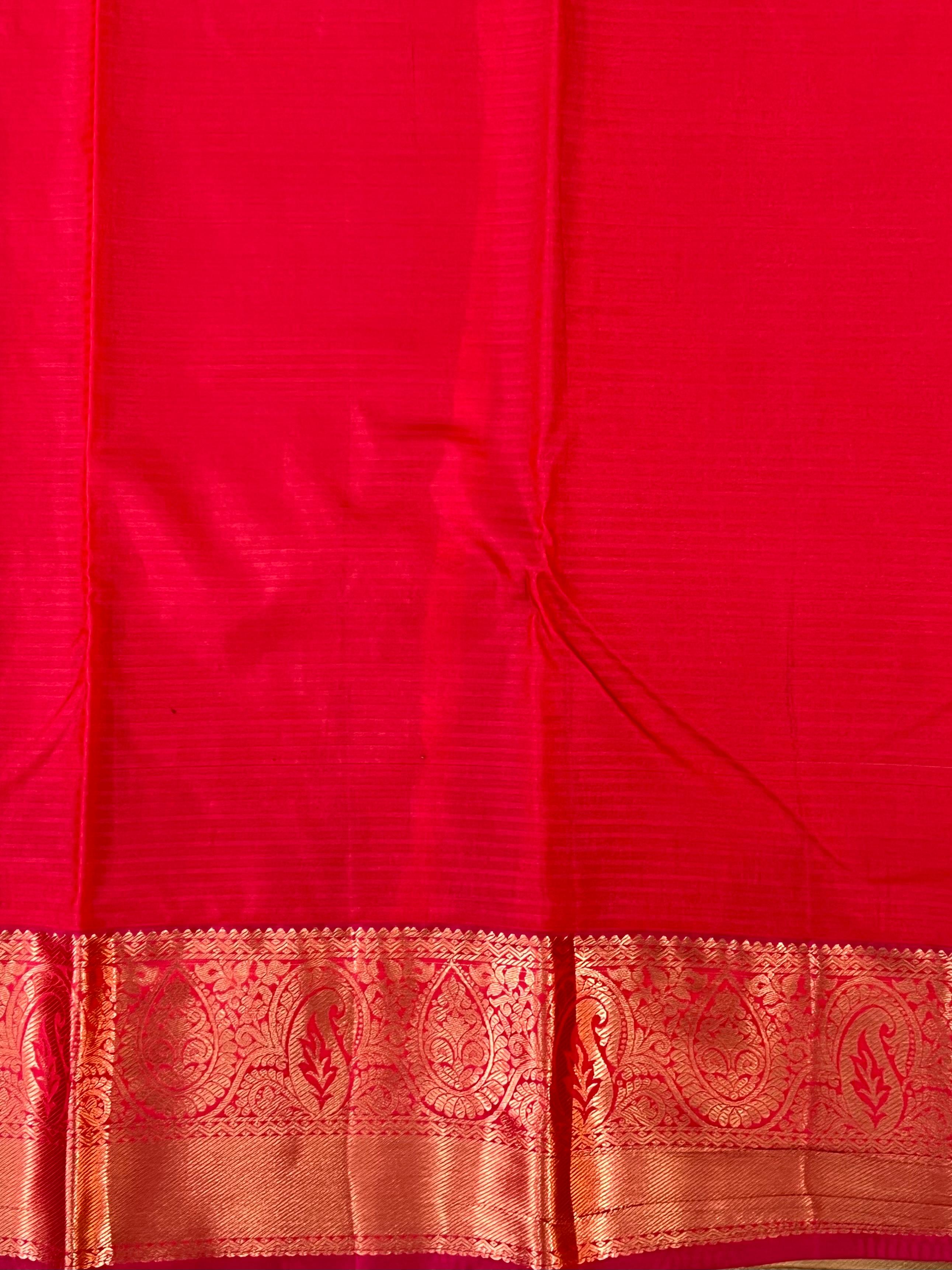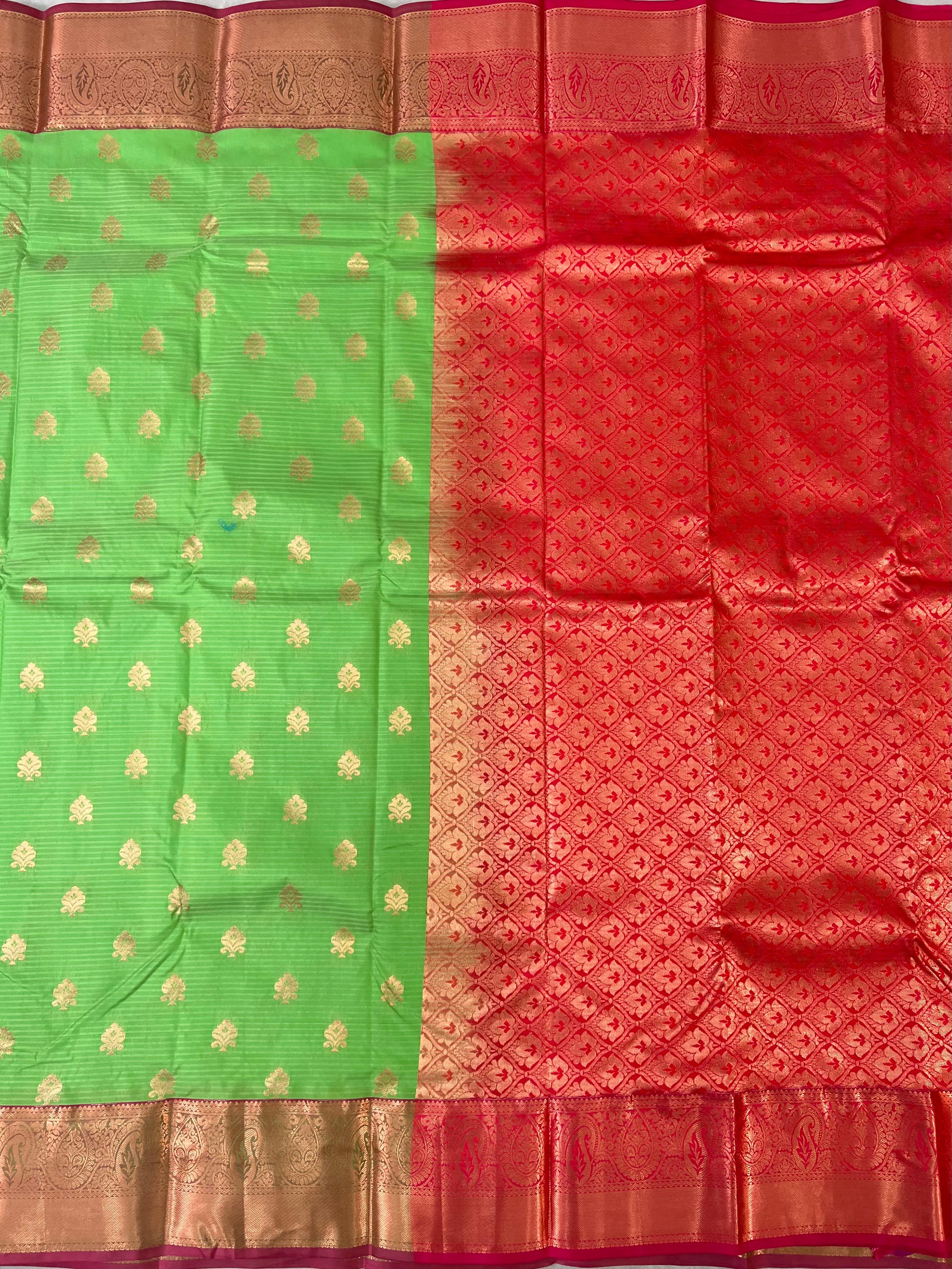 This elegant Semi Kanchipuram Saree features a Parrot green body adorned with gold zari meenakari motifs with stripes, giving it a refined and graceful appeal. The Raspberry red border highlighted with intricate gold zari work and floral motifs inspired by classic Kanchipuram designs. This saree an ideal choice for festive occasions, weddings, and traditional celebrations while remaining lightweight and comfortable to wear. This saree comes with Contrast blouse.