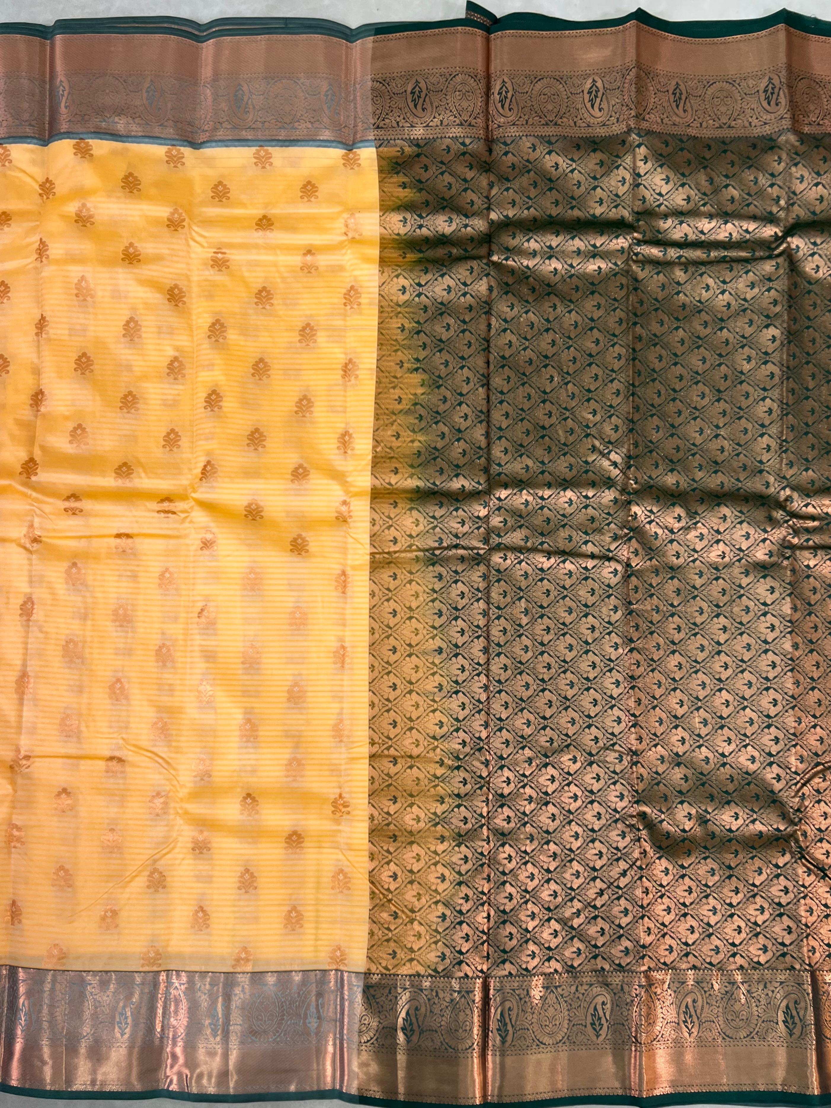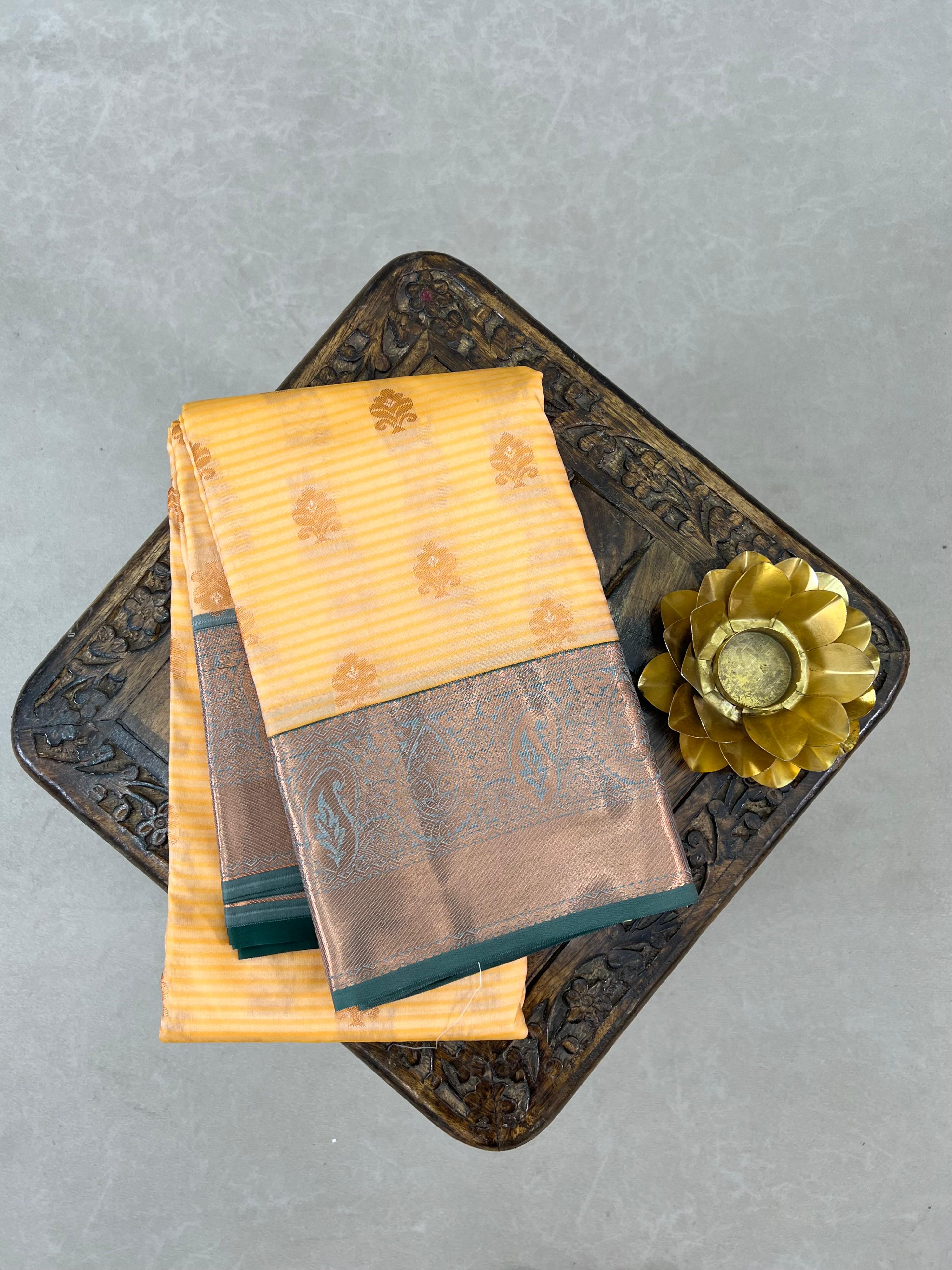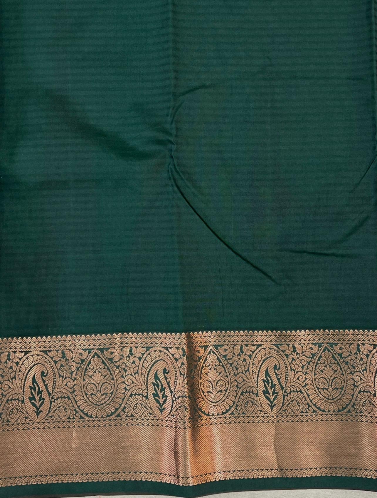 This elegant Semi Kanchipuram Saree features a Peach body adorned with gold zari meenakari motifs with stripes, giving it a refined and graceful appeal. The Bottle green border highlighted with intricate gold zari work and floral motifs inspired by classic Kanchipuram designs. This saree an ideal choice for festive occasions, weddings, and traditional celebrations while remaining lightweight and comfortable to wear. This saree comes with Contrast blouse.