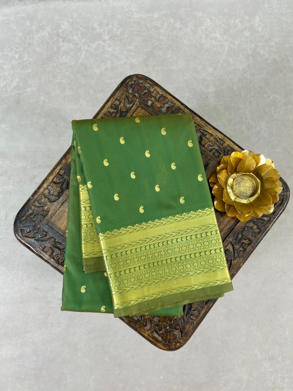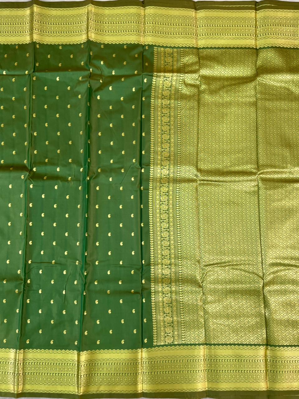 This elegant Semi soft Kanchipuram Saree features a Parrot green body adorned with gold zari motifs, giving it a refined and graceful appeal. The self green border highlighted with intricate gold zari detailing inspired by classic Kanchipuram designs. This saree an ideal choice for festive occasions, weddings, and traditional celebrations while remaining lightweight and comfortable to wear. This saree comes with Self blouse.