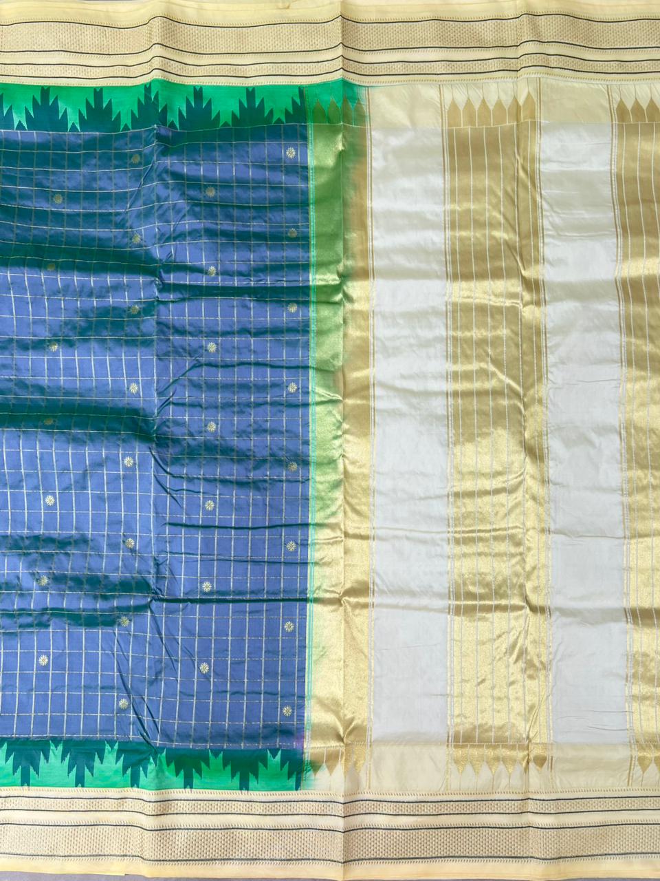 This elegant Semi Narayanpet Saree features a Rama green body adorned with delicate gold zari checks with buttas, exuding timeless charm. The highlight is its traditional cream gold zari border with intricate green stripe weaves, adding a regal contrast and comes with contrast blouse. Perfect for festive occasions and traditional celebrations, this saree beautifully blends heritage craftsmanship with vibrant elegance.