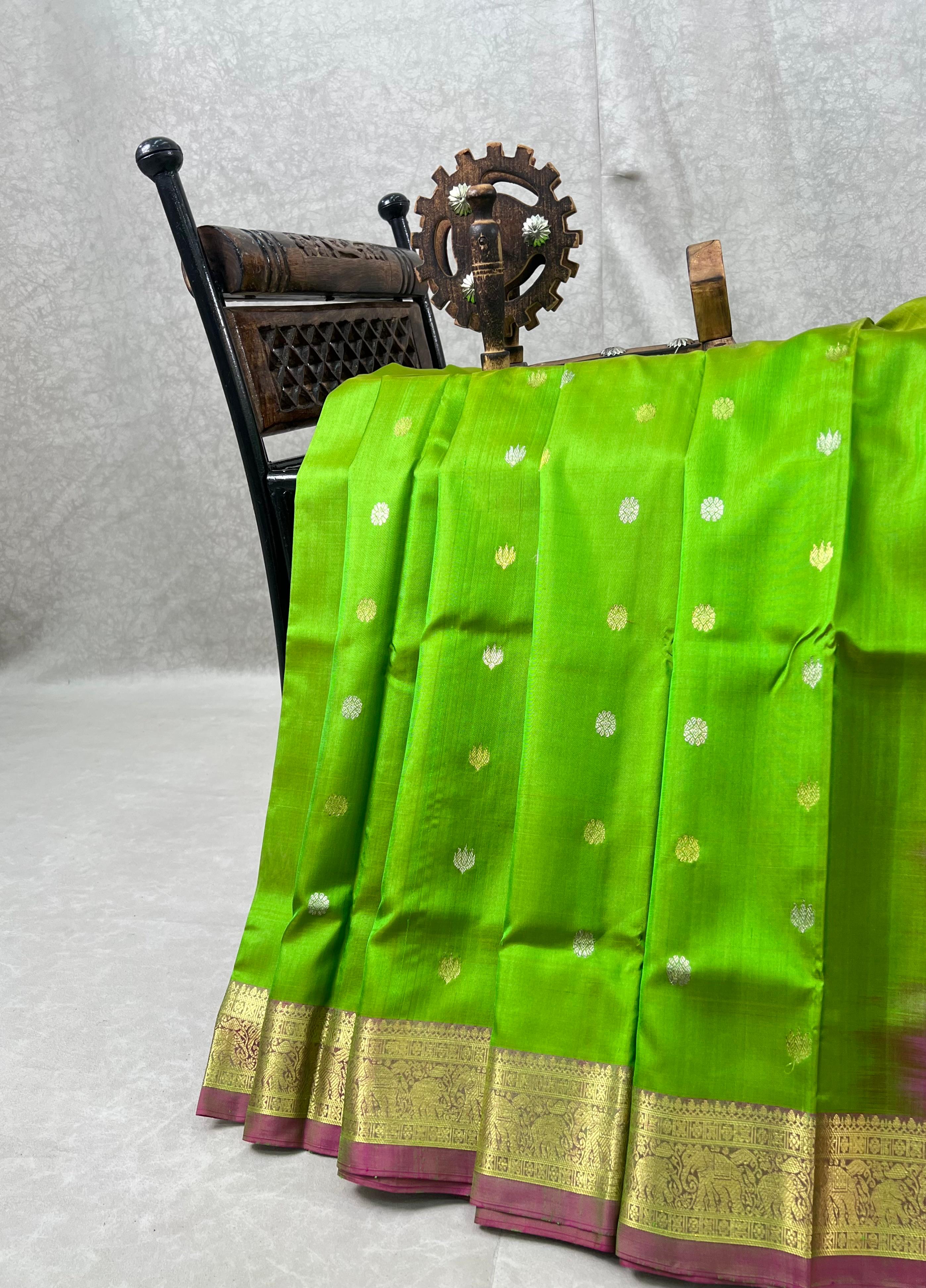 This stunning Venkatagiri Pure Silk Handloom Saree features a Bright green body gracefully adorned with delicate Gold and Silver Motifs, radiating subtle charm. Perfectly complementing the body is a rich Magenta border enhanced with intricate gold zari work, adding a refined traditional appeal. Lightweight, lustrous, and elegant, this saree is ideal for festive occasions, celebrations, and special gatherings, bringing timeless grace to your ethnic wardrobe. It comes with a contrast blouse and is Silk Mark Certified.