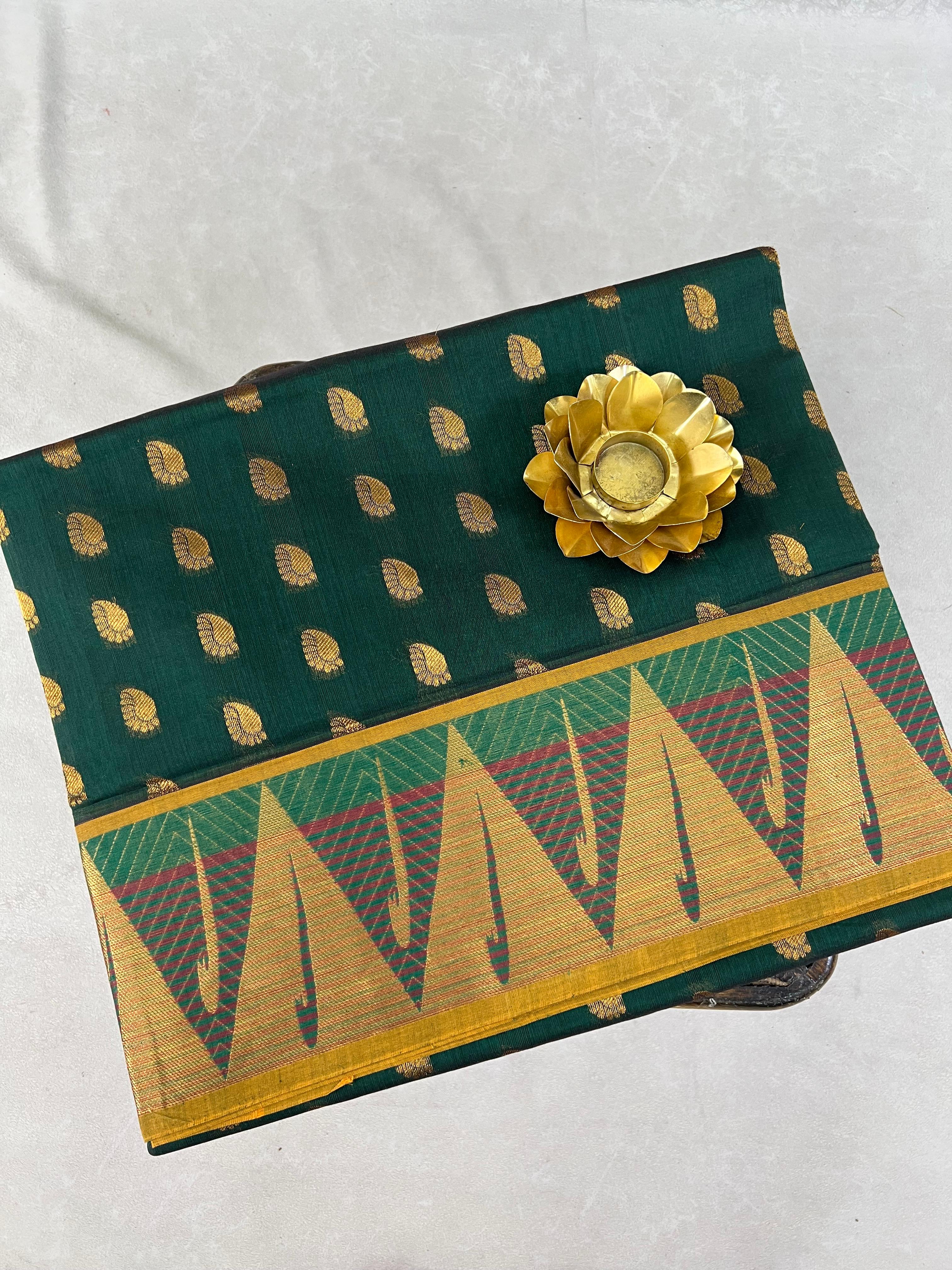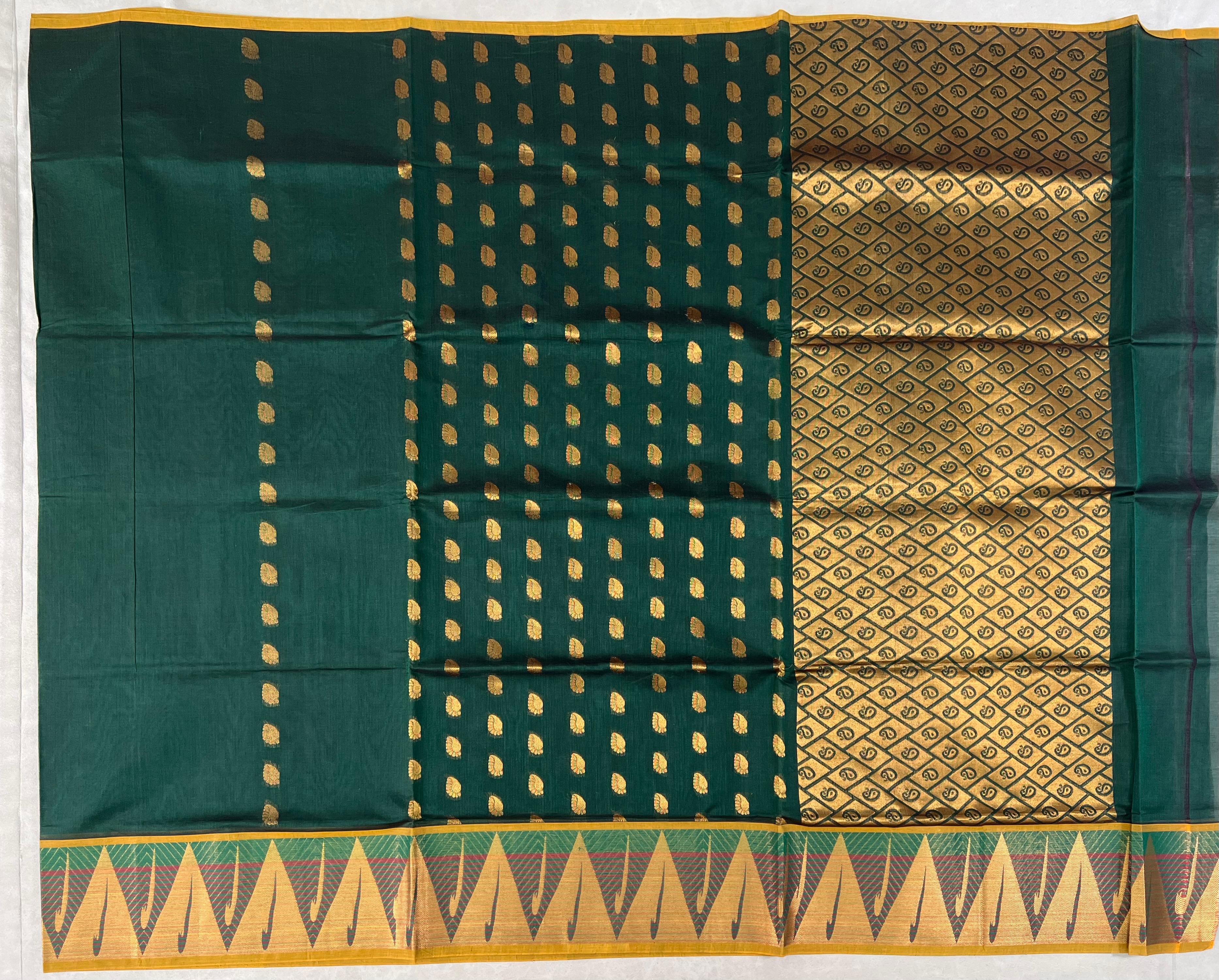 This Venkatagiri Sico Handloom Saree showcases a beautiful and intricate design that highlights the rich craftsmanship of traditional handloom weaving. The saree features a green body adorned with subtle gold motifs, while the border is elegantly decorated with a unique geometric pattern. The fabric's softness and breathability make it an ideal choice for festive occasions, offering both comfort and style. Blouse not included.
