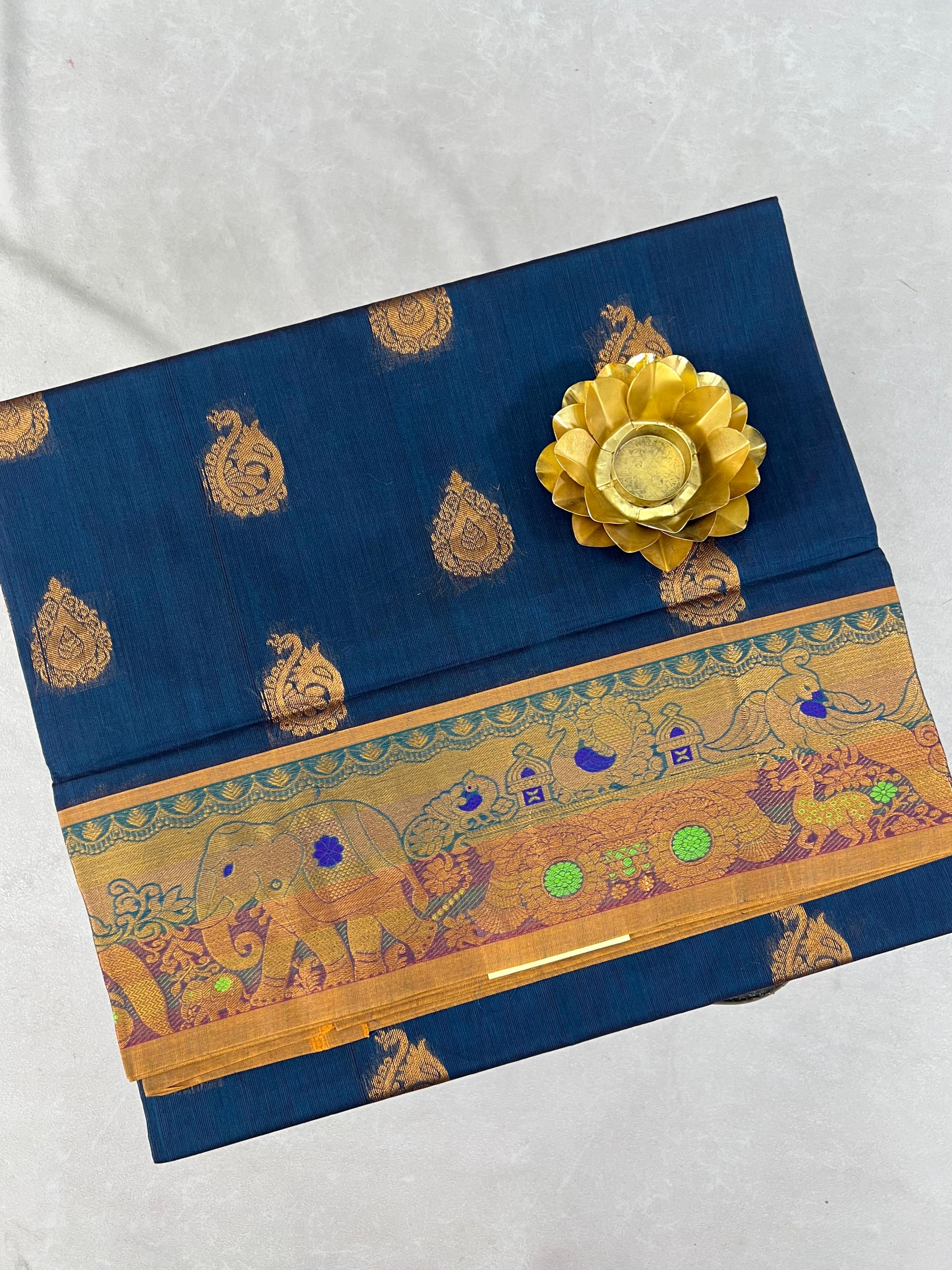 This Venkatagiri Sico Handloom Saree showcases a beautiful and intricate design that highlights the rich craftsmanship of traditional handloom weaving. The saree features a peacock blue body adorned with subtle gold motifs, while the border is elegantly decorated with a mustard and gold zari pattern. The fabric's softness and breathability make it an ideal choice for festive occasions, offering both comfort and style. Blouse not included.
